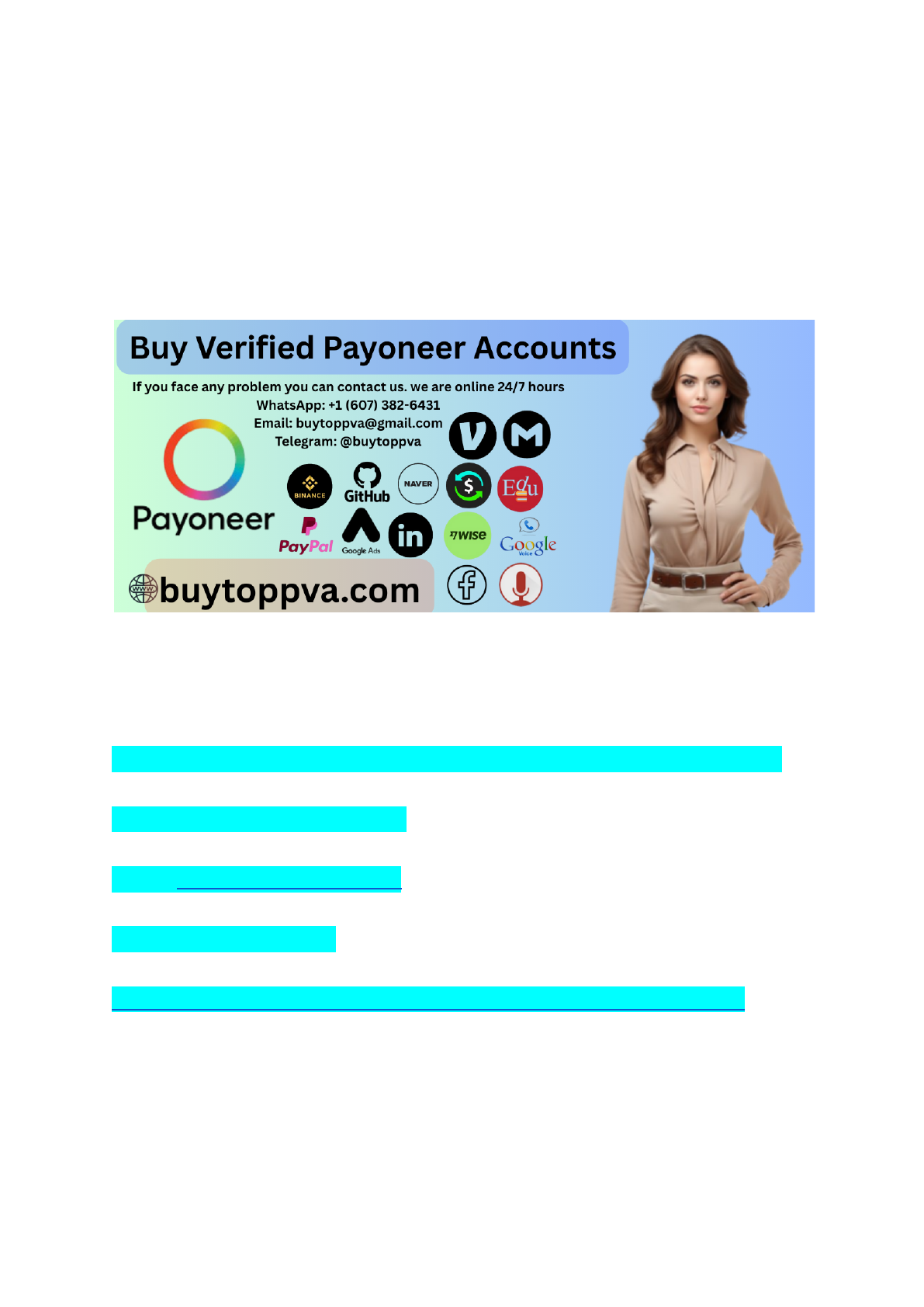 How Does a Payoneer Account Work A Payment ...2025 Are you looking to boost your online business payments with a trusted and reliable solution? Buying verified Payoneer accounts could be the key to unlocking smoother transactions and faster access to your money. Imagine skipping the long verification process and starting right away. You’ll discover why having a verified Payoneer account matters and how it can help you save time and avoid common payment hassles. Keep reading to find out how to get started and what to watch out for! If you face any problem you can contact us. we are online 24/7 hours WhatsApp: +1 (607) 382-6431 Email: buytoppva@gmail.com Telegram: @buytoppva https://buytoppva.com/product/buy-verified-payoneer-accounts/ Benefits Of Verified Payoneer Accounts Verified Payoneer accounts offer many important benefits. They provide a safer and smoother experience for users. These accounts help you manage money with more trust and ease. Choosing a verified account means fewer issues and faster service. mailto:buytoppva@gmail.com https://buytoppva.com/product/buy-verified-payoneer-accounts/ Understanding these benefits helps you decide if a verified Payoneer account fits your needs. Enhanced Security Features Verified Payoneer accounts have strong security checks. They protect your money and personal details. The verification process reduces the risk of fraud. It makes sure only you can use your account. This added security gives peace of mind for every transaction. Faster Transaction Processing Transactions happen faster with verified accounts. Payoneer processes payments smoothly and without delays. Verification removes extra checks during transfers. You send and receive money quickly and reliably. This speed helps with timely payments and business growth. Global Accessibility Verified accounts allow access to many countries. You can receive payments in multiple currencies. Payoneer supports global business without barriers. It helps freelancers and companies reach clients worldwide. This global reach expands your opportunities and income sources. How To Identify Genuine Payoneer Accounts Identifying genuine Payoneer accounts is key before buying. Fake accounts can cause serious problems and loss of money. Being careful helps protect your business and personal data. Genuine accounts show clear signs of verification and trustworthiness. Knowing these signs helps avoid scams. It also ensures smooth transactions and account safety. Verification Markers To Look For Check the account’s verification status first. Genuine Payoneer accounts have full KYC (Know Your Customer) verification. This means the user submitted valid ID and proof of address. Look for a verified badge or mark in the account details. Real accounts often display this on their profile or dashboard. The Payoneer system confirms these badges after strict checks. Review the account history and transaction records. Verified accounts usually have consistent activity. Sudden or unusual transactions can signal fake accounts. Common Scams And How To Avoid Them https://buytoppva.com/product/buy-verified-payoneer-accounts/ Fake sellers may offer accounts at very low prices. Such offers are often traps. Avoid accounts with unclear ownership or no verification proof. Beware of sellers asking for payment outside official platforms. This increases risk of fraud. Always use secure payment methods with buyer protection. Do not trust accounts that promise instant approval or no questions asked. Real Payoneer verification takes time and steps. Skip accounts that seem too easy or fast to verify. Steps To Buy Verified Payoneer Accounts Safely Buying verified Payoneer accounts requires care and smart steps. Safety should be the top priority to avoid scams or frauds. Follow clear steps to make the process smooth and secure. Focus on trusted sellers, safe payments, and a proper transfer process. These steps help protect your money and personal data. If you face any problem you can contact us. we are online 24/7 hours WhatsApp: +1 (607) 382-6431 Email: buytoppva@gmail.com Telegram: @buytoppva https://buytoppva.com/product/buy-verified-payoneer-accounts/ mailto:buytoppva@gmail.com https://buytoppva.com/product/buy-verified-payoneer-accounts/ Choosing Trusted Sellers Start by finding sellers with good reviews and ratings. Check their history and feedback from past buyers. Avoid sellers with little or no reputation. Verified sellers offer real accounts and honest services. Ask questions to confirm their reliability. Trustworthy sellers provide clear information and quick responses. Secure Payment Methods Use payment methods that offer buyer protection. Avoid sending money through untraceable options. Pay with services like PayPal or escrow systems. These methods help recover money if something goes wrong. Never share your bank details or passwords. Secure payments reduce risks and build trust. Account Transfer Process Ensure the seller follows a clear transfer process. The account details must change to your name and email. Request step-by-step guidance during the handover. Confirm full access to the account before completing payment. Keep records of all communications and transactions. A smooth transfer prevents future problems and losses. Use Cases For Verified Payoneer Accounts Verified Payoneer accounts serve many purposes across various industries. These accounts help users send and receive money safely and quickly. They also improve trust and reduce payment delays. Verified accounts open doors to more financial opportunities. Below are key use cases for verified Payoneer accounts. Freelancers And Remote Workers Freelancers use verified Payoneer accounts to receive payments worldwide. These accounts allow easy currency conversion and fast transfers. Remote workers rely on Payoneer to get paid from international clients. Verification helps avoid account holds and ensures smooth payment processing. Small And Medium Businesses Small and
