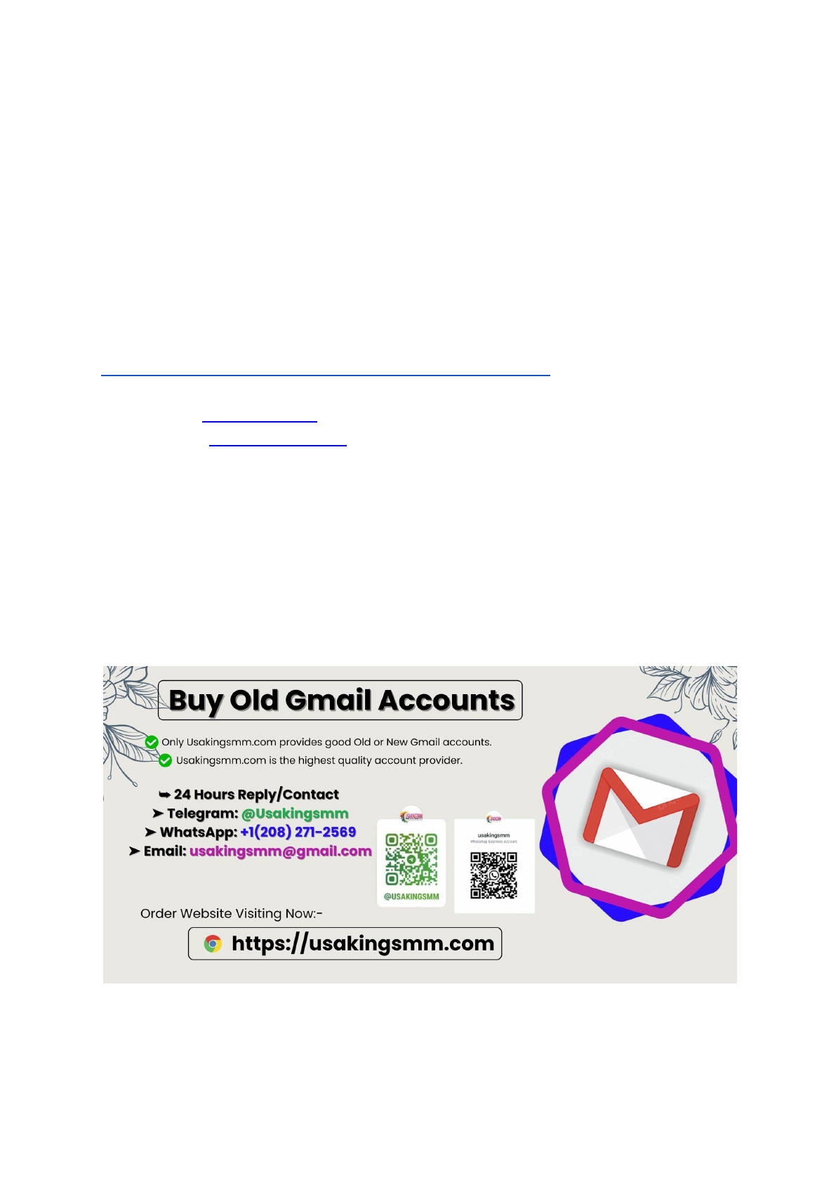 Buy Bulk Old Gmail Accounts – Aged, Verified, and Ready for Use Buying Aged Gmail accounts can be highly beneficial for businesses and individuals looking to strengthen their online presence. These accounts can improve credibility, increase email deliverability, and provide access to a range of Google services. Marketers frequently utilize these accounts for email campaigns, social media promotions, and other digital marketing tactics. Website Visit Now:-Click the link:- https://usakingsmm.com/product/buy-old-gmail-accounts/ ➥ 24 Hours Reply/Contact ➤ Telegram: @Usakingsmm ➤ WhatsApp: +1(208) 271-2569 ➤ Email: usakingsmm@gmail.com It’s essential to confirm the seller’s legitimacy to avoid potential security issues. Purchasing from reliable vendors guarantees you receive genuine accounts that adhere to Google’s policies, helping you reach your marketing objectives more efficiently and effectively. Why Buy Old Gmail Accounts Understanding the advantages of buying old Gmail accounts can be crucial for your business. Old Gmail accounts come with many benefits that can enhance your online presence. Benefits For Marketing https://usakingsmm.com/product/buy-old-gmail-accounts/ https://t.me/Usakingsmm https://wa.me/message/LTVXHCQXS7XGI1?src=qr Aged Gmail accounts can greatly enhance your marketing campaigns. These accounts have established histories, making them more likely to be trusted by email servers. This means your marketing emails have a higher chance of avoiding spam folders. Another benefit is the ability to manage multiple campaigns. With old Gmail accounts, you can efficiently handle different marketing strategies. This can expand your reach and boost your likelihood of success. Old Gmail accounts can also provide valuable insights. By analyzing the past activities of these accounts, you can better understand your target audience. This can help you tailor your marketing messages to be more effective. Increased Trust And Credibility Using old Gmail accounts can enhance your business’s trust and credibility. These accounts come with established reputations, which can be beneficial for your brand. When people see emails from an older account, they are more likely to trust the content. This can lead to higher engagement rates and better relationships with your customers. Aged Gmail accounts are more likely to be recognized by Email Servers, increasing the likelihood that your emails will be successfully delivered and further strengthening your credibility. In conclusion, purchasing old Gmail accounts can be a smart strategy for your business. It can elevate your marketing efforts and bolster your brand’s trustworthiness and reputation. Website Visit Now:-Click the link:- https://usakingsmm.com/product/buy-old-gmail-accounts/ ➥ 24 Hours Reply/Contact ➤ Telegram: @Usakingsmm ➤ WhatsApp: +1(208) 271-2569 ➤ Email: usakingsmm@gmail.com How Old Gmail Accounts Enhance Campaigns Aged Gmail accounts can greatly enhance your marketing strategy. They are valuable assets for email marketing campaigns. These accounts carry trust and authenticity. They often have higher engagement rates. Below, we explore how old Gmail accounts enhance campaigns. Improved Email Deliverability Old Gmail accounts usually have a solid sending history. They have a lower chance of being marked as spam. This helps in reaching the recipient’s inbox directly. Newer accounts often face deliverability issues. So, using older accounts improves your campaign’s success rate. Enhanced Account Security Old Gmail accounts are often more secure. They have a longer history of activity. This reduces the likelihood of them being flagged or suspended. New accounts may appear https://usakingsmm.com/product/buy-old-gmail-accounts/ https://t.me/Usakingsmm https://wa.me/message/LTVXHCQXS7XGI1?src=qr suspicious. Security is vital for preserving trust and credibility.. Using old accounts adds a layer of safety to your campaigns. Selecting The Right Provider Choosing the right provider is essential when purchasing aged Gmail accounts. A good provider ensures you get quality accounts and reliable service. In this section, we will discuss key factors in choosing the right provider. Reputation And Reliability The provider’s reputation matters. Check reviews and ratings from past customers. Look for positive feedback about account quality and service. Avoid providers with negative reviews or complaints about account issues. Please contact us on Telegram or Gmail or What’s app we will try our best to serve you. Customer Support And Service Good customer support is essential. Ensure the provider offers responsive support for any issues. Quick responses to queries show they value customers. Check if they provide 24/7 support. This is important for resolving issues anytime. Consider the provider’s refund policy. A clear policy shows confidence in their service. Be sure to understand the terms before buying. Legal Considerations Purchasing aged Gmail accounts may appear to be a fast fix, but it involves legal risks. Being aware of these risks can help you steer clear of issues. Here are some important factors to consider. Compliance With Regulations First, ensure compliance with all relevant laws. Different countries have different rules. For instance, in the United States, the Computer Fraud and Abuse Act (CFAA) may apply, which makes unauthorized access to accounts illegal. Additionally, the General Data Protection Regulation (GDPR) in Europe safeguards user information. Breaching these regulations could result in fines or imprisonment. Always review local laws before purchasing aged Gmail accounts. Website Visit Now:-Click the link:- https://usakingsmm.com/product/buy-old-gmail-accounts/ ➥ 24 Hours Reply/Contact ➤ Telegram: @Usakingsmm ➤ WhatsApp: +1(208) 271-2569 ➤ Email: usakingsmm@gmail.com Ensuring Account Security Security is a major concern. Bought accounts can have security flaws. These flaws might 