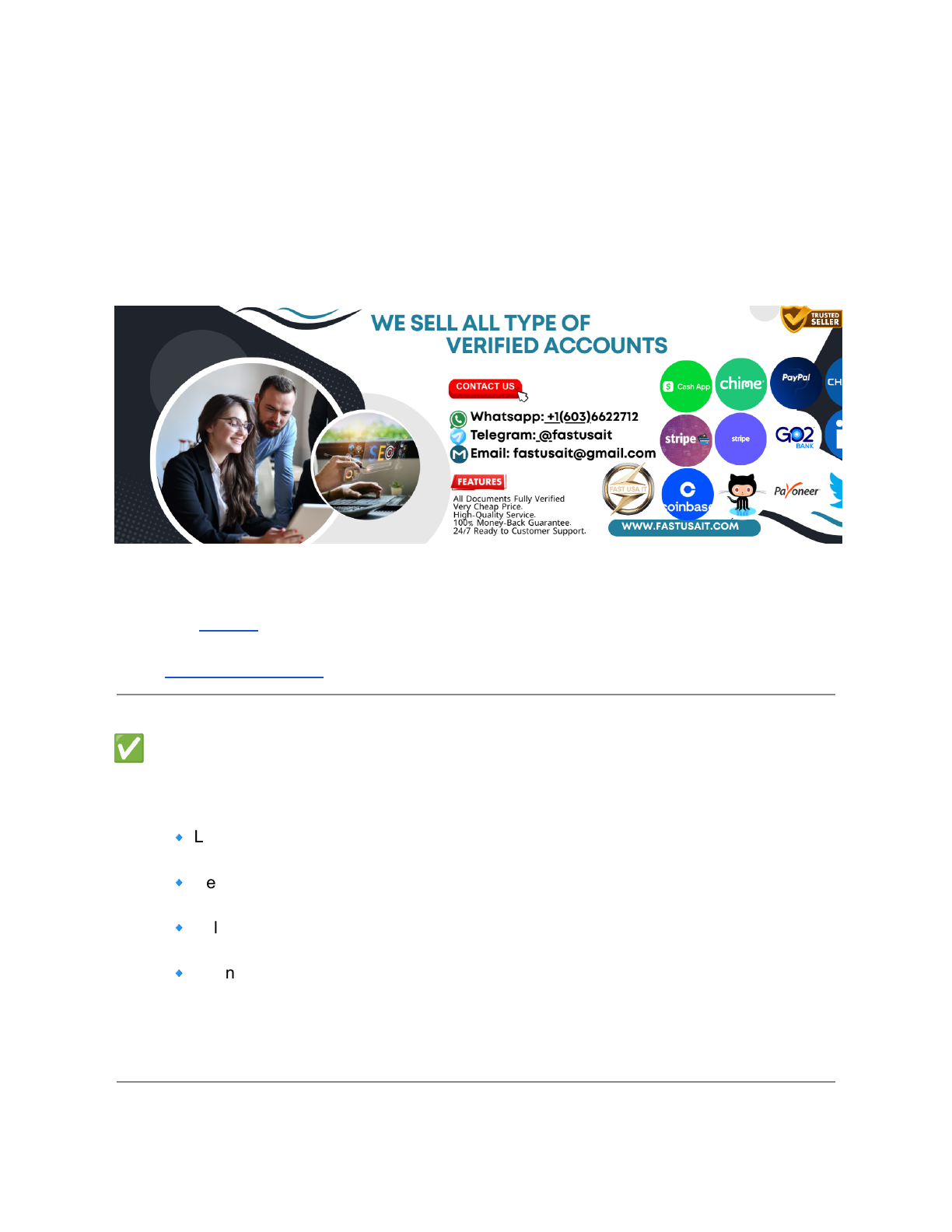 Want to send and receive money instantly across the U.S. without delays or holds? Buy verified Zelle accounts from FastUSAIT.com – your trusted source for fully activated, secure, and ready-to-use Zelle accounts. Whether you're running a business, managing P2P transactions, or need a clean payment option, our Zelle-enabled accounts make money movement smooth and fast — with zero hassle. For Instant Support-Knock US Whatsapp: +1(603)6622712 Telegram: @fastusait Email: fastusait@gmail.com ✅ What Is a Verified Zelle Account? A verified Zelle account is a U.S. bank account that has been: ● 🔹 Linked with a valid phone number and email ● 🔹 Registered with Zelle (via banking app or Zelle app) ● 🔹 Fully set up for sending/receiving instant payments ● 🔹 Connected to major banks (Wells Fargo, Chase, BofA, etc.) This allows real-time money transfers across banks with no processing fees or long waits. http://t.me/13853152958 mailto:fastusait@gmail.com 💼 Who Should Buy Verified Zelle Accounts? Our verified Zelle accounts are ideal for: ● 🔸 Freelancers or digital marketers in unsupported regions ● 🔸 Agencies handling U.S.-based clients ● 🔸 Entrepreneurs managing P2P or B2B payments ● 🔸 Resellers or vendors who want discreet, fast transfers ● 🔸 Crypto P2P traders (Zelle is a popular off-ramp method) For Instant Support-Knock US Whatsapp: +1(603)6622712 Telegram: @fastusait Email: fastusait@gmail.com 🔐 What’s Included in Each Verified Zelle Account Feature Included 🏦 Bank Linked Yes (Wells Fargo / Chase / US Bank / etc.) 📲 Zelle Setup Email + Phone + Zelle Profile Completed 🔓 Full Access Email, bank login, and Zelle credentials 🧑 KYC Completed Identity verification passed 📧 Recovery Info Included for security 🚀 Delivery Time 12–48 hours depending on bank Note: All accounts are created with unique info, clean history, and no usage restrictions. http://t.me/13853152958 mailto:fastusait@gmail.com 💳 Types of Verified Zelle Accounts We Offer 🟢 Basic Zelle Account ● U.S. Bank account with Zelle enabled ● Great for personal transactions 💰 Starting at $XXX 🟠 Business Zelle Account ● Business bank account with Zelle integration ● Higher limits, better trust 💰 Starting at $XXX 🔵 Custom Setup (On Request) ● Choose bank, email, phone type ● Tailored for high-volume users 💰 Contact for pricing ✅ Bulk orders welcome – Get reseller pricing! For Instant Support-Knock US Whatsapp: +1(603)6622712 Telegram: @fastusait Email: fastusait@gmail.com 🛡 Why Choose FastUSAIT? ● ✅ Real U.S. Bank Accounts (no recycled or fake setups) ● ✅ Instant Zelle Activation (no pending status) ● ✅ Fast Delivery (12–48 hours) http://t.me/13853152958 mailto:fastusait@gmail.com ● ✅ 100% Private & Secure Handover ● ✅ Replacements Provided (within warranty period) ● ✅ 24/7 Support Team on Telegram, WhatsApp & Email 📞 Contact Us for Instant Orders & Bulk Deals We’re available 24/7 to assist you: ● 📱 WhatsApp: +1 (603) 662-2712 ● 💬 Telegram: @fastusait ● 📧 Email: fastusait@gmail.com ● 🛒 Buy Now: https://fastusait.com/product/buy-verified-zelle-accounts/ 🔍 FAQs – Buy Verified Zelle Accounts Q1: Can I use these Zelle accounts internationally? Zelle only works within the U.S., but our accounts are perfect for those outside the U.S. who want to manage U.S. transactions. Q2: Can I change the login or bank info? Yes, full access is provided. You can update passwords, emails, and recovery options. Q3: What banks do you support? We offer accounts with major U.S. banks like Chase, Wells Fargo, US Bank, Bank of America, etc. Q4: What’s the delivery time? Most Zelle accounts are delivered within 12–48 hours, depending on customization. Q5: Are these safe to use? Yes, all accounts are KYC-verified, clean, and delivered securely. Just follow standard best practices. ✅ Start Sending & Receiving Payments Today Forget delays, blocked transactions, or KYC issues. Get your verified Zelle account now from FastUSAIT and start moving money instantly. 👉 Buy Now on FastUSAIT.com For Instant Support-Knock US Whatsapp: +1(603)6622712 Telegram: @fastusait Email: fastusait@gmail.com http://t.me/13853152958 mailto:fastusait@gmail.com ✅ What Is a Verified Zelle Account? 💼 Who Should Buy Verified Zelle Accounts? 🔐 What’s Included in Each Verified Zelle Account 💳 Types of Verified Zelle Accounts We Offer 🟢 Basic Zelle Account 🟠 Business Zelle Account 🔵 Custom Setup (On Request) 🛡️ Why Choose FastUSAIT? 📞 Contact Us for Instant Orders & Bulk Deals 🔍 FAQs – Buy Verified Zelle Accounts ✅ Start Sending & Receiving Payments Today