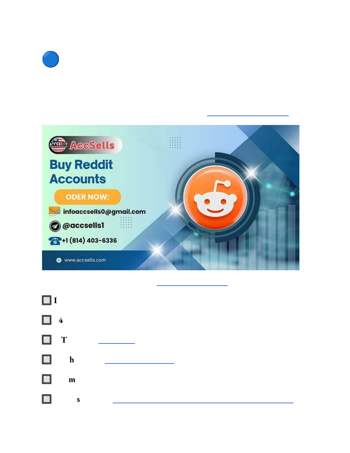 🔵 How to Find and Buy Quality Reddit Accounts Reddit is a vast platform where users share content, engage in discussions, and build communities. One of the key metrics that measure a user’s influence on Reddit is Karma. Want to know the most reliable source for buying Reddit Accounts? 🔲 If You want to more information just contact now 🔲 24 Hours Reply/ Contact : – 🔲 ⇅ Telegram: @accsells1 🔲 ⇅ WhatsApp: +1 (814) 403–6336 🔲 ⇅ E-mail: infoaccsells0@gmail.com 🔲 ⇅ Website Visit: https://accsells.com/product/buy-reddit-accounts/ https://accsells.com/product/buy-reddit-accounts/ https://accsells.com/product/buy-reddit-accounts/ https://t.me/accsells1 https://api.whatsapp.com/send?phone=18144036336 https://accsells.com/product/buy-reddit-accounts/ For businesses and individuals looking to leverage Reddit for marketing, buying Reddit accounts with high Karma can be a strategic move. This post delves into various aspects of buying Reddit Karma accounts, including benefits, risks, and best practices. What is Reddit Karma? Reddit Karma is a score that reflects a user’s contributions to the platform. It is earned through upvotes on posts and comments. Higher Karma indicates a more reputable and active user. Karma is divided into post Karma and comment Karma. Post Karma is earned when users upvote your posts, while comment Karma comes from upvotes on your comments. Both types of Karma contribute to your overall score. Benefits of Buying Reddit Karma Accounts Buying Reddit Karma accounts can provide several advantages. It can give you an instant boost in credibility. High Karma accounts are often perceived as more trustworthy. For businesses, it can enhance marketing efforts. A high Karma account can help in promoting products or services more effectively. It can also increase engagement and visibility. https://accsells.com/product/buy-reddit-accounts/ How to Choose a Reliable Seller Choosing a reliable seller is crucial. Look for trusted Reddit account providers. Check reviews and testimonials. Ensure the seller offers verified Reddit accounts. PVA Reddit accounts (phone-verified accounts) are more secure. Verify the account’s history and activity. Risks Involved There are risks involved in purchasing Karma accounts. One major risk is getting scammed. Always buy from verified Reddit accounts sellers. Another risk is account suspension. Reddit has strict policies against buying and selling accounts. Violating these can lead to bans. Legal Implications Buying Reddit accounts can have legal implications. Reddit’s terms of service prohibit account resale. Violating these terms can result in legal action. It’s important to understand the legal risks. Consult with a legal expert if necessary. Ensure you are aware of all potential consequences. How to Verify the Authenticity of a Karma Account Verifying the authenticity of a Karma account is essential. Check the account’s activity history. Look for consistent engagement. Verify the account’s Karma score. Ensure it matches the seller’s claims. Use tools to check for fake engagement. Pricing The pricing of Reddit Karma accounts varies. Factors include the amount of Karma and account age. Established Reddit accounts with high Karma are more expensive. Compare prices from different sellers. Look for competitive rates. Ensure you get value for your money. How to Transfer Ownership of a Reddit Account Transferring ownership of a Reddit account involves several steps. First, change the account’s email address. Ensure the new owner has access. Next, update the password. Make sure the new owner can log in. Finally, transfer any linked services or subscriptions. Best Practices for Using Purchased Karma Accounts Using purchased Karma accounts requires best practices. First, avoid suspicious activity. Reddit monitors for unusual behavior. Engage genuinely with the community. Post relevant content. Avoid spamming or excessive self-promotion. How to Avoid Getting Banned on Reddit Avoiding a ban on Reddit is crucial. Follow Reddit’s rules and guidelines. Avoid buying Reddit bot accounts. Engage in meaningful discussions is important on Reddit. Avoid controversial topics. Report any suspicious activity to Reddit admins. Alternatives to Buying Reddit Karma Accounts There are alternatives to buying Reddit Karma accounts. One option is Reddit Karma farming. This involves earning Karma organically. Another option is using Reddit marketing services. These services can help boost engagement. They can also assist in growing your account. How to Increase Karma Organically Increasing Karma organically is possible. Post high-quality content. Engage with popular subreddits. Comment on trending posts. Provide valuable insights. Avoid spamming or low-effort posts. Common Scams in the Reddit Karma Market The Reddit Karma market has common scams. One scam is selling fake accounts. These accounts have artificially inflated Karma. Another scam is account hacking. Scammers may steal your account. Always buy from trusted Reddit account providers. How to Maintain Anonymity When Buying Accounts Maintaining anonymity when buying accounts is important. Use a secure payment method. Avoid sharing personal information. Use a VPN for added security. Ensure your transactions are private. Protect your identity at all costs When you buy a Reddit Account with Karma, the value of the Reddit Account is dictated by its Age and the amount of Karma it has. Below we will explain what this means and why it matters. Age — This is the most straightforward statistic that we look at. The older a Reddit Account is, the more valuable it becomes. Karma — Karma is the equivalent of likes/dislikes that you see on many other social media platforms. Karma is basically the sum of upvotes and downvotes that a Reddit Account has received. The thing that makes Reddit unique is that Reddit differientiates between Karma you received on Posts/Submissions and Comments, call