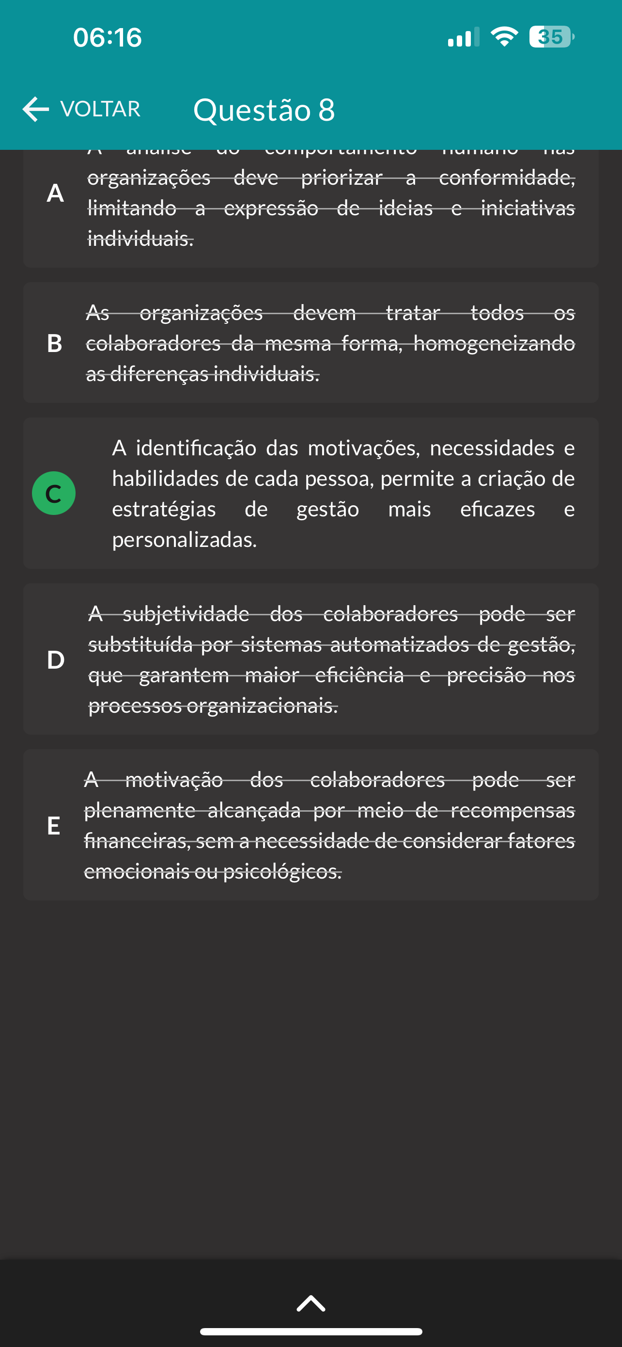 06:16 35 VOLTAR Questão 8 comportamento organizações deve priorizar a conformidade, A limitando a expressão de ideias e iniciativas individuais. As organizações devem tratar todos os B colaboradores da mesma forma, homogeneizando as diferenças individuais. A identificação das motivações, necessidades e habilidades de cada pessoa, permite a criação de estratégias de gestão mais eficazes e personalizadas. A subjetividade dos colaboradores pode ser substituída por sistemas automatizados de gestão, D que garantem maior eficiência e precisão nos processos organizacionais. A motivação dos colaboradores pode ser plenamente alcançada por meio de recompensas E financeiras, sem a necessidade de considerar fatores emocionais ou psicológicos.