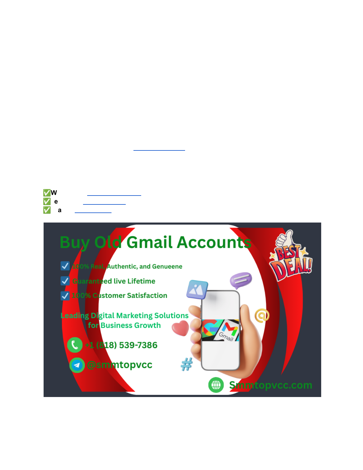 Best Places to Buy Old Gmail Accounts Online In the fast-paced world of digital marketing, leveraging reliable email accounts can make a significant difference in campaign success. One growing trend among marketers and affiliate professionals is purchasing old Gmail accounts. These accounts offer better deliverability, enhanced credibility, and smoother automation workflows. However, the key to benefiting from old Gmail accounts lies in knowing where to find them. This guide explores the best places to buy old Gmail accounts online, helping marketers make informed decisions while avoiding pitfalls. If you want to know more info, please contact us- ✅WhatsApp: +1 (818) 539-7386 ✅Telegram: @smmtopvcc ✅Teams: smmtopvcc Why Old Gmail Accounts Matter for Marketing https://smmtopvcc.com/product/buy-old-gmail-accounts/ https://wa.me/18185397386 https://telegram.me/smmtopvcc https://teams.live.com/l/invite/FEAGzJUnmW2074H2gE Old Gmail accounts carry inherent advantages that new accounts cannot easily replicate. The age of an account often signals credibility and trustworthiness to email providers. Gmail evaluates factors such as account age, sending history, and engagement patterns when determining whether messages should land in the inbox or the spam folder. Accounts that have been active for several years are less likely to be flagged as suspicious, ensuring higher deliverability for marketing campaigns. Marketers also benefit from old accounts in automation workflows. Email automation tools require consistent account behavior to maintain smooth campaign execution. Older Gmail accounts with established activity histories are less prone to restrictions, allowing marketers to run campaigns efficiently. Moreover, these accounts can support affiliate marketing, outreach campaigns, and testing new email strategies without jeopardizing the integrity of primary business accounts. Legal and Ethical Considerations Purchasing old Gmail accounts must always be approached responsibly. While acquiring accounts for marketing purposes is not illegal, it becomes problematic if accounts are compromised or involve unauthorized access to personal information. Marketers should adhere to Google’s terms of service and ensure that purchased accounts are legitimate and secure. Buying from reputable sources minimizes legal risks and protects campaign performance. Transparent sellers provide information about account history, age, and status, ensuring buyers understand exactly what they are acquiring. Avoiding shortcuts such as hacking or circumventing security protocols is crucial, as these actions can lead to account suspension, campaign failure, or legal repercussions. Trusted Marketplaces for Old Gmail Accounts Several online marketplaces specialize in selling Gmail accounts, but reliability and trustworthiness vary. Established platforms often have verified reviews, secure payment systems, and seller guarantees. Purchasing from these sources reduces the likelihood of receiving compromised or low-quality accounts. A good marketplace provides clear details about each account, including age, activity history, recovery options, and associated risks. Some platforms even offer premium accounts with verified phone numbers or years of consistent usage, which can be particularly valuable for marketers who rely heavily on email outreach. Establishing a relationship with a trusted seller also ensures access to better accounts and ongoing support. Forums and Community Platforms https://smmtopvcc.com/product/buy-old-gmail-accounts/ Beyond formal marketplaces, some marketers find old Gmail accounts through forums and community platforms. These online communities often facilitate peer-to-peer transactions, where experienced marketers share insights, recommendations, and verified account listings. If you want to know more info, please contact us- ✅WhatsApp: +1 (818) 539-7386 ✅Telegram: @smmtopvcc ✅Teams: smmtopvcc While forums can be valuable, they require careful scrutiny. Reputation matters, and verifying the credibility of sellers is essential. Reading reviews, asking for proof of account authenticity, and confirming recovery options can help avoid potential scams. Community-driven platforms often provide accounts at competitive prices, but the trade-off is a higher responsibility on the buyer to ensure account legitimacy. Social Media Channels Social media platforms can also serve as sources for old Gmail accounts. Marketers occasionally promote accounts for sale through Facebook groups, LinkedIn communities, or Twitter networks. These channels provide direct communication with sellers, making it easier to ask questions, request screenshots, or clarify account details before purchase. Caution is vital when using social media. Accounts offered without verification or seller reputation can pose risks, including compromised credentials or account suspension. Engaging with established communities, checking member feedback, and verifying the authenticity of each listing are essential steps to mitigate these risks. Specialized Email Account Vendors Certain vendors specialize exclusively in selling aged Gmail accounts. These providers cater to marketers, offering accounts with specific characteristics, such as multiple years of activity, verified recovery options, and clean reputations. Purchasing from specialized vendors often involves higher costs but comes with added security and reliability. Specialized vendors typically guarantee account access, provide detailed activity logs, and offer post-purchase support. This level of service is beneficial for marketers who require consistent performance, as it minimizes the risk of disruptions caused by suspended or restricted accounts. For large-scale campaigns, investing in specialized vendors can be more cost-effective in the long run due to reduced account management challenges. Evaluating Account Quality https://wa.me/18185397386 https://telegram.me/smmtopvcc https://tea