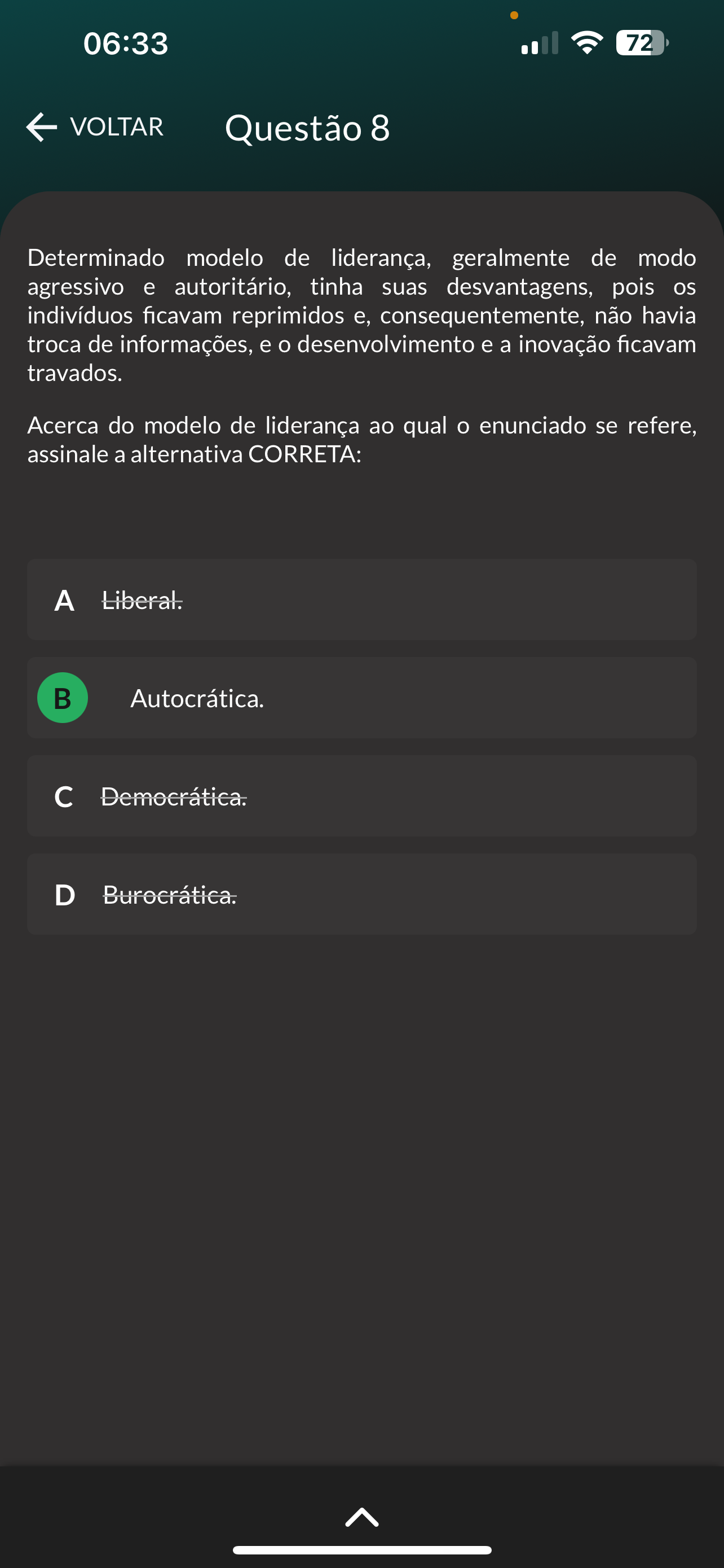 06:33 72 VOLTAR Questão 8 Determinado modelo de liderança, geralmente de modo agressivo e autoritário, tinha suas desvantagens, pois os indivíduos ficavam reprimidos e, consequentemente, não havia troca de informações, e desenvolvimento e a inovação ficavam travados. Acerca do modelo de liderança ao qual enunciado se refere, assinale a alternativa CORRETA: A Liberal. Autocrática. c Democrática. D Burocrática.