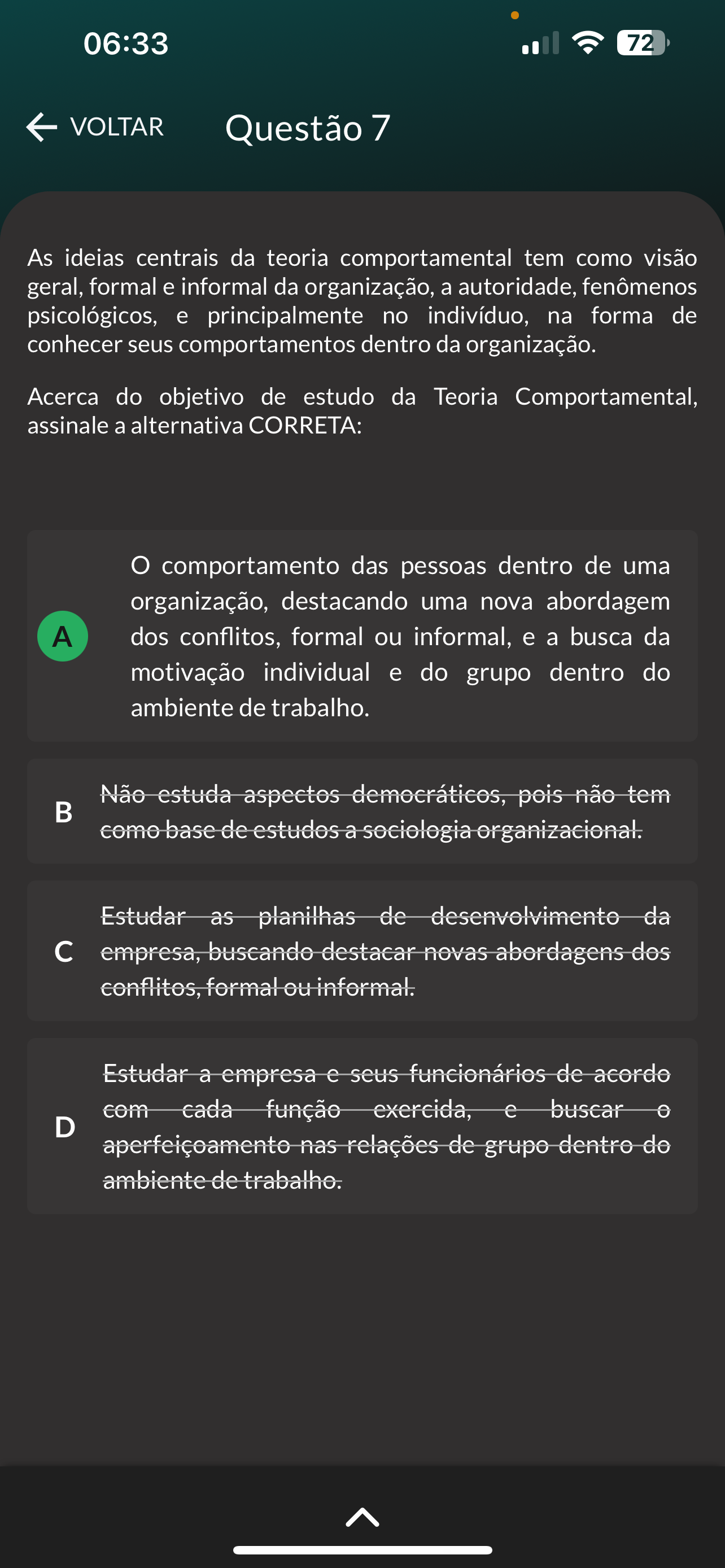 06:33 72 VOLTAR Questão 7 As ideias centrais da teoria comportamental tem como visão geral, formal e informal da organização, a autoridade, fenômenos psicológicos, e principalmente no indivíduo, na forma de conhecer seus comportamentos dentro da organização. Acerca do objetivo de estudo da Teoria Comportamental, assinale a alternativa CORRETA: comportamento das pessoas dentro de uma organização, destacando uma nova abordagem A dos conflitos, formal ou informal, e a busca da motivação individual e do grupo dentro do ambiente de trabalho. Não estuda aspectos democráticos, pois não tem como base de estudos a sociologia organizacional. Estudar as planilhas de desenvolvimento da c empresa, buscando destacar novas abordagens dos conflitos, formal ou informal. Estudar a empresa e seus funcionários de acordo com cada função exercida, e buscar D aperfeiçoamento nas relações de grupo dentro do ambiente de trabalho.