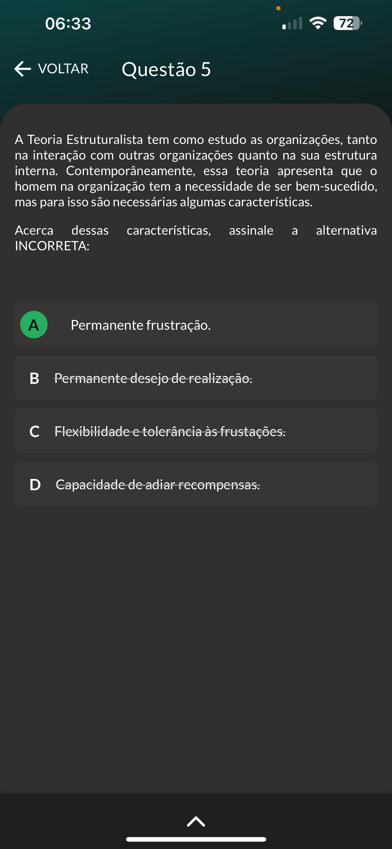 06:33 72 VOLTAR Questão 5 A Teoria Estruturalista tem como estudo as organizações, tanto na interação com outras organizações quanto na sua estrutura interna. Contemporâneamente, essa teoria apresenta que homem na organização tem a necessidade de ser bem-sucedido, mas para isso são necessárias algumas características. Acerca dessas características, assinale a alternativa INCORRETA: A Permanente frustração. Permanente desejo de realização. c Flexibilidade e tolerância às frustações. D Capacidade de adiar recompensas.