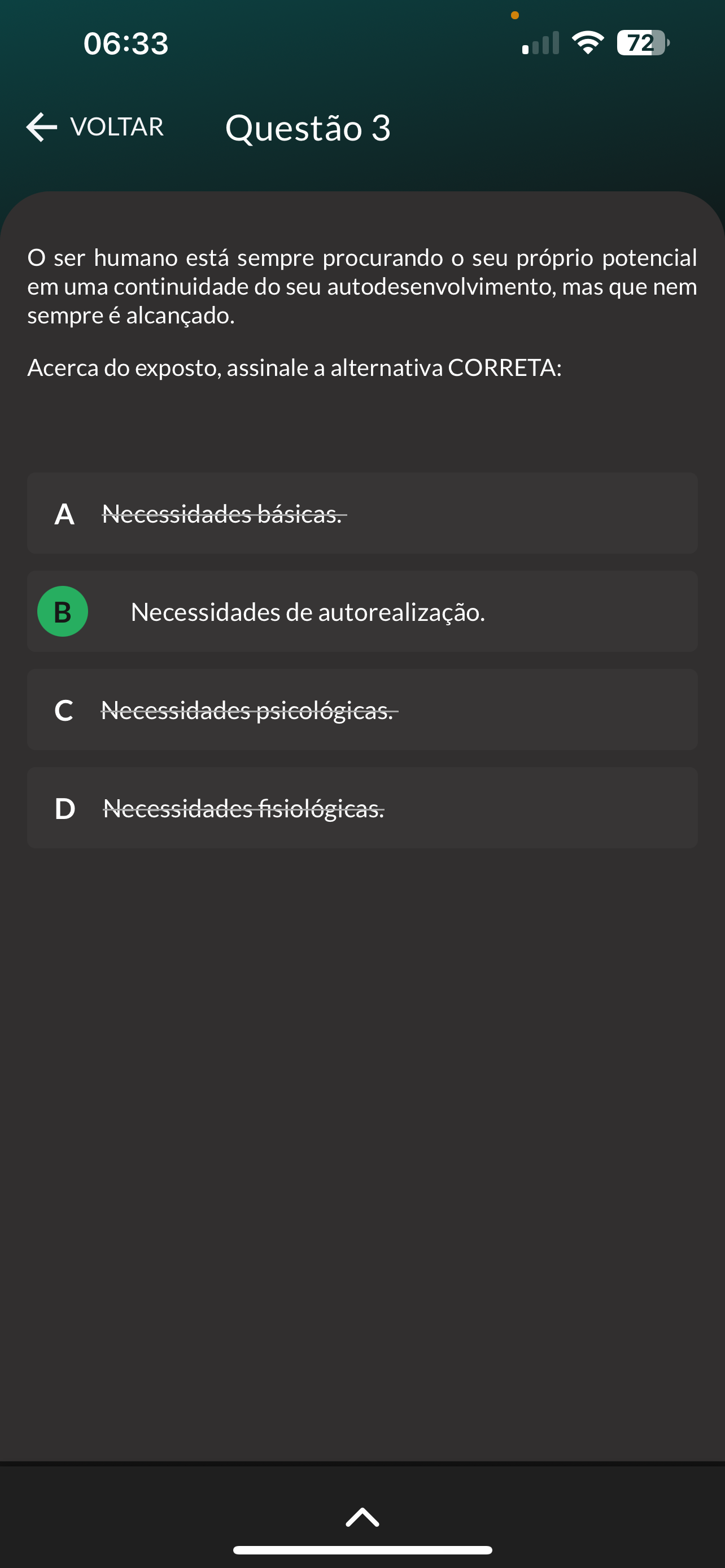 06:33 72 VOLTAR Questão 3 ser humano está sempre procurando seu próprio potencial em uma continuidade do seu autodesenvolvimento mas que nem sempre é alcançado. Acerca do exposto, assinale a alternativa CORRETA: A Necessidades básicas. B Necessidades de autorealização. c Necessidades psicológicas. D Necessidades fisiológicas.