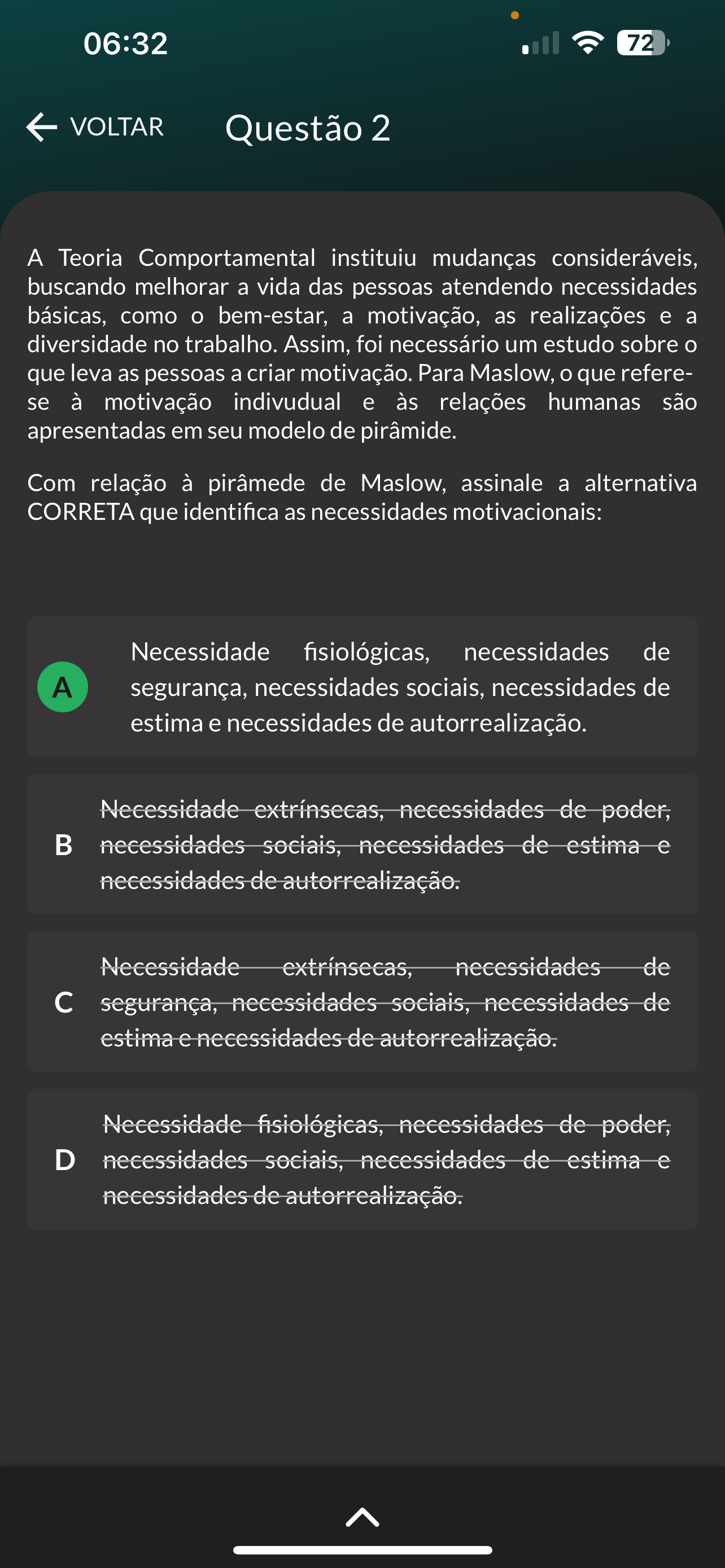 06:32 72 VOLTAR Questão 2 A Teoria Comportamental instituiu mudanças consideráveis, buscando melhorar a vida das pessoas atendendo necessidades básicas, como bem-estar, a motivação, as realizações e a diversidade no trabalho. Assim, foi necessário um estudo sobre que leva as pessoas a criar motivação. Para Maslow, que refere- se à motivação indivudual e às relações humanas são apresentadas em seu modelo de pirâmide. Com relação à pirâmede de Maslow, assinale a alternativa CORRETA que identifica as necessidades motivacionais: Necessidade fisiológicas, necessidades de A segurança, necessidades sociais, necessidades de estima e necessidades de autorrealização. Necessidade extrínsecas, necessidades de poder, necessidades sociais, necessidades de estima e necessidades de autorrealização. Necessidade extrínsecas, necessidades de c segurança, necessidades sociais, necessidades de estima e necessidades de autorrealização. Necessidade fisiológicas, necessidades de poder, D necessidades sociais, necessidades de estima e necessidades de autorrealização.