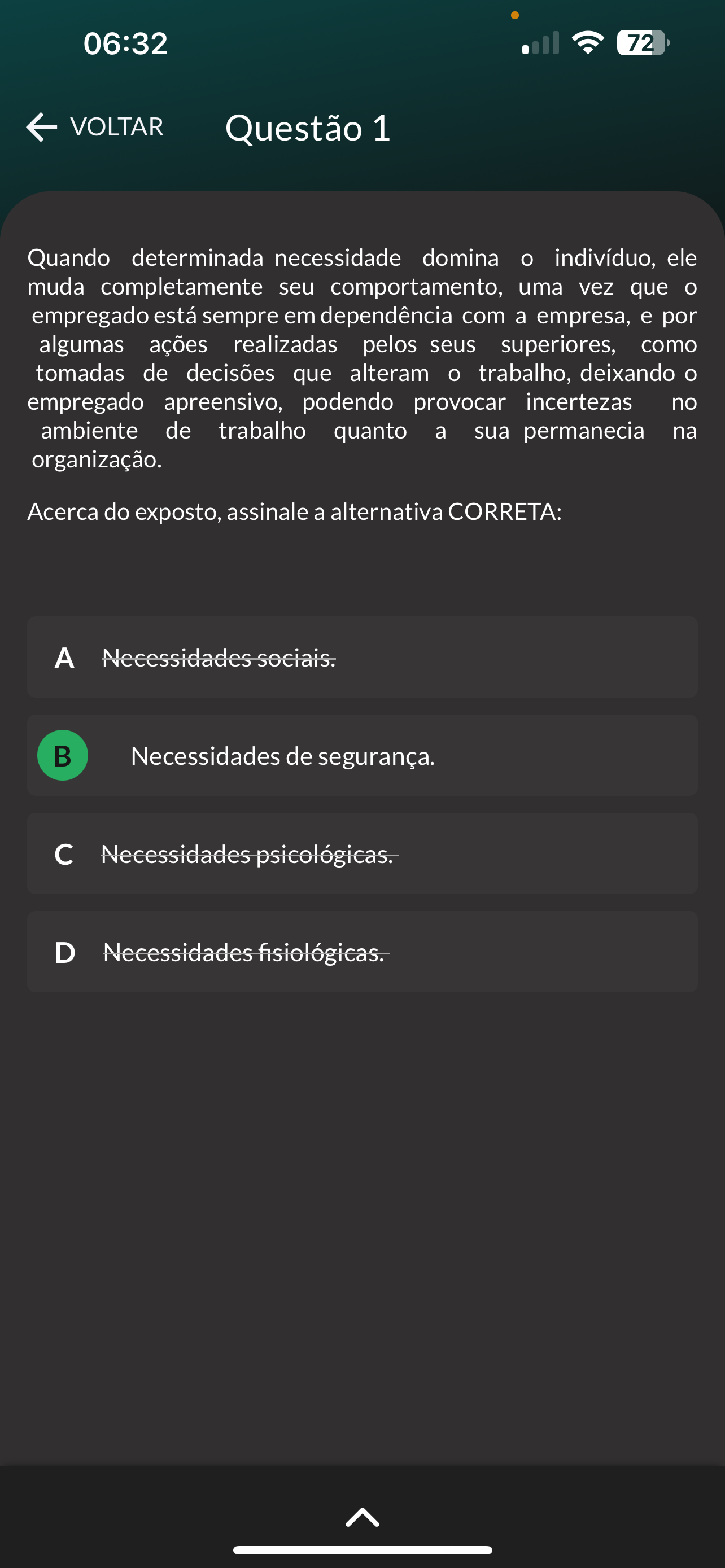 06:32 72 VOLTAR Questão 1 Quando determinada necessidade domina indivíduo, ele muda completamente seu comportamento, uma vez que empregado está sempre em dependência com a empresa, e por algumas ações realizadas pelos seus superiores, como tomadas de decisões que alteram trabalho, deixando empregado apreensivo, podendo provocar incertezas no ambiente de trabalho quanto a sua permanecia na organização. Acerca do exposto, assinale a alternativa CORRETA: A Necessidades sociais. Necessidades de segurança. c Necessidades psicológicas. D Necessidades fisiológicas.