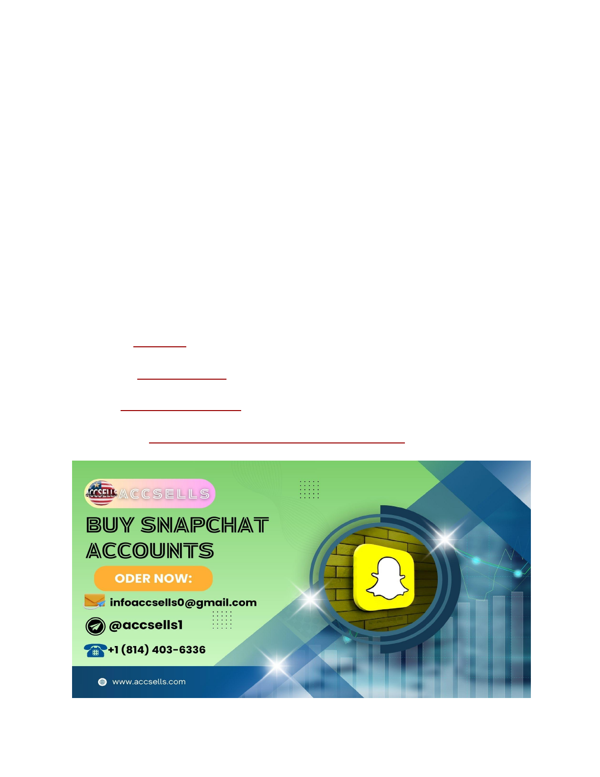 Top 5 Places to Buy Snapchat Accounts — Real & Secure Snapchat has become a powerful platform for businesses and influencers. With over 300 million active users, it offers vast potential for engagement. Purchasing established Snapchat accounts can accelerate your growth, allowing you to reach a wider audience quickly. These accounts often come with a built-in follower base, which saves you time and effort. However, always verify the authenticity of the accounts before making apurchase. Scammers often sell fake or inactive accounts. Choose reputable sellers to ensure you get real, active followers. This strategy can significantly benefit your marketing efforts and increase your brand’s visibility. If You want to more information just contact now 24 Hours Reply/ Contact : – ◯ Telegram: @accsells1 ◯ WhatsApp: +1 (814) 403–6336 ◯ E-mail: infoaccsells0@gmail.com ◯ Website Visit:https://accsells.com/product/buy-snapchat-accounts/ https://t.me/accsells1 https://api.whatsapp.com/send?phone=18144036336 mailto:infoaccsells0@gmail.com https://accsells.com/product/buy-snapchat-accounts/ Benefits Of Buying Snapchat Accounts Buying Snapchat accounts offers multiple advantages. You get an instant audience, enhanced credibility, and more. This can boost your online presence and engagement quickly. Instant Audience Buying a Snapchat account gives you an instant audience. You don’t need to wait to build followers. The account comes with existing followers. This allows you to start sharing your content right away. You can reach a wider audience faster. Enhanced Credibility An established Snapchat account boosts your credibility. Accounts with many followers appear more trustworthy. People are more likely to follow an account that already has followers. This can help you gain more followers organically. BenefitDescriptionInstant AudienceStart with an existing follower base.Enhanced CredibilityAppear more trustworthy with more followers. ● Instant Audience: Reach more people quickly. ● Enhanced Credibility: Gain trust easily. How To Choose The Right Snapchat Account Choosing the right Snapchat account to buy can be tricky. You want to ensure it meets your needs and goals. This guide will help you make an informed decision. Assessing Followers Look at the number of followers. More followers mean more reach. But, numbers alone aren’t enough.effectively. Future Trends The world of social media is always changing. Buying Snapchat accounts is no different. Let’s explore what the future holds.snapchat buy. Evolving Social Media Social media platforms are evolving rapidly. Snapchat is constantly adding new features. This means buying Snapchat accounts will open new opportunities.snapchat buy. Interactive content like AR filters will become more popular. Businesses will use these features to engage their audience. Snapchat’s user base is young and tech-savvy. They love these interactive elements. Table of New Features: FeatureBenefitAR FiltersIncreases engagementSnap MapGeotargeting for adsDiscoverContent promotion Long-term Strategy Planning for the long term is crucial. Buying Snapchat accounts can be part of this strategy. Focus on building a loyal audience. Use the following tactics: ● Post regularly ● Engage with followers ● Create valuable content These actions will help you grow your brand. Snapchat’s demographic is young. This means they will be your customers for years. Buy Snapchat Accounts. Frequently Asked Questions What Are The Benefits Of Buying Snapchat Accounts? If You want to more information just contact now 24 Hours Reply/ Contact : – ◯ Telegram: @accsells1 ◯ WhatsApp: +1 (814) 403–6336 ◯ E-mail: infoaccsells0@gmail.com ◯ Website Visit:https://accsells.com/product/buy-snapchat-accounts/ https://t.me/accsells1 https://api.whatsapp.com/send?phone=18144036336 https://accsells.com/product/buy-snapchat-accounts/ Buying Snapchat accounts can boost your social media presence quickly. It saves time and helps in reaching a larger audience. Businesses use it for targeted marketing and brand visibility. Buy Snapchat Accounts. Is It Legal To Buy Snapchat Accounts? Buying Snapchat accounts is not illegal, but it may violate Snapchat’s terms of service. Always check the platform’s policies to avoid risks. google buys snapchat. How To Choose A Reliable Seller? Choose a seller with good reviews and a proven track record. Verify their credibility and ensure they provide authentic accounts. Buy Snapchat Accounts. Are There Risks Involved In Buying Snapchat Accounts? Yes, risks include account suspension and scams. Always buy from reputable sources to minimize these risks. Buy Snapchat Accounts. Conclusion Purchasing Snapchat accounts can significantly boost your social media presence. It offers a quick way to expand your reach. Ensure you buy from reputable sources for the best results. Investing in Snapchat accounts can lead to better engagement and brand visibility. Buy Snapchat Accounts. Top 5 Places to Buy Snapchat Accounts — Real & Secure If You want to more information just contact now Benefits Of Buying Snapchat Accounts Instant Audience Enhanced Credibility How To Choose The Right Snapchat Account Assessing Followers Engagement Rates Where To Buy Snapchat Accounts Trusted Platforms Avoiding Scams Legal And Ethical Considerations Terms Of Service Ethical Implications Integrating Purchased Accounts Brand Alignment Content Strategy Measuring Success Key Metrics Roi Analysis Future Trends Evolving Social Media Long-term Strategy Frequently Asked Questions What Are The Benefits Of Buying Snapchat Accounts? If You want to more information just contact now Is It Legal To Buy Snapchat Accounts? How To Choose A Reliable Seller? Are There Risks Involved In Buying Snapchat Accounts? Conclusion