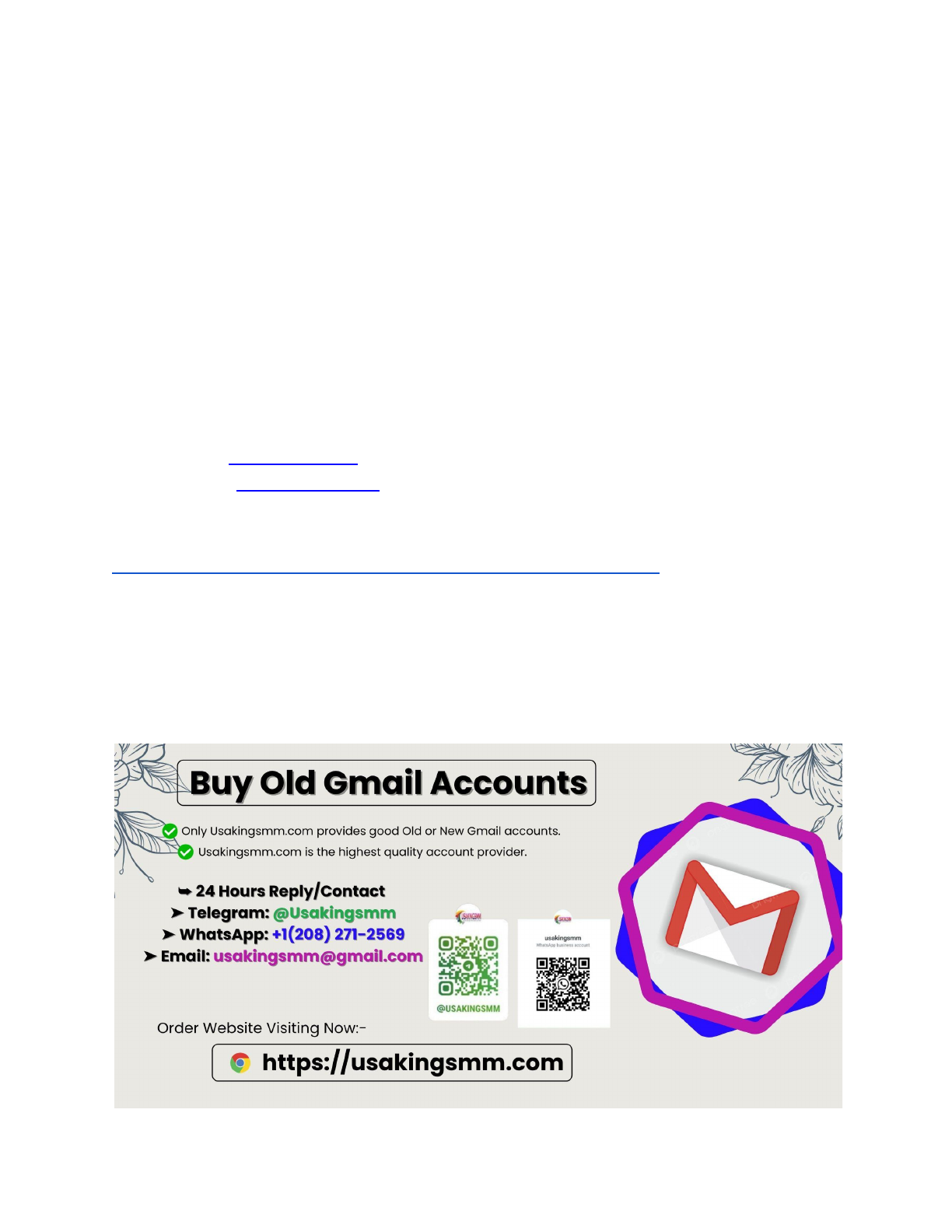 15 Steps To Buy Old Gmail Accounts In Bulk (PVA & Aged) Looking to buy old Gmail accounts? Purchase authentic aged accounts to boost your online presence and credibility. These accounts have a proven track record of activity and can provide a solid foundation for your digital marketing efforts. By investing in established accounts, you can save time and effort in building up your online reputation from scratch. With a range of options available, you can choose accounts with varying levels of activity and engagement to suit your specific needs. ➥ 24 Hours Reply/Contact ➤ Telegram: @Usakingsmm ➤ WhatsApp: +1(208) 271-2569 ➤ Email: usakingsmm@gmail.com Website Visit Now:-Click the link:- https://usakingsmm.com/product/buy-old-gmail-accounts/ The Importance Of Old Gmail Accounts Unlock the power of established Gmail accounts with our service. Older Gmail accounts carry authority and trust, benefiting your online presence. Purchase aged Gmail accounts today and boost your digital marketing efforts. In today’s digital age, an email account is a necessity for communication, especially for businesses. https://t.me/Usakingsmm https://wa.me/message/LTVXHCQXS7XGI1?src=qr https://usakingsmm.com/product/buy-old-gmail-accounts/ Gmail, being one of the most widely used email services, has become an essential tool for individuals and companies alike. However, not all Gmail accounts are created equal. Old Gmail accounts hold a significant advantage over new ones, making them a valuable asset for anyone looking to establish a strong online presence. Gmail has become one of the most popular email services globally, and its importance stems from several factors: Accessibility Gmail can be accessed from anywhere with an internet connection, making it convenient for users to check their emails on various devices. Integration It seamlessly integrates with other Google services like Google Drive, Google Calendar, Google Docs, etc., providing a comprehensive suite of tools for productivity and communication. Storage Gmail offers generous storage space for emails, allowing users to store large volumes of emails and attachments without worrying about running out of space. ➥ 24 Hours Reply/Contact ➤ Telegram: @Usakingsmm ➤ WhatsApp: +1(208) 271-2569 ➤ Email: usakingsmm@gmail.com Website Visit Now:-Click the link:- https://usakingsmm.com/product/buy-old-gmail-accounts/ Search Gmail’s powerful search feature makes it easy for users to find specific emails or information within their inbox, even in large email archives. Security Google employs robust security measures to protect Gmail accounts from hacking and phishing attempts, providing users with peace of mind regarding the safety of their emails and personal information. Customization Users can customize their Gmail experience with various themes, labels, filters, and settings to suit their preferences and workflow. Overall, Gmail has become a cornerstone of modern communication and productivity, offering users a reliable and feature-rich email service that meets the demands of both personal and professional use. https://t.me/Usakingsmm https://wa.me/message/LTVXHCQXS7XGI1?src=qr https://usakingsmm.com/product/buy-old-gmail-accounts/ Why do you need Gmail accounts? Gmail accounts are essential for various reasons: Email Communication Email remains a primary mode of communication for both personal and professional purposes. Having a Gmail account enables you to send and receive emails efficiently. Access to Google Services A Gmail account serves as a gateway to a plethora of Google services such as Google Drive, Google Calendar, Google Docs, YouTube, etc. These services are widely used for productivity, collaboration, entertainment, and more. Online Accounts and Registrations Many online platforms and services require an email address for registration and communication purposes. Having a Gmail account provides you with a reliable email address to use for signing up on websites, social media platforms, online shopping sites, etc. Work and Business Gmail accounts are commonly used for professional communication in workplaces and businesses. They offer features such as custom email addresses (via Gmail for Business), integration with productivity tools, and reliable email management. Storage and Organization Gmail provides ample storage space for emails and attachments, along with robust organizational features such as labels, filters, and search capabilities. This helps you manage your emails efficiently and keep your inbox organized. Sync Across Devices With a Gmail account, you can access your emails and other Google services from various devices, including smartphones, tablets, laptops, and desktop computers. This ensures continuity and accessibility regardless of the device you’re using. Security and Reliability Google implements advanced security measures to protect Gmail accounts from unauthorized access and cyber threats. Additionally, Gmail’s reliability ensures that your emails are delivered promptly and reliably. In summary, having a Gmail account is essential for effective communication, access to a wide range of online services, professional endeavors, and personal organization. It provides a reliable, feature-rich platform for managing your digital life. Advantages Of Buying Old Gmail Accounts When it comes to managing multiple online activities, having access to old Gmail accounts can be highly advantageous. From increased credibility to improved email deliverability, these accounts offer several benefits that can enhance your online presence. Access To Multiple Accounts Buying old Gmail accounts provides the convenience of accessing multiple accounts without the hassle of creating new ones. This allows for efficient management of various online activities and communication channels. Increased Credibility Older Gmail accounts carry a sense of established credibility, which can be beneficial for personal or professional use. They 