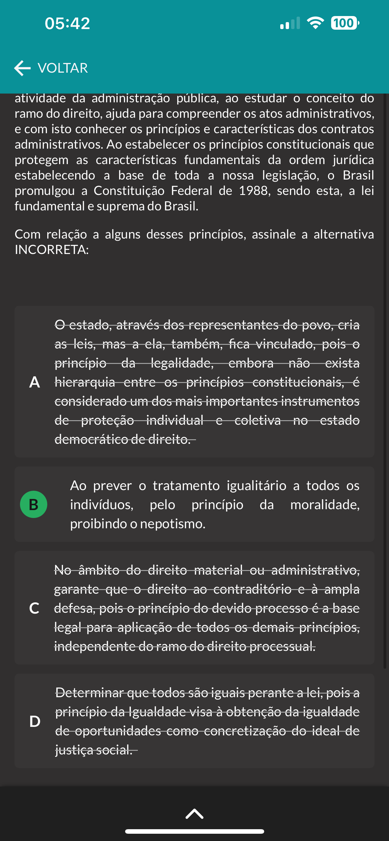 05:42 100 VOLTAR atividade da administração pública, ao estudar conceito do ramo do direito, ajuda para compreender os atos administrativos, e com isto conhecer os princípios e características dos contratos administrativos. Ao estabelecer os princípios constitucionais que protegem as características fundamentais da ordem jurídica estabelecendo a base de toda a nossa legislação, Brasil promulgou a Constituição Federal de 1988, sendo esta, a lei fundamental e suprema do Brasil. Com relação a alguns desses princípios, assinale a alternativa INCORRETA: estado, através dos representantes do povo, cria as leis, mas a ela, também, fica vinculado, pois princípio da legalidade, embora não exista A hierarquia entre princípios constitucionais, é considerado um dos mais importantes instrumentos de proteção individual e coletiva no estado democrático de direito. Ao prever tratamento igualitário a todos os B indivíduos, pelo princípio da moralidade, proibindo nepotismo. No âmbito do direito material ou administrativo, garante que direito ao contraditório e à ampla c defesa, pois princípio do devido processo é a base legal para aplicação de todos os demais princípios, independente do ramo do direito processual. Determinar que todos são iguais perante a lei, pois a princípio da Igualdade visa à obtenção da igualdade D de oportunidades como concretização do ideal de justiça social.