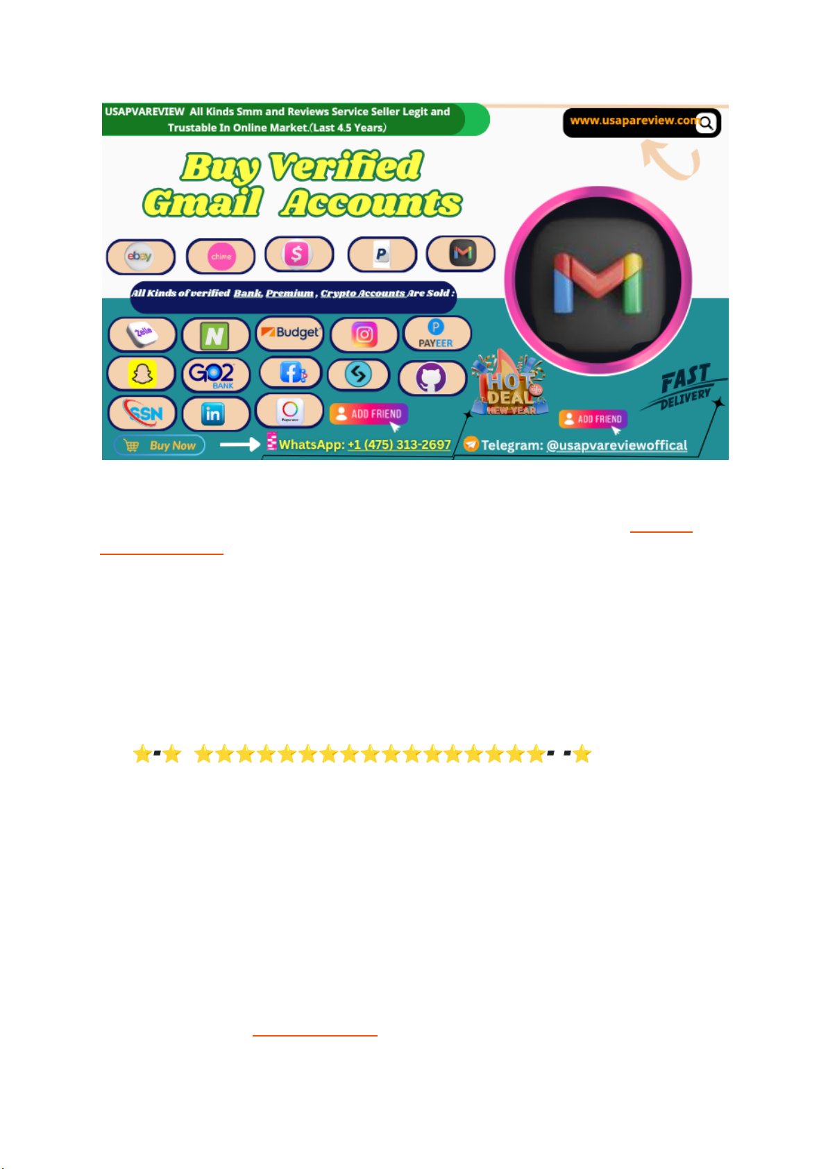 Buy Old Gmail Accounts – Guaranteed Authentic and Reliable Discover the power of established online credibility when you choose to buy Old Gmail accounts from our trusted source. Each account is 100% genuine, thoroughly verified, and designed to support your digital growth with reliability and trust. Whether you’re managing bulk communications, marketing campaigns, or account verifications, our aged Gmail accounts offer a stable and secure solution. Boost your online presence and enjoy seamless engagement with verified, high-quality accounts. Shop confidently with our guaranteed service today. ⭐▰⭐⇛⭐⭐⭐⭐⭐⭐⭐⭐⭐⭐⭐⭐⭐⭐⭐⭐⭐▰▰▰⭐ ➡ If you need any accounts you can contact us. Contact our store manager :- 24/7 ……………………………………………………………………………… ……………………………………………………………………………… Telegram: @usapvareviewoffical WhatsApp: +1 (475) 313-2697 Skype: UsaPVA Review https://usapvareview.com/product/buy-old-gmail-accounts/ https://usapvareview.com/product/buy-old-gmail-accounts/ https://join.skype.com/invite/xuop2BfDEo9j ▰▰▰▰▰▰▰▰▰▰▰▰▰▰▰▰▰▰▰▰▰▰▰▰▰▰▰▰▰▰▰▰▰▰▰▰▰▰▰▰▰▰▰▰▰▰▰▰▰ Visit Website or choose favourite accounts and see accounts price. Features of Our Verified Gmail Accounts: ➣ Fully Verified with Authentic Documentation ➣ Complete Set of Documents Provided with Each Account ➣ Affordable Pricing for All Budgets ➣ Premium, High-Quality Account Assurance ➣ 100% Satisfaction or Your Money Back ➣ 24/7 Dedicated Customer Support Team ➣ Exclusive Bonuses Included with Every Purchase ➣ Manually Created Aged Gmail Accounts for Maximum Reliability ➣ Available in USA, UK, Canada, and Australia with Realistic English Names ➣ Choose from PVA (Phone Verified), Bulk, Fresh, and Aged Gmail Accounts ➣ Low-Cost Options for Newly Created Gmail Accounts If you face any problem you can contact us. Email: usapvareviewoffical@gmail.com Skype: UsaPVA Review Telegram: @usapvareviewoffical WhatsApp: +1 (475) 313-2697 Buy Aged Gmail Accounts: Strengthen Your Online Identity In today’s digital age, having a strong and reliable online identity is more important than ever. From professional communication to personal networking, your email account plays a central role in maintaining your online presence. One of the most effective ways to ensure your online identity is secure and credible is by investing in buy old Gmail accounts. These accounts not only offer a level of security and trust that newly created accounts often lack but also provide a foundation for establishing a solid online reputation. In this guide, we will explore the significance of protecting your online privacy, the risks associated with compromised email accounts, the advantages of using a pre-owned Gmail account, and the key factors to consider when purchasing an aged Gmail account. https://usapvareview.com/product/buy-verified-cash-app-account/ https://join.skype.com/invite/xuop2BfDEo9j https://t.me/usapvareviewoffical https://wa.me/14753132697 https://usapvareview.com/product/buy-old-gmail-accounts/ ⭐▰⭐⇛⭐⭐⭐⭐⭐⭐⭐⭐⭐⭐⭐⭐⭐⭐⭐⭐⭐▰▰▰⭐ ➡ If you need any accounts you can contact us. Contact our store manager :- 24/7 ……………………………………………………………………………… ……………………………………………………………………………… Telegram: @usapvareviewoffical WhatsApp: +1 (475) 313-2697 Skype: UsaPVA Review ▰▰▰▰▰▰▰▰▰▰▰▰▰▰▰▰▰▰▰▰▰▰▰▰▰▰▰▰▰▰▰▰▰▰▰▰▰▰▰▰▰▰▰▰▰▰▰▰▰ Visit Website or choose favourite accounts and see accounts price. Main Highlights Strengthened Online Identity: Aged Gmail accounts offer a more reliable and trustworthy online presence. Enhanced Security: Pre-owned Gmail accounts come with a proven track record of activity and age. Credibility and Trust: These accounts are less likely to be flagged or blocked by services compared to new accounts. Better Reputation: Using an aged account can help build credibility with clients, partners, and online platforms. Protecting Your Privacy: Safeguarding your email account helps prevent hacks and unauthorized access to your personal information. The Significance of Protecting Your Online Privacy In today’s interconnected world, protecting your online privacy is essential. Every action you take online—whether sending an email, purchasing a product, or interacting with others on social media—leaves behind a digital footprint. The more this footprint is compromised, the more vulnerable you become to threats like hacking, identity theft, and data breaches. https://join.skype.com/invite/xuop2BfDEo9j https://usapvareview.com/product/buy-verified-cash-app-account/ An email account is often the gateway to many of your online activities. It’s the key to accessing bank accounts, social media profiles, cloud storage, and business communications. As such, it’s crucial to safeguard your email address from malicious actors and maintain strong security practices. Aged Gmail accounts are a smart choice for those seeking enhanced security, as they offer an extra layer of trust and legitimacy compared to newly created accounts. ⭐▰⭐⇛⭐⭐⭐⭐⭐⭐⭐⭐⭐⭐⭐⭐⭐⭐⭐⭐⭐▰▰▰⭐ ➡ If you need any accounts you can contact us. Contact our store manager :- 24/7 ……………………………………………………………………………… ……………………………………………………………………………… Telegram: @usapvareviewoffical WhatsApp: +1 (475) 313-2697 Skype: UsaPVA Review ▰▰▰▰▰▰▰▰▰▰▰▰▰▰▰▰▰▰▰▰▰▰▰▰▰▰▰▰▰▰▰▰▰▰