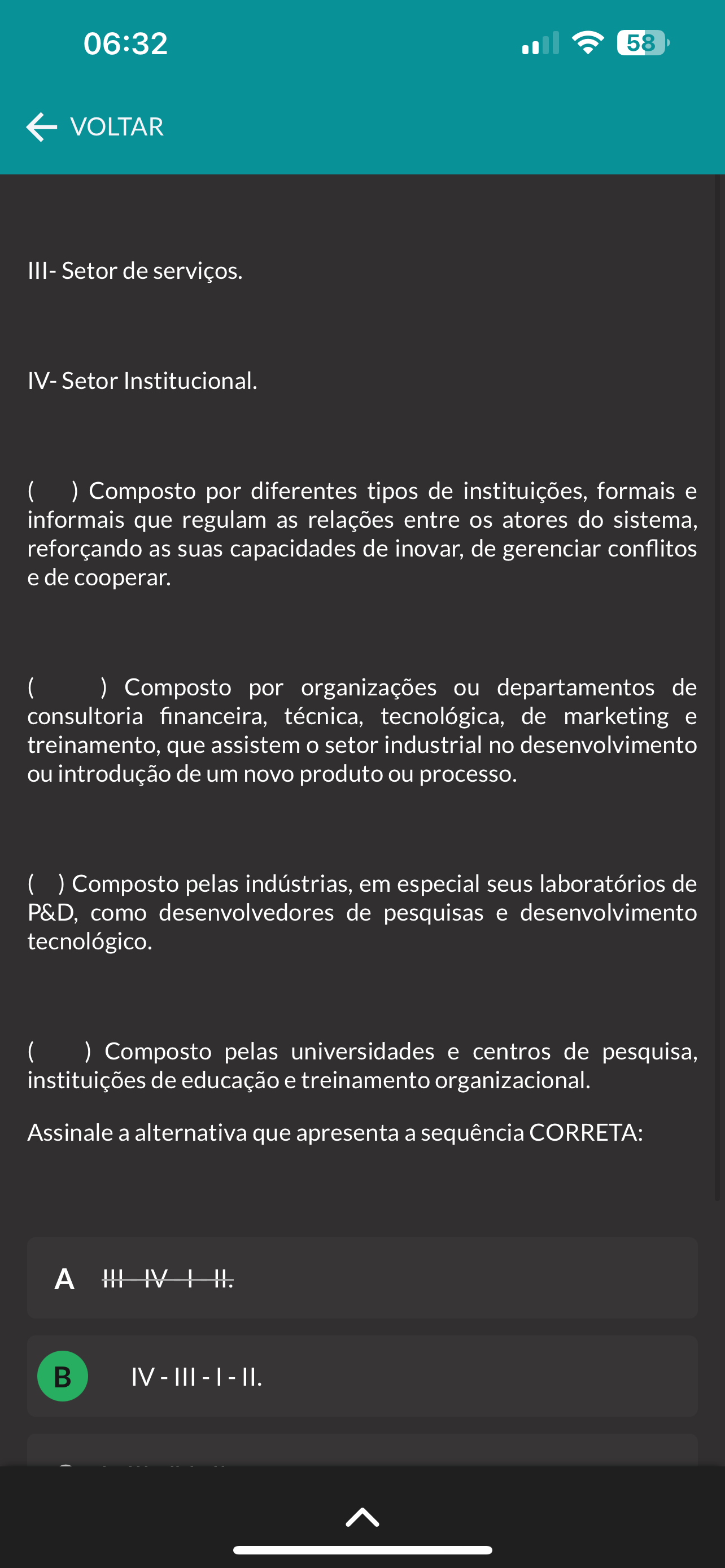 06:32 58 VOLTAR III- Setor de serviços. IV- Setor Institucional. ( ) Composto por diferentes tipos de instituições, formais e informais que regulam as relações entre os atores do sistema, reforçando as suas capacidades de inovar, de gerenciar conflitos e de cooperar. ( ) Composto por organizações ou departamentos de consultoria financeira, técnica, tecnológica, de marketing e treinamento, que assistem setor industrial no desenvolvimento ou introdução de um novo produto ou processo. Composto pelas indústrias, em especial seus laboratórios de P&D, como desenvolvedores de pesquisas e desenvolvimento tecnológico. ( ) Composto pelas universidades e centros de pesquisa, instituições de educação e treinamento organizacional. Assinale a alternativa que apresenta a sequência CORRETA: B IV - III - I II.