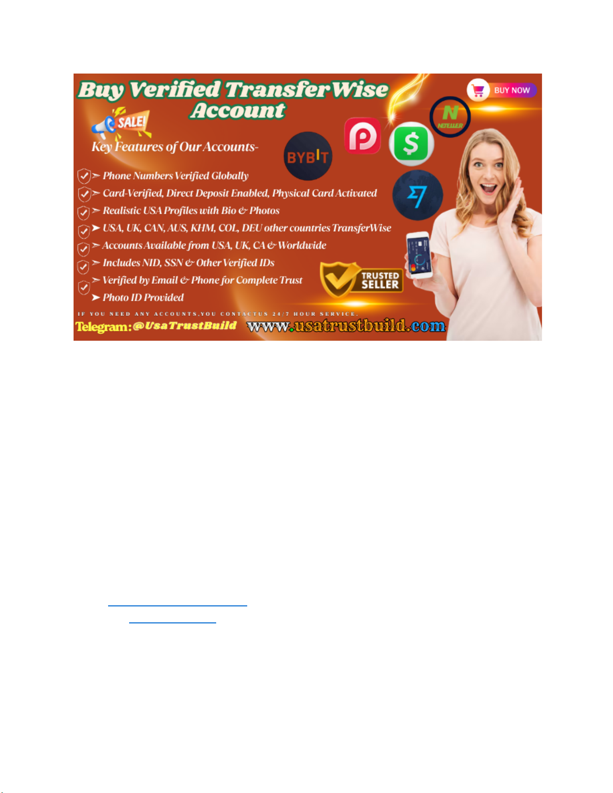 Features of Our Wise Accounts:- ➤ USA, UK, CAN, AUS, KHM, COL, DEU other countries TransferWise ➤ Bank verification is done with reputed and dependable USA banks. ➤100% Customers Satisfaction Guaranteed ➤ Phone Verified ➤ Photo ID Provided ➤ Date of Birth Provided ➤ Driving License Scan Copy ➤ Bank Verified ➤Verified with a valid USA phone number. ➤Customer Support(24×7) Need to Confirm Your Order? Here’s How to Contact Us Easily! Email: usatrustbuild@gmail.com Telegram: @UsaTrustBuild WhatsApp: Heads up: https://mail.google.com/mail/u/0/?tab=rm&ogbl#inbox https://t.me/UsaTrustBuild Important: There may be many fake Telegram accounts using our name. Scammers often do this to harm our reputation. Please note that our only official username is @UsaTrustBuild. We are not responsible if you are scammed by sending payment to any other Telegram account or username. Are you looking to make fast, secure international money transfers without the usual hassles? Buying a verified TransferWise account can be the shortcut you need. Imagine skipping the long verification waits and starting your transfers right away. This guide will show you how a verified account can save you time, reduce stress, and keep your money moving smoothly. Keep reading to discover everything you need to know before making your purchase and how to get the most from your TransferWise experience. A Hassle-free Way To Buy Verified Transferwise Account From Usatrustbuild.com Buying a verified TransferWise account from UsaTrustBuild.Com offers a simple and secure solution for your international money transfer needs. The process is quick, clear, and designed to remove common hassles. UsaTrustBuild.Com provides verified accounts that save time and effort, letting you focus on your business or personal tasks without delays. Trust and reliability are key features that make this service stand out. Start using your verified TransferWise account right away to enjoy smooth global transactions. Need to Confirm Your Order? Here’s How to Contact Us Easily! Email: usatrustbuild@gmail.com Telegram: @UsaTrustBuild Need to Confirm Your Order? Here’s How to Contact Us Easily! Email: usatrustbuild@gmail.com Telegram: @UsaTrustBuild Lower Fees And Better Exchange Rates One of the biggest benefits of using a verified TransferWise account is the lower fees and better exchange rates. TransferWise uses real mid-market rates, which are usually better than rates from banks or other services. This means you keep more of your money when sending or receiving funds internationally. https://mail.google.com/mail/u/0/?tab=rm&ogbl#inbox https://t.me/UsaTrustBuild https://mail.google.com/mail/u/0/?tab=rm&ogbl#inbox https://t.me/UsaTrustBuild ● Transparent Fees: No hidden charges. You see the exact cost before sending money. ● Competitive Exchange Rates: TransferWise offers rates close to the real market rate. ● Save Money: Lower fees mean more savings for businesses and individuals. Service Typical Fee Exchange Rate Margin Traditional Banks 2% - 5% 3% - 6% TransferWise Verified Account 0.35% - 1% 0% - 0.5% Using a verified account from UsaTrustBuild.Com ensures you get these benefits immediately, without the wait for verification. This makes international payments cost-effective and faster. Why Do You Choose a Verified Transferwise Account For Your Business ? A verified TransferWise account is essential for businesses dealing with international clients and suppliers. It helps manage payments easily and professionally. Verification proves your identity, which builds trust with partners and financial institutions. Benefits for business users include: ● Faster Transactions: Verified accounts face fewer limits and delays. ● Improved Credibility: Verified status increases trust among customers and vendors. ● Multiple Currency Support: Hold and send money in many currencies without extra accounts. ● Easy Record Keeping: TransferWise provides clear transaction history for accounting. Choosing a verified account from UsaTrustBuild.Com removes the hassle of the verification process. You get a ready-to-use account that fits your business needs and helps you save time and money. Increased Transaction Limits Verified TransferWise accounts offer higher transaction limits compared to unverified ones. This is important for businesses and individuals who send or receive large sums of money regularly. Key points about transaction limits: ● Higher Sending Limits: Verified accounts can send larger amounts without restrictions. ● Receive Larger Payments: Accept bigger transfers from clients worldwide. ● Less Risk of Account Holds: Verification reduces the chance of account freezes due to suspicious activity. Here is a quick comparison: Account Type Daily Limit Monthly Limit Unverified $1,000 $5,000 Verified $50,000 $200,000 UsaTrustBuild.Com offers verified accounts with these increased limits, helping you handle bigger transactions smoothly. Why Do I Need A Transferwise Card Debit/Credit ? A TransferWise debit/credit card adds convenience and flexibility to your account. It allows you to spend money directly from your TransferWise balance, avoiding currency conversion fees that banks charge. Reasons to have a TransferWise card: ● Use Worldwide: Spend in multiple currencies anywhere, with low fees. ● Easy Access: Withdraw cash at ATMs or pay in stores. ● Track Spending: Manage expenses easily through the TransferWise app. ● Link to Verified Account: Card works with your verified account for smooth transactions. The card is perfect for travelers, remote workers, and businesses paying international suppliers. UsaTrustBuild.Com provides verified accounts ready for card activation, so you start using your card fast. How To Security Features Always Follow. Security is a top priority for TransferWise and UsaTrustBuild.Com. Verified accounts come with strong protections to keep your money and data safe. Important security features incl