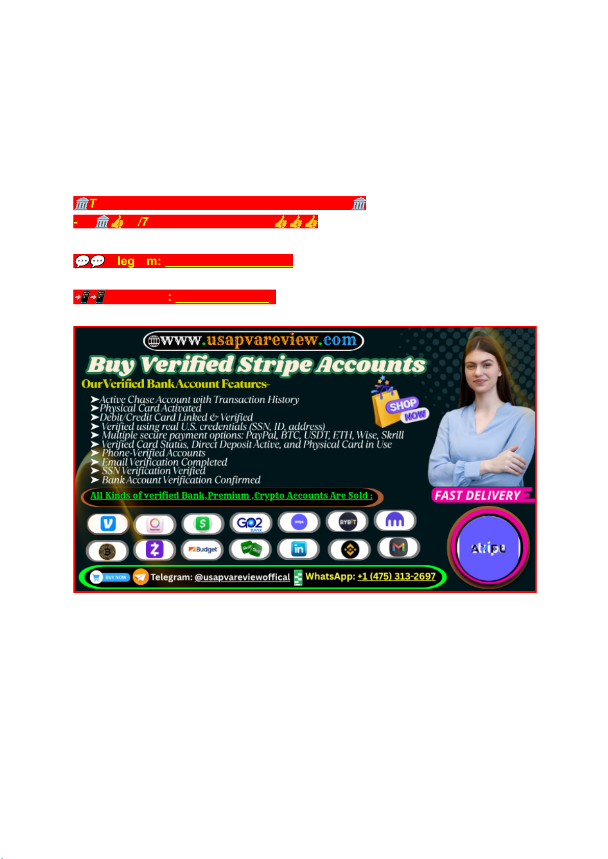 In the event that You Want To Buy verified Stripe accounts .It is the best place, we provide the most secure, we provide the most secure and dependable choices online. Our accounts come with complete verification, including crucial credentials such as email address, phone number, SSN, driver's license, passport, and photo ID. Each account is meticulously validated to align with Stripe's compliance requirements, guaranteeing smooth access to all essential features. 🏛To Get Fully Help 24/7 Hours, Talk to us Now 🏛 --➤🏛👍24/7 Hours Reply/Contact👍👍👍 💬💬Telegram: @usapvareviewoffical 📲📲 WhatsApp: +1 (475) 313-2697 https://t.me/usapvareviewoffical https://wa.me/14753132697 Whether you are an entrepreneur, freelancer, or digital business owner, our verified Stripe accounts offer the reliability and trust necessary for accepting payments worldwide without complications. Opt for our service for a hassle-free experience. Our service offers the following features: ➤ Stripe Accounts Established in the USA, UK, and Australia ➤ Verified Using Authentic Phone Numbers and Gmail Addresses ➤ Completely Verified and Active Stripe Accounts ➤ 24/7 Customer Support Available ➤ Associated with Secured Bank Cards ➤ Driving Licenses and Identity Documents Authenticated ➤ Created Manually – 100% Non-Drop Assurance ➤ Debit/Credit Card Successfully Added and Verified ➤ SSN and Routing Number Fully Confirmed ➤ No Limits on Transactions or Payment Issues ➤ Unlimited Money Transfers Allowed ➤ Replacement Guaranteed if Any Problems Arise ➤ Full Login Access Offered ➤ Quick Delivery Within a Brief Timeframe What we deliver- ● Email and login password ● Others login information. ● Recovery information. ● New and full fresh account ● 100% verified account Contact our store manager :- 247 ➥Skype: UsaPVA Review ➥Telegram: @usapvareviewoffical ➥WhatsApp: +1 (475) 313-2697 Best Tips to Buy Verified Stripe Accounts from USAPVAREVIEW.COM For businesses and entrepreneurs operating in the digital marketplace, Stripe has become one of the most trusted payment processing platforms. It allows companies to accept payments online, manage subscriptions, and operate internationally with ease. However, setting up and verifying a Stripe account can be challenging, especially for new businesses or individuals operating outside Stripe-supported countries. This is where USAPVAREVIEW.com comes in. Known for providing high-quality verified digital accounts, the platform makes it easy to purchase fully verified Stripe accounts that are ready for immediate use. To ensure a smooth buying experience, consider these best tips before making a purchase: 1. Understand Your Needs First Determine whether you need a Stripe account for a startup, an established business, or a personal project. This will help you choose the right type of verified account. 2. Check Provider Reputation Only buy from reputable sellers like USAPVAREVIEW.com, which is known for transparency, secure transactions, and verified accounts that actually work. https://join.skype.com/invite/xuop2BfDEo9j https://t.me/usapvareviewoffical https://wa.me/14753132697 3. Ask About Verification Details Ensure the account is fully verified with all necessary documentation—such as email confirmation, phone verification, and identity checks—so you can start accepting payments immediately. 4. Secure Your Purchase After buying, change passwords and enable two-factor authentication (2FA) to protect your account. 5. Look for After-Sales Support Choose a provider that offers responsive customer support in case you need help setting up or managing your account. USAPVAREVIEW.com provides professional assistance throughout the process. Following these tips will help you buy a verified Stripe account safely and maximize the benefits of this powerful payment solution. Introduction To USAPVAREVIEW.com And His Services USAPVAREVIEW.com is a professional online marketplace specializing in verified digital accounts for financial platforms, social networks, and e-commerce services. It was created to meet the growing demand for secure, ready-to-use accounts that save users time and effort. Whether you need a verified Stripe, PayPal, Wise, Coinbase, Chime, or Neteller account, USAPVAREVIEW.com provides solutions that eliminate the hassle of complex sign-ups and lengthy verification procedures. Each account is created and verified using legitimate methods, ensuring that customers receive high-quality products that function flawlessly. From entrepreneurs launching a new business to freelancers handling international clients, the platform caters to anyone seeking fast, secure access to essential online services. Why Choose USAPVAREVIEW.COM? In a marketplace crowded with sellers, USAPVAREVIEW.com stands out as the most reliable source for verified Stripe accounts. Here’s why thousands of customers choose this platform: 1. Proven Track Record – Years of experience delivering verified accounts to satisfied customers worldwide. 2. Strict Security Protocols – All transactions are encrypted, protecting your payment information. 3. Full Verification – Every Stripe account is fully verified, ensuring immediate usability and compliance with platform requirements. 4. Fast Delivery – Most accounts are delivered within hours of purchase. 5. Excellent Customer Support – Responsive, knowledgeable support agents are available to assist before, during, and after your purchase. 6. Competitive Pricing – High-quality verified accounts at affordable rates. When it comes to buying a verified Stripe account, trust and reliability are non-negotiable—and USAPVAREVIEW.com delivers both. What Is USAPVAREVIEW.COM At its core, USAPVAREVIEW.com is an online hub that connects customers with verified digital accounts for multiple platforms. Unlike typical account sellers, the website focuses on quality and legitimacy. Every account is tested for func