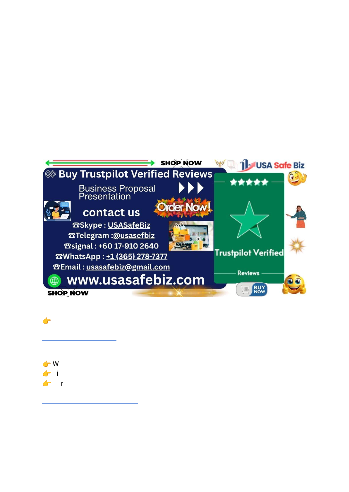 Buy Trustpilot Verified Reviews - USA Safe Biz In today’s competitive online climate, customer trust is everything. Whether you’re running a small startup or an established brand, maintaining positive public perception on review platforms can define your success. If you’re looking to buy Trustpilot verified reviews, then USA Safe Biz is your trusted, secure, and professional source for authentic and safe reviews that strengthen your online reputation. Contact Us Anytime: 👉 Telegram: https://t.me/Usasafebiz 👉 WhatsApp: +1 (365) 278-7377 👉 Signal: +60 17-910 2640 👉 Purchase Link: Buy Trustpilot Verified Reviews Why Trustpilot Reviews Matter for Your Business https://t.me/Usasafebiz https://t.me/Usasafebiz https://t.me/Usasafebiz https://usasafebiz.com/service/buy-trustpilot-verified-reviews/ https://usasafebiz.com/service/buy-trustpilot-verified-reviews/ When people search for a business online, one of the first things they check is the Trustpilot rating. Reviews on this platform influence whether potential customers choose you—or scroll past you. Here’s why they are so powerful: ● Instant credibility: Verified reviews show prospects that your brand is legitimate and trusted. ● Higher conversion rates: Businesses with strong star ratings on Trustpilot are more likely to convert visitors into paying customers. ● Improved SEO ranking: Google often features review stars in search results, helping your brand attract more clicks. ● Customer confidence: Real-sounding experiences from verified profiles create a sense of authenticity that boosts trust. At USA Safe Biz, we specialize in helping businesses enhance their online presence by connecting them with authentic, Trustpilot verified reviews that look and feel 100% real. Why Choose USA Safe Biz for Trustpilot Verified Reviews? Buying reviews can be risky if done through the wrong provider. Many companies use fake accounts or spam tactics that can endanger your Trustpilot profile. USA Safe Biz follows a strictly safe, authentic, and privacy-focused approach. Here’s what sets us apart: 1. Verified Accounts Only All reviews come from real, verified Trustpilot profiles that adhere to Trustpilot’s authenticity standards. 2. 100% Safe and Secure Process Your account’s safety is our top priority. We use manual review posting methods—no bots, no scripts. 3. Country-Targeted Reviews (USA-Based Options) Since your audience may be in the United States, we offer USA-based Trustpilot verified reviews, ensuring relevancy and resonance. 4. Fast Delivery Without Risk We use a gradual posting schedule, ensuring organic growth without triggering platform suspicion. 5. Custom Review Writing We don’t copy-paste text. Each review is manually written, sounds human, and aligns with your business tone and offerings. Who Should Buy Trustpilot Verified Reviews? Our service is suitable for a wide range of businesses: ● E-commerce stores wanting to build early traction. ● Digital service providers aiming to attract global clients. ● Local shops or agencies that need to enhance reputation fast. ● Startups that lack sufficient review history to boost trust. Whether you’re just starting or want to strengthen your brand credibility, buying safe and verified Trustpilot reviews is an effective move. How to Buy Trustpilot Verified Reviews (Step-by-Step) Purchasing from USA Safe Biz is quick, transparent, and fully secure. 1. Visit the official product page: 2. Buy Trustpilot Verified Reviews 3. . 4. Choose your package: Select the number of reviews you want (e.g., 5, 10, 20, or custom). 5. Provide your Trustpilot link: Share your profile or business page URL. 6. Add custom instructions (if any): You can request delivery timing or specific themes for the reviews. 7. Complete your payment securely: We support multiple payment options for your convenience. 8. Sit back and relax: Reviews will start appearing naturally within 24–48 hours. The Benefits of Buying Verified Trustpilot Reviews Let’s break down the real advantages of partnering with USA Safe Biz for verified customer feedback. Benefit Description Boost Trust & Sales Verified reviews encourage users to choose your brand confidently. https://usasafebiz.com/service/buy-trustpilot-verified-reviews/ https://usasafebiz.com/service/buy-trustpilot-verified-reviews/ Enhance Online Visibility Positive ratings influence both Trustpilot placement and Google appearances. Protect Your Reputation Safe posting means no risk to your business account. Improve Conversion Rates Visitors become buyers once they see real, consistent feedback. Our Commitment to Authenticity and Safety Unlike shady providers who rely on fake or duplicate accounts, USA Safe Biz only uses verified, established Trustpilot profiles. Our commitment is not just about delivering reviews—it’s about maintaining long-term credibility for your business. We prioritize: ● Authenticity in every review (no copied content). ● Transparency in pricing and process. ● Discretion and client privacy. Your business reputation is your most valuable asset—and we’re here to protect it. Why Businesses Trust USA Safe Biz Our reputation is built on trust, safety, and consistent results. Over the years, we’ve helped hundreds of global businesses enhance their digital presence through premium, verified feedback solutions. Here’s why clients repeatedly choose us: ● Proven track record with success stories across industries. ● Dedicated customer support via Telegram, WhatsApp, and Signal. ● Flexible packages that adapt to all business sizes and goals. ● Affordable pricing without compromising quality. Frequently Asked Questions (FAQ) 1. Are your Trustpilot reviews actually verified? Yes, all reviews are from verified and aged Trustpilot accounts. We ensure each review passes the platform’s authenticity filters. 2. Is it safe to buy Trustpilot verified reviews? Absolutely. Our process is manual and fully organic—