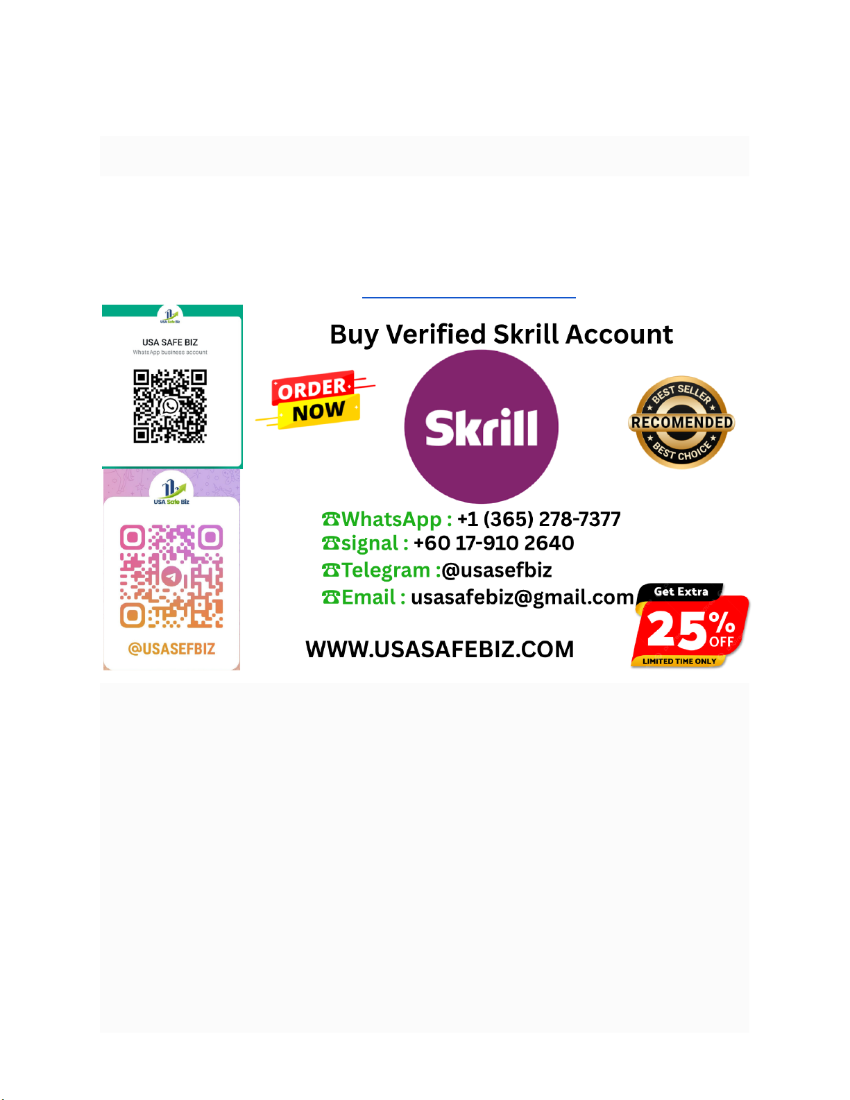 Best place to Buy Verified Skrill Account Contact Us for more Information’s: ☎Skype : USASafeBiz ☎Telegram :@usasefbiz ☎signal : +60 17-910 2640 ☎WhatsApp : +1 (365) 278-7377 ☎Email : usasafebiz@gmail.com Buy Verified Skrill Account Hei! Are you looking to buy a Verified Skrill Account? We have the Fully Verified & Best Skrill Account for sale. So, buy a Skrill account from us without any hassle. Our Verified Skrill Account service gives- mailto:usasafebiz@gmail.com ➣Bank Verified ➣ Bank Statement copy provided ➣Account Access ➣ Phone confirmed and has access ➣Date of Birth Provided ➣ Documents ( Nid card scan copy+ utility invoice scan copy) ➣Full Verified Skrill Account (Fresh, Old, History 3 kinds of account we sell) Contact Us for more Information’s: ☎Skype : USASafeBiz ☎Telegram :@usasefbiz ☎signal : +60 17-910 2640 ☎WhatsApp : +1 (365) 278-7377 ☎Email : usasafebiz@gmail.com Thinking of buying verified Skrill accounts for your payment transactions? You are looking for different palaces but you won’t get the best verified Skrill account anywhere else. No more frustration, no more worries. Buy Verified Skrill account here now. We are here ready to sell quality Skrill accounts. We offer our customers a 100% authentic and effective Skrill account. We offer you to buy verified Skrill account at a good price. You can easily buy our cheap accounts in a short time. We also provide you with legit and genuine bundled accounts. So when you buy verified Skrill Accounts, immediately buy a Skrill Account from us.gory: https://join.skype.com/invite/umTOEEfUNz6x http://t.me/usasefbiz https://wa.me/+13652787377 https://usasafebiz.com/service/buy-verified-skrill-account/ https://usasafebiz.com/service/buy-verified-skrill-account/ If you are looking for a reliable and safe way to make online payments, then you should consider using a Skrill account. With a Skrill account, you can easily send and receive money worldwide. Moreover, you can also use your Skrill account to make online purchases. Buy Verified Skrill Account. If you’re looking for a safe and easy way to make online payments, then you should definitely consider using Skrill. Skrill is an online payment platform that allows you to send and receive money quickly and easily. You can also use Skrill to make online purchases, and it’s accepted by many businesses worldwide. One of the best things about Skrill is that it’s very easy to set up an account. All you need is an email address, and you can start using Skrill right away. Plus, there are no monthly fees or minimum balances required – so you can start using your account immediately without having to worry about any hidden costs. Another great thing about Skrill is that it’s extremely safe and secure. Your personal and financial information is always protected, and you can rest assured knowing that your money is always safe. In fact, Skrill is so confident in its security system that they offer a 100% money-back guarantee if your account is ever hacked! So if you’re looking for a convenient, safe, and easy way to make online payments, then be sure to check out Skrill today! How Do I Open a Verified Skrill Account? In order to open a verified Skrill account, you will need to provide some personal information and go through a verification process. First, you will need to create an account on the Skrill website. Once you have done this, you will need to provide your full name, date of birth, address, and phone number. https://usasafebiz.com/service/buy-verified-skrill-account/ You will also be asked to create a username and password. After you have provided all of this information, you will be able to verify your identity by providing a copy of your ID or passport. Once your identity has been verified, you will be able to add funds to your account and start using it! Can Skrill Be Used Without Verification? Skrill can be used without verification, but there are limits on how much you can deposit and withdraw. If you want to use Skrill without verification, you will need to create a new account and select the ‘unverified’ option when prompted. You will then be able to deposit funds into your account using a variety of methods, but the maximum amount you can deposit is €2,000. Withdrawals are not possible without verification. Does Skrill Verify Identity? Yes, Skrill does verify identity. When you open a Skrill account, you’ll need to provide your name, address, and date of birth. You’ll also need to provide a government-issued ID (e.g., passport or driver’s license) and a utility bill or bank statement that shows your name and address. Once you’ve provided this information, Skrill will verify your identity and allow you to use their services. Does Skrill Ask Id? Yes, Skrill does ask for ID when you sign up for an account. This is to help prevent fraud and keep your account safe. You will need to provide some personal information, such as your name, address, and date of birth. https://usasafebiz.com/service/buy-verified-skrill-account/ You may also be asked to provide a photo ID, such as a passport or driver’s license. How to Verify Skrill Account Location If you’re looking to verify your Skrill account location, there are a few things you’ll need to do. First, log into your account and click on the “Account” tab. From there, click on the “Verify Account” link. You’ll be taken to a page where you’ll need to enter some personal information, as well as your current address. Once you’ve entered all of the required information, click on the “Submit” button. You should then receive an email from Skrill with further instructions on how to complete the verification process. Follow those instructions and you should be all set! Can I Receive Money on Skrill Without Verification If you’re looking to receive money through Skrill without verification, there are a few things you need to know. First, Skrill is an e-comme