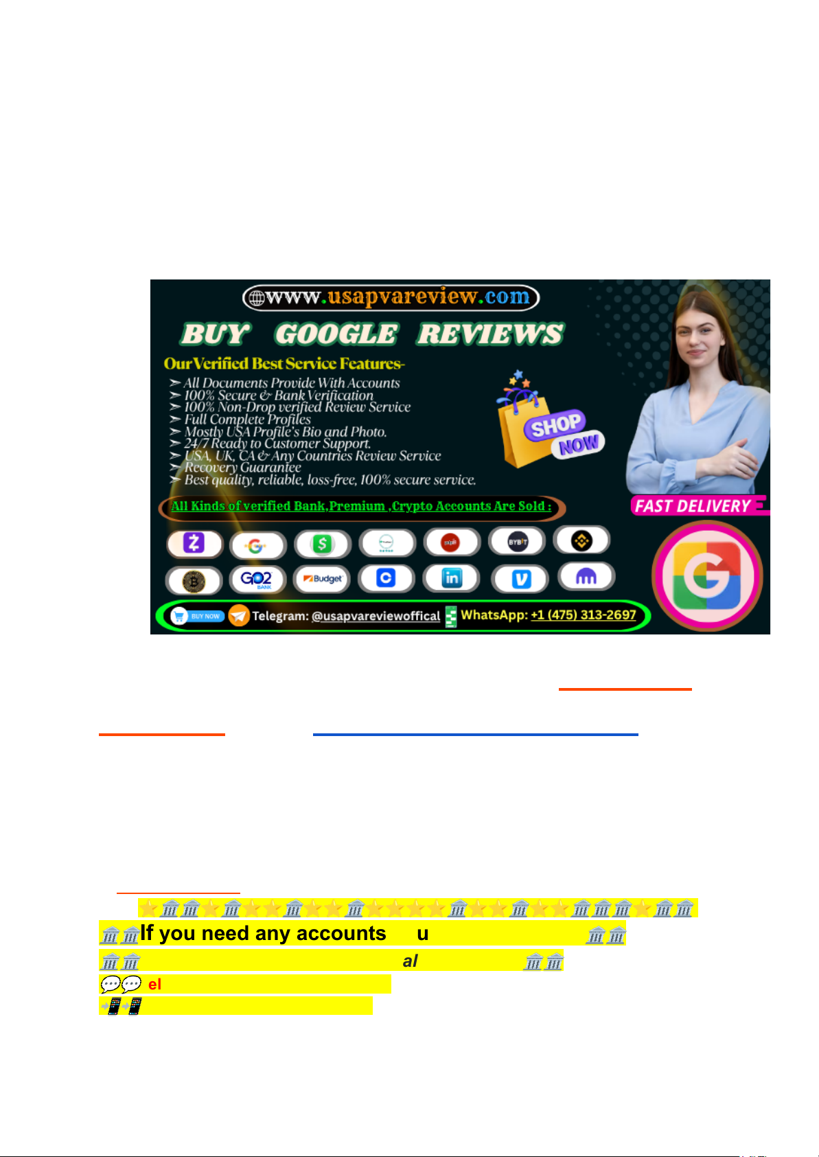 Our Account Service Features- 1. All reviews will be email verified. 2. Reviews will be carefully spell-checked and genuine. 3. Reviews will be crafted using attractive and engaging words. 4. All reviews are offered at a cheap price. 5. 100% satisfaction guaranteed. In USA’s Trustable Platform to Buy Yelp Reviews from USAPVAREVIEW.com Yelp has become one of the most influential review platforms for businesses, especially in the United States. In a market driven by reputation, credibility, and customer satisfaction, Yelp reviews have the power to shape consumer decisions and either build or break a brand. For businesses seeking to strengthen their online reputation, platforms like USAPVAREVIEW.com have emerged as reliable sources to buy Yelp reviews from the USA.⭐🏛🏛⭐🏛⭐⭐🏛⭐⭐🏛⭐⭐⭐⭐🏛⭐⭐🏛⭐⭐🏛🏛🏛⭐🏛🏛 🏛🏛If you need any accounts you can contact us.🏛🏛 🏛🏛To Get Fully Help 24/7 Hours, Talk to us Now 🏛🏛 💬💬Telegram: @usapvareviewoffical 📲📲 WhatsApp: +1 (475) 313-2697 https://usapvareview.com/product/buy-yelp-reviews/ https://usapvareview.com/product/buy-yelp-reviews/ http://usapvareview.com https://usapvareview.com/product/buy-yelp-reviews/ 🏛💬 Skype: UsaPVA Review Visit Website or choose favourite accounts and see accounts price: 🌏🌏 WWW.Usapvareview.Com ⭐🏛🏛⭐🏛⭐⭐🏛⭐⭐🏛⭐⭐⭐⭐🏛⭐⭐🏛⭐⭐🏛🏛🏛⭐🏛🏛 Key Takeaways ● USAPVAREVIEW.com is a trusted U.S.-based platform for buying authentic Yelp reviews. ● Yelp reviews directly influence customer behavior and local search rankings. ● Buying Yelp reviews can boost trust, visibility, and brand reputation. ● There is a structured and safe way to purchase reviews to avoid platform penalties. ● Leveraging positive Yelp reviews helps businesses gain a competitive edge. ● Ethical purchasing from verified sources ensures long-term credibility. What Is the Fact to Buying Yelp Reviews from the USA? The idea of buying Yelp reviews may initially raise concerns, but the fact is that many companies discreetly use this strategy to jump-start their reputation, especially when launching or competing in saturated markets. Yelp reviews from USA-based profiles carry more weight, especially when they come from verified and trusted sources. Customers are more likely to trust a review that seems local, detailed, and genuine. USAPVAREVIEW.com ensures all reviews are written by real users with U.S. accounts, maintaining both authenticity and effectiveness. Additionally, buying reviews from within the USA ensures your business stays relevant in local searches and appeals to your target demographic. This local relevance is critical when building trust with new customers. Buy Yelp Reviews That Really Work Many platforms promise Yelp reviews, but not all deliver quality, permanency, or trust. The reason USAPVAREVIEW.com stands out is due to their high-quality U.S.-based profiles, consistent delivery, and a natural, human-like review pattern that helps you avoid Yelp’s spam filters. Here’s what makes their reviews really work: https://join.skype.com/invite/xuop2BfDEo9j https://usapvareview.com/product/buy-verified-cash-app-account/ http://www.usapvareview.com ● Use of aged and active Yelp accounts ● Custom review text options (business-specific) ● Reviews spread over time for organic look ● Support for multiple industries (restaurants, services, retail, etc.) ● Guaranteed delivery with replacement policies These reviews don’t just sit there—they drive customer engagement, improve your local SEO, and serve as social proof. Why Companies Prioritize Yelp Reviews and How the Platform Functions Yelp is one of the top platforms for finding local businesses. Whether you’re running a restaurant, spa, law firm, or repair service, chances are that your potential customers are looking you up on Yelp. Yelp’s algorithm values: ● Number of reviews ● Review quality (length, detail, sentiment) ● Reviewer credibility (active users, verified accounts) ● Recency and frequency of reviews Businesses with a steady stream of positive reviews naturally rank higher in local listings and search results. That’s why companies now consider Yelp reviews an essential investment in their marketing budget. Moreover, Yelp affects brand image in ways no paid ad can. Consumers believe reviews are unbiased and personal. Thus, prioritizing Yelp means prioritizing social proof, trust, and visibility. How to Purchase Yelp Reviews in the USA? The process to buy Yelp reviews via USAPVAREVIEW.com is simple and secure. Here’s how to do it effectively: Step-by-Step Guide: 1. Visit USAPVAREVIEW.com ○ Navigate to the Yelp section and review pricing/packages. 2. Choose a Review Package https://en.wikipedia.org/wiki/Yelp ○ Select based on the number of reviews, delivery time, and custom content needs. 3. Provide Business Details ○ Business name, location, Yelp link, and any review suggestions you have. 4. Select Profile Diversity ○ Option to request mixed profiles (age, gender, locations) for authenticity. 5. Make Payment ○ Secure payment via accepted methods (crypto, PayPal, cards, etc.). 6. Wait for Delivery ○ Reviews start appearing gradually, ensuring natural posting behavior. 7. Get Support ○ If issues occur, their support team provides replacements or solutions. Buying reviews responsibly means choosing a vendor that avoids mass-spam tactics and focuses on long-term review retention. ⭐🏛🏛⭐🏛⭐⭐🏛⭐⭐🏛⭐⭐⭐⭐🏛⭐⭐🏛⭐⭐🏛🏛🏛⭐🏛🏛 🏛🏛If you need any accounts you can contact us.🏛🏛 🏛🏛To Get Fully Help 24/7 Hours, Talk to us Now 🏛🏛 💬💬Telegram: @usapvareviewoffical 📲📲 WhatsApp: +1 (475) 313-2697 🏛💬 Skype: UsaPVA Review Visit Website or choose favourite accounts and see accounts price: 🌏🌏 WWW.Usapvareview.Com ⭐🏛🏛⭐🏛