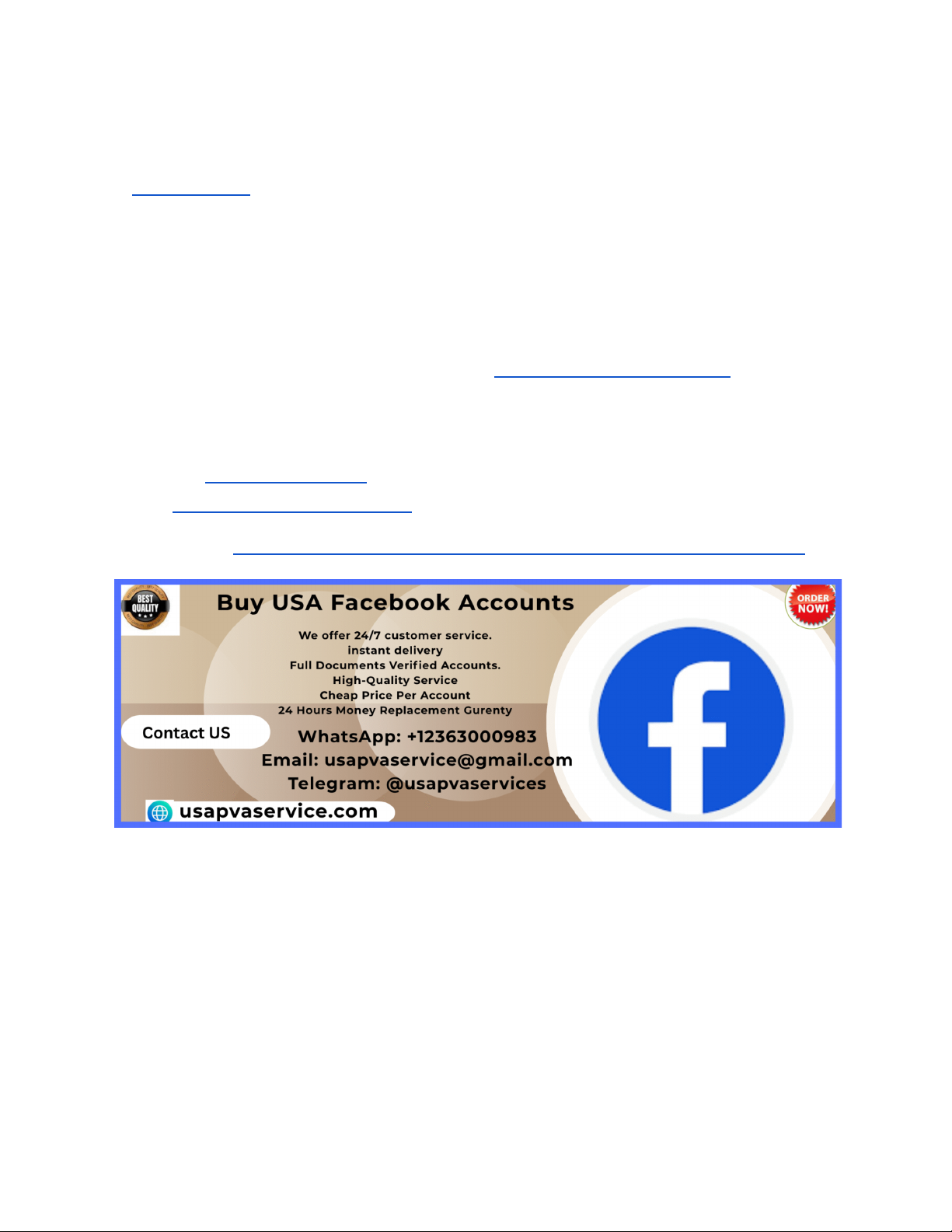 Buy USA Facebook Accounts with Facebook Ads & Marketplace Ready At usapvaservice, we understand the importance of having a robust and reliable Facebook account to maximize your advertising efforts and marketplace interactions. Our USA Facebook accounts are fully prepared, verified, and optimized for immediate use, ensuring you can hit the ground running. Whether you're an entrepreneur, marketer, or business owner, acquiring ready-to-use accounts can save you time and help you achieve your marketing goals faster. Our accounts come with active Facebook Ads and Marketplace features already enabled, providing you a seamless experience. We prioritize quality, security, and authenticity, so your campaigns will run smoothly without interruptions or restrictions. With years of experience in social media services, usapvaservice is your trusted partner for premium Facebook accounts tailored to your needs. If You Want more Information, Just Contact us now: WhatsApp: +12363000983 Telegram: @usapvaservices Email: usapvaservice@gmail.com Website Link: https://usapvaservice.com/product/buy-usa-facebook-accounts/ Premium USA Facebook Accounts with Verified Identity Our USA Facebook accounts are fully verified, ensuring your account authenticity and reducing the risk of suspension or restrictions. Verification involves authentic profile details, including real US-based information, which aligns with Facebook's policies. This verification process guarantees that your account appears genuine, making it easier to run targeted ads and utilize Facebook Marketplace effectively. Verified accounts also help in building trust with your audience, especially when promoting products or services. We ensure that each account has a history of active engagement, real connections, and legitimate contact details. By choosing verified USA Facebook accounts from usapvaservice, you can confidently scale your marketing campaigns without worrying about account bans or limitations. Ready-to-Use Facebook Accounts for Immediate Campaign Launch https://usapvaservice.com/product/buy-usa-facebook-accounts/ https://usapvaservice.com/product/buy-usa-facebook-accounts/ https://imgur.com/user/usapvaservices https://usapvaservice.com/product/buy-usa-facebook-accounts/ Time is money, and with our ready-to-use Facebook accounts, you can launch your campaigns instantly. These accounts are pre-configured with active Facebook Ads and Marketplace features, eliminating the lengthy setup process. Perfect for businesses that need quick deployment, our accounts come with existing ad histories, audiences, and marketplace activity. This setup allows you to start targeting your ideal customer base the moment you activate the account. Whether you’re running local promotions or national campaigns, our ready-to-go accounts give you a competitive edge. Save valuable time and resources by purchasing an account that’s prepared for immediate use, helping you reach your marketing goals faster and more efficiently. Secure and Safe Accounts with Proven Track Record Security is paramount when dealing with social media accounts. At usapvaservice, we prioritize providing secure accounts that have a proven track record of safe operation. Our accounts are created using white-hat methods, avoiding any shady practices that could lead to bans or restrictions. Each account undergoes rigorous checks to ensure stability and authenticity. We also provide guidance on best practices for account management to prevent any security breaches. Our goal is to offer accounts that not only look genuine but also operate smoothly over time. Investing in our secure accounts means fewer worries about account shutdowns and a more reliable platform for your business activities. High-Quality USA Phone Numbers for Account Verification To ensure the authenticity of our Facebook accounts, we provide high-quality USA phone numbers for verification purposes. These numbers are active, verified, and linked directly to the accounts, facilitating seamless verification processes. Using real US phone numbers reduces the risk of account restrictions, especially in regions with strict verification policies. Our phone numbers are sourced from reputable providers, ensuring they are active and reliable. This setup enhances the credibility of your account, making it easier to pass Facebook’s verification checks. Whether you need the account for advertising, marketplace sales, or community engagement, our verified phone numbers help you maintain account integrity and trustworthiness. Accounts with Established Facebook Ad Accounts Our USA Facebook accounts come with established ad accounts, allowing you to launch advertising campaigns immediately. These ad accounts are linked to the main profile and have a history of campaigns, which can boost your ad performance. Having an existing ad account reduces the time needed to set up and verify new ad accounts, which can sometimes be a lengthy process. You can start creating new ads, targeting specific audiences, and optimizing campaigns from day one. This feature is especially beneficial for businesses looking for quick scalability and instant ad deployment. Our accounts are designed to give you a head start in your advertising efforts with minimal setup time. Marketplace Ready Accounts for Selling and Listing Facebook Marketplace is a powerful tool for local selling and listing products directly to consumers. Our USA Facebook accounts are fully Marketplace-enabled, allowing you to list and sell products seamlessly. With active Marketplace features, you can upload listings, manage inquiries, and close sales efficiently. Our accounts come with a history of marketplace activity, which helps in building trust with potential buyers. Whether you’re selling electronics, clothing, or services, our accounts are optimized for marketplace success. This feature is ideal for small businesses, entrepreneurs, or anyone looking to expand their sales channels online. Cus