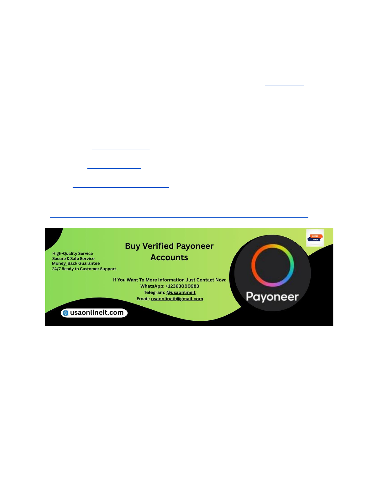 In the digital financial world of 2026, owning a verified and authentic Payoneer account is essential for freelancers, entrepreneurs, and online businesses seeking seamless international transactions. However, with the increasing prevalence of scams and fake accounts, ensuring that you purchase a genuine Payoneer account is more critical than ever. USAOnlineIT specializes in providing reliable, verified Payoneer accounts that meet all safety standards. This guide offers expert tips, trusted sites, and strategies to help you secure 100% real Payoneer accounts in 2026 efficiently and securely. If You Want To More Information Just Contact Now: WhatsApp: +12363000983 Telegram: @usaonlineit Email: usaonlineit@gmail.com website link : https://usaonlineit.com/product/buy-verified-payoneer-accounts/ Understanding the Importance of Authentic Payoneer Accounts in 2026 In 2026, an authentic Payoneer account isn’t just a convenience; it's a necessity for successful online financial operations. Genuine accounts ensure compliance with international financial regulations and prevent potential legal issues. Fake accounts may lead to account suspension, frozen funds, or even legal penalties. Authentic Payoneer accounts offer reliable transaction history, higher withdrawal limits, and consistent access to funds across borders. For businesses, freelancers, and online sellers, authenticity directly impacts credibility and trustworthiness. USAOnlineIT emphasizes the importance of purchasing verified accounts from trusted sources to avoid scams and ensure long-term operational security. Investing in a real, verified Payoneer account is the foundation for building a trustworthy digital financial profile in 2026. https://usaonlineit.com/product/buy-verified-payoneer-accounts/ https://wa.me/message/74UDWDX2TFOWF1 https://t.me/usaonlineit https://usaonlineit.com/product/buy-facebook-ads-accounts/usaonlineit@gmail.com http://usaonlineit.com/product/buy-verified-payoneer-accounts/ Legal Risks of Buying Fake or Unverified Payoneer Accounts While the temptation to buy cheap or unverified Payoneer accounts exists, it carries significant legal and financial risks. Payoneer explicitly prohibits the resale or transfer of accounts under its terms of service. Purchasing fake accounts can lead to immediate suspension, permanent bans, or legal action. Moreover, unverified accounts are often associated with fraud, money laundering, or other illegal activities, which can result in severe penalties. Engaging with untrustworthy sources may also expose your personal data to theft or hacking. USAOnlineIT strongly advocates for legal and verified account purchasing, emphasizing compliance with Payoneer’s policies. Always verify the legitimacy of your source and avoid black-market sellers to protect yourself from financial loss and legal complications. Top Trusted Sites in 2026 to Buy Real Payoneer Accounts In 2026, several reputable sites specialize in providing verified and genuine Payoneer accounts. USAOnlineIT is recognized as a leading platform dedicated to offering authentic accounts that comply with legal standards. Other trustworthy sites include official reseller partnerships, verified digital marketplaces, and specialized account providers. It’s essential to conduct due diligence before purchasing, checking for positive reviews, verified seller profiles, and transparent verification processes. Avoid unverified third-party platforms or shady marketplaces promising unrealistically low prices. USAOnlineIT ensures accounts are sourced securely and verified through legitimate documentation, giving clients peace of mind. Always choose platforms with a proven track record of authenticity and compliance to safeguard your financial interests. How to Identify a Legitimate Seller in 2026 Identifying a reputable seller for Payoneer accounts is crucial to avoid scams. Trustworthy sellers typically have verified profiles, positive customer feedback, and transparent transaction histories. Look for sellers who provide proof of account verification, ownership, or legal compliance. USAOnlineIT maintains strict standards, working only with verified partners to ensure account legitimacy. Be cautious of sellers with suspiciously low prices, lack of reviews, or unwillingness to provide verification documents. Conduct online research, read customer reviews, and verify seller credentials on multiple platforms. Always request proof of account authenticity before proceeding with any purchase. Reliable sellers prioritize transparency, security, and customer satisfaction, minimizing risks associated with fake or compromised accounts. Best Practices for Ensuring the Legitimacy of Your Purchased Payoneer Account Once you purchase a Payoneer account, ensuring its legitimacy through proper practices is vital. First, verify the account’s documentation and ownership details provided by the seller. Second, use secure payment methods such as escrow services or trusted payment gateways to protect your funds. Third, confirm that the account has completed proper verification steps, including KYC procedures. USAOnlineIT recommends maintaining detailed records of all transactions and verification documents. Additionally, change passwords immediately after purchase, enable two-factor authentication, and avoid sharing login details. Regularly monitor account activity for suspicious transactions. Following these best practices guarantees the account remains secure, legitimate, and compliant with Payoneer’s policies, safeguarding your financial activities. The Role of Verification in Confirming Account Authenticity Verification is the cornerstone of establishing an account’s authenticity. Payoneer’s verification process involves confirming identity through official documents such as passports, driver’s licenses, or business registration papers. In 2026, always ensure that the account you purchase has completed these verification steps legitimately. US