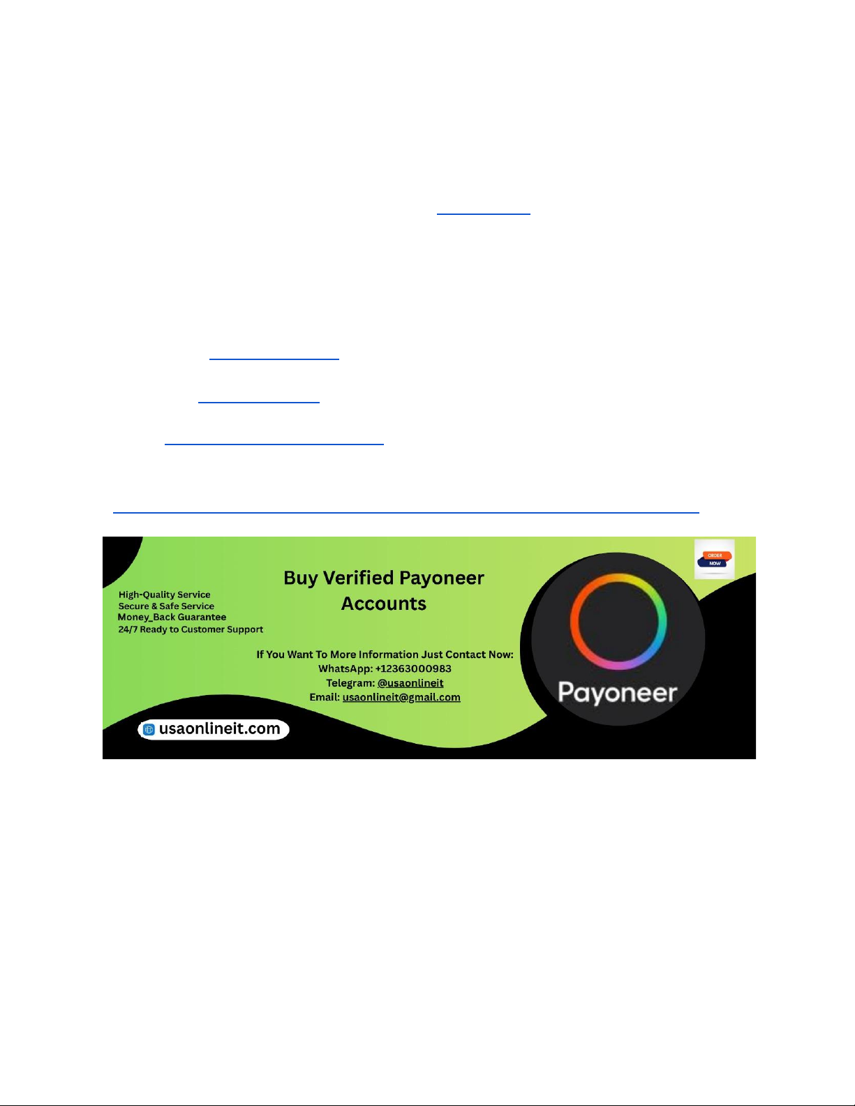 In the rapidly evolving digital economy of 2026, having a verified Payoneer account is essential for freelancers, small business owners, and entrepreneurs worldwide. Payoneer offers seamless international transactions, easy money transfers, and access to global markets. However, acquiring a verified account can be challenging for some, prompting many to seek reliable sources to purchase verified Payoneer accounts. USAOnlineIT has emerged as a trusted platform in this domain, offering verified accounts for clients across the US, UK, and other regions. This guide explores the best places and methods to buy verified Payoneer accounts in 2026, ensuring safety, authenticity, and compliance. If You Want To More Information Just Contact Now: WhatsApp: +12363000983 Telegram: @usaonlineit Email: usaonlineit@gmail.com website link : https://usaonlineit.com/product/buy-verified-payoneer-accounts/ Understanding the Importance of Verified Payoneer Accounts in 2026 A verified Payoneer account provides users with legitimacy and trustworthiness in the digital payment ecosystem. Verification often involves confirming identity through official documents, ensuring the account’s security and compliance with regulatory standards. In 2026, having a verified Payoneer account is more critical than ever, especially with stricter KYC (Know Your Customer) policies globally. Verified accounts help users avoid limitations like withdrawal caps, transaction restrictions, or account suspensions. Additionally, verified accounts facilitate smoother transactions with clients and partners, enhancing credibility. Many online platforms and marketplaces require users to have verified Payoneer accounts for seamless payments. For entrepreneurs and freelancers, owning a verified account ensures uninterrupted access to funds https://usaonlineit.com/product/buy-verified-payoneer-accounts/ https://wa.me/message/74UDWDX2TFOWF1 https://t.me/usaonlineit https://usaonlineit.com/product/buy-facebook-ads-accounts/usaonlineit@gmail.com http://usaonlineit.com/product/buy-verified-payoneer-accounts/ and facilitates international business growth. USAOnlineIT specializes in providing verified Payoneer accounts that meet all compliance standards, ensuring clients receive secure and legitimate accounts for their financial activities. Legal Considerations When Buying Payoneer Accounts in 2026 Purchasing Payoneer accounts is a gray area in terms of legality, as Payoneer’s terms of service explicitly prohibit account resale and sharing. Engaging in such transactions can lead to account suspension or legal penalties. Therefore, it is crucial to understand the risks involved before buying or selling accounts. In 2026, the safest approach is to acquire accounts from reputable sources that ensure compliance with Payoneer’s policies or to use official channels for verification. USAOnlineIT emphasizes transparency and adherence to legal standards, providing accounts that are verified through legitimate means. Users should always verify the credibility of the seller, ensure the accounts are legally obtained, and avoid any black-market transactions that can jeopardize their financial security. Consulting legal advice and understanding regional regulations can help mitigate potential risks associated with buying verified Payoneer accounts. Why Choose USAOnlineIT for Verified Payoneer Accounts in 2026 USAOnlineIT has established itself as a leading provider of verified Payoneer accounts in 2026. Our platform prioritizes security, authenticity, and customer satisfaction. We collaborate with trusted partners and follow strict verification procedures to ensure that every account we provide is legitimate and compliant with Payoneer’s policies. Our clients benefit from fast delivery, secure transactions, and ongoing support. Unlike shady marketplaces, USAOnlineIT emphasizes transparency and offers accounts tailored to users’ regional requirements, including US, UK, and other countries. Our reputation is built on trust, security, and professional service, making us the go-to source for verified Payoneer accounts. Whether you are a freelancer, online seller, or business owner, choosing USAOnlineIT guarantees a seamless experience and peace of mind in your financial transactions. Top 5 Online Marketplaces to Buy Verified Payoneer Accounts in 2026 In 2026, several online marketplaces facilitate the purchase of verified Payoneer accounts. However, not all are reliable or legitimate. The top five platforms include established marketplaces with proven track records, customer reviews, and secure payment options. These include platforms like Paxful, LocalBitcoins, and specialized digital asset marketplaces. USAOnlineIT recommends conducting due diligence before engaging with any marketplace, verifying seller reviews, and ensuring secure payment methods. While some platforms may offer lower prices, the risk of scams or account suspensions remains high. Therefore, trusted marketplaces with verified seller profiles and buyer protection policies are preferred. Always prioritize security, legality, and account authenticity when choosing a marketplace to buy Payoneer accounts in 2026. How to Identify a Legitimate Seller for Payoneer Accounts Identifying a legitimate seller is crucial to avoid scams and ensure the safety of your funds. Reputable sellers typically have verified profiles, positive customer reviews, and transparent transaction histories. Check for seller ratings, feedback, and any proof of previous successful transactions. USAOnlineIT invests heavily in maintaining a trustworthy network of verified sellers, ensuring all accounts are obtained through legal and compliant means. Additionally, legitimate sellers provide clear communication, detailed account information, and post-sale support. Avoid sellers that offer suspiciously low prices, lack reviews, or refuse to provide verification documentation. Conduct due diligence, ask for proof of account authent