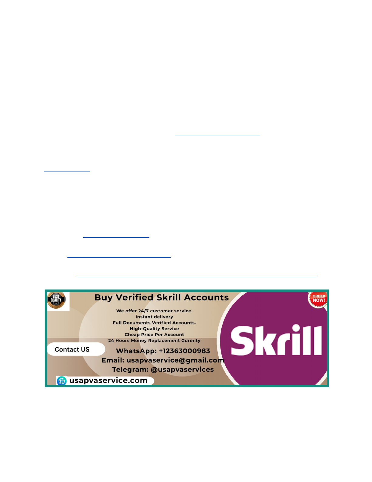 Buy Verified Old Skrill Accounts for Business & Personal Use In today’s fast-moving digital economy, online payment flexibility is no longer optional—it’s essential. Skrill has become one of the most widely used e-wallets for international transactions, online businesses, freelancers, gamers, and digital marketers. As competition increases and compliance rules tighten, many users prefer verified old Skrill accounts to ensure smoother transactions, higher trust scores, and fewer limitations. This guide is designed to help you understand everything about buying verified old Skrill accounts for both business and personal use, with a strong focus on safety, compliance awareness, and long-term usability. At usapvaservice, we emphasize transparency, quality, and customer support so buyers can make informed decisions that align with their goals. If You Want more Information, Just Contact us now: WhatsApp: +12363000983 Telegram: @usapvaservices Email: usapvaservice@gmail.com Visit us : https://usapvaservice.com/product/buy-verified-skrill-accounts/ What Is a Verified Old Skrill Account https://usapvaservice.com/product/buy-verified-skrill-accounts/ https://usapvaservice.com/product/buy-verified-skrill-accounts/ http://@usapvaservices https://usapvaservice.com/product/buy-verified-skrill-accounts/ A verified old Skrill account is an account that was created in the past, has a transaction history, and has completed Skrill’s verification processes such as email, phone, and identity checks. Older accounts typically carry more trust within the Skrill ecosystem because they demonstrate longevity and usage stability. For businesses and individuals, this means fewer sudden restrictions and a more reliable experience. Verified status ensures that the account has passed essential compliance checks, reducing friction when sending or receiving funds. When sourced responsibly, these accounts can save time compared to building a new account from scratch. However, understanding what “verified” and “old” truly mean is crucial, as not all sellers maintain the same standards. At usapvaservice, accounts are reviewed carefully so buyers know exactly what they are getting before making a decision. Why Businesses Prefer Old Skrill Accounts Businesses operating online often deal with recurring payments, international clients, and multiple payment gateways. Old Skrill accounts are preferred because they usually have higher credibility and fewer limitations. A mature account is less likely to trigger automated security reviews during high-volume transactions. This reliability helps businesses maintain cash flow and avoid delays. Additionally, older accounts often integrate more smoothly with merchant platforms, affiliate networks, and digital services. For companies scaling their operations, time saved on verification and reduced risk of sudden freezes can translate into real financial benefits. Businesses choosing usapvaservice often do so because they value consistency, clear documentation, and post-purchase support that aligns with long-term operational needs. Benefits for Personal Users Personal users also gain advantages from verified old Skrill accounts. Freelancers, remote workers, and online earners often rely on Skrill for fast international transfers and currency exchange. An older, verified account can provide smoother withdrawals, higher trust when receiving payments, and fewer interruptions. Personal users may also appreciate the convenience of avoiding lengthy verification steps. For individuals managing multiple income streams, reliability is key. A stable Skrill account can help ensure that earnings are accessible when needed. At usapvaservice, personal-use buyers receive guidance on best practices so they can use their accounts responsibly and confidently. Understanding Skrill Verification Levels Skrill applies different verification levels depending on user activity, transaction volume, and regulatory requirements. Basic verification may include email and phone confirmation, while higher levels require identity documents and address verification. Verified old accounts typically meet higher standards, making them more versatile. Understanding these levels helps buyers choose accounts that match their intended use. For example, businesses may need accounts with higher limits, while personal users may prioritize ease of access. Transparency around verification is essential to avoid misunderstandings. Usapvaservice provides clear information on verification status so buyers can make informed choices without confusion. Compliance and Responsible Usage Compliance is a critical aspect of using any financial account. Skrill operates under strict regulatory frameworks, and users must adhere to applicable laws and platform policies. Buying an account does not remove the responsibility of lawful use. Responsible usage includes avoiding prohibited activities, maintaining accurate information, and following transaction limits. Educated buyers are less likely to face issues such as account reviews or restrictions. At usapvaservice, we encourage ethical use and provide educational resources to help clients understand compliance expectations, ensuring a more sustainable experience. Security Features of Skrill Accounts Skrill accounts include multiple security features such as two-factor authentication, transaction monitoring, and fraud detection systems. Older accounts that have been used responsibly may show stable behavior patterns, which can contribute to smoother operation. However, security ultimately depends on the user’s actions. Using strong passwords, enabling additional security options, and monitoring account activity are essential practices. Usapvaservice emphasizes security awareness so buyers can protect their investments and maintain long-term account health. How Old Accounts Reduce Transaction Issues New accounts often face stricter scrutiny during initial transactions, which can resu