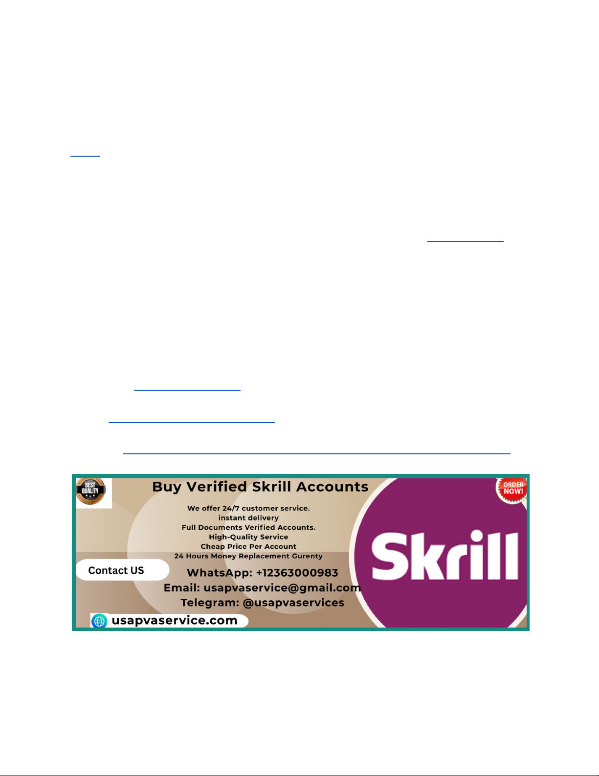 Complete Guide to Buy Skrill Accounts Safely In USA Understanding Skrill and Why It Is Popular in the USA Skrill is one of the most widely used digital payment platforms in the world, especially in the United States. It allows users to send, receive, and store money securely while supporting international transactions with low fees. Many online businesses, freelancers, affiliate marketers, gamers, and crypto traders prefer Skrill because of its speed, flexibility, and global acceptance. In the USA, Skrill is popular for cross-border payments, online shopping, betting platforms, and digital services. Its ability to connect with bank accounts, cards, and other wallets makes it a powerful financial tool. Because of these benefits, demand for ready-made Skrill accounts has grown rapidly. People often look for verified or aged accounts to avoid delays, restrictions, or long verification processes. Understanding how Skrill works and why it is trusted is the first step toward buying Skrill accounts safely in the USA. When you know the platform’s value, you can make smarter decisions and avoid risky sellers or low-quality accounts. If You Want more Information, Just Contact us now: WhatsApp: +12363000983 Telegram: @usapvaservices Email: usapvaservice@gmail.com Visit us : https://usapvaservice.com/product/buy-verified-skrill-accounts/ Why People Choose to Buy Skrill Accounts Instead of Creating New Ones Many users prefer buying Skrill accounts rather than creating new ones from scratch. One major reason is time. Creating and verifying a new Skrill account in the USA can take days or even https://usapvaservice.com/product/buy-verified-skrill-accounts/ https://usapvaservice.com/product/buy-verified-skrill-accounts/ http://@usapvaservices https://usapvaservice.com/product/buy-verified-skrill-accounts/ weeks, especially if additional documents are requested. Bought accounts are usually already verified and ready for use. Another reason is business scalability. Digital marketers, eCommerce sellers, and affiliate professionals often need multiple accounts for different platforms or clients. Buying accounts helps them scale faster. Additionally, aged Skrill accounts tend to have higher trust scores, fewer limitations, and smoother transaction histories. This reduces the risk of sudden account holds or transaction reviews. People also choose to buy accounts to access platforms that require older payment profiles. When done safely through a trusted provider like usapvaservice, buying Skrill accounts becomes a practical and efficient solution for users in the USA. Types of Skrill Accounts Available in the Market Before buying, it is important to understand the different types of Skrill accounts available. The most common types include fresh accounts, verified accounts, aged accounts, PVA (phone-verified accounts), and bulk accounts. Fresh accounts are newly created and usually unverified, making them cheaper but riskier. Verified Skrill accounts come with identity verification completed, which is essential for higher transaction limits. Aged accounts are older and often considered more stable and trusted by Skrill systems. PVA Skrill accounts include phone verification, adding an extra layer of authenticity. Bulk Skrill accounts are ideal for businesses that need multiple accounts at once. Each type serves a different purpose, and choosing the right one depends on your goals. Reliable sellers like usapvaservice clearly explain account types so buyers can make informed decisions and avoid misunderstandings. Importance of Buying Verified Skrill Accounts in the USA Verification is a critical factor when using Skrill in the USA. Verified accounts allow higher sending and receiving limits, faster transactions, and better security. Unverified accounts are more likely to face restrictions, freezes, or sudden closures. When you buy a verified Skrill account, you save time and reduce risk. Verification typically includes email, phone, and identity checks. In the USA, compliance requirements are strict, so verified accounts are essential for smooth usage. Businesses especially benefit from verified accounts because they can process larger volumes without interruptions. A trusted provider like usapvaservice ensures that accounts are properly verified and compliant, helping users operate confidently without worrying about compliance issues or sudden account problems. How Aged Skrill Accounts Improve Safety and Stability Aged Skrill accounts are highly valued because they appear more trustworthy to payment systems. These accounts have a usage history, which reduces the chances of automated security flags. In the USA, where financial platforms closely monitor activity, aged accounts offer better stability. They are less likely to trigger verification reviews or transaction delays. Aged accounts are especially useful for long-term business operations, affiliate marketing, and international payments. Buying aged Skrill accounts from a reputable source ensures that the account history is clean and safe. Providers like usapvaservice focus on quality, ensuring aged accounts are maintained properly before delivery. This makes them ideal for users who want reliability and peace of mind. Risks of Buying Skrill Accounts from Untrusted Sources Buying Skrill accounts from unknown or untrusted sellers can be risky. Common problems include recycled accounts, fake verification, shared access, or accounts that get banned shortly after purchase. Some sellers disappear after payment, offering no support. Others sell accounts created using stolen or low-quality data, which leads to permanent suspension. In the USA, such issues can also create legal and financial complications. That is why choosing a trusted provider is crucial. usapvaservice minimizes these risks by delivering authentic, unique, and secure accounts with proper after-sales support. Understanding the risks helps buyers stay cautious and prioritize safety over cheap price