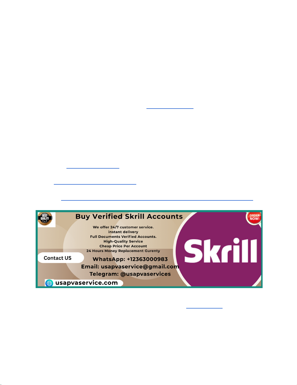 Authentic Old Skrill Accounts for Personal & Business Use: Buy Today In today’s fast‑paced digital economy, Skrill has become one of the most trusted and widely used online payment platforms for both personal and business transactions. However, many users face limitations when opening new Skrill accounts due to verification delays, usage caps, or regional restrictions. This is where authentic old Skrill accounts offer a powerful solution. Old Skrill accounts come with a transaction history, aged credibility, and reduced risk of sudden limitations, making them highly valuable for serious users. If You Want more Information, Just Contact us now: WhatsApp: +12363000983 Telegram: @usapvaservices Email: usapvaservice@gmail.com Visit us : https://usapvaservice.com/product/buy-verified-skrill-accounts/ Whether you are an individual freelancer, online trader, or business owner handling high‑volume payments, an aged Skrill account provides stability and trust. At usapvaservice, we focus on delivering 100% authentic old Skrill accounts that are carefully verified and ready for immediate use. These accounts are ideal for users who want a smooth payment experience without unnecessary interruptions. Choosing an authentic old account helps you save time, avoid verification stress, and operate confidently in competitive online markets. https://usapvaservice.com/product/buy-verified-skrill-accounts/ http://@usapvaservices https://usapvaservice.com/product/buy-verified-skrill-accounts/ https://usapvaservice.com/product/buy-verified-skrill-accounts/ What Makes an Old Skrill Account Truly Authentic An authentic old Skrill account is not just about age; it is about legitimacy, clean history, and proper verification. Many sellers claim to offer “aged” accounts, but only a few provide accounts that are genuinely created years ago and maintained correctly. A real old Skrill account includes original registration details, verified email access, and no record of suspicious activity. Authenticity also means the account has never been involved in chargebacks, fraud, or policy violations. At usapvaservice, every Skrill account goes through a strict quality check to ensure it meets these standards. We verify account age, transaction stability, and compliance with Skrill’s terms. This level of authenticity reduces the risk of account suspension and increases long‑term usability. When you invest in an authentic old Skrill account, you are investing in reliability, security, and peace of mind for both personal and business transactions. Benefits of Using Old Skrill Accounts for Personal Use For personal users, old Skrill accounts offer unmatched convenience and flexibility. New accounts often come with strict limits on sending, receiving, or withdrawing funds, which can be frustrating. An aged Skrill account typically enjoys higher trust levels, faster transactions, and fewer verification prompts. This makes it ideal for freelancers, gamers, affiliate marketers, and international buyers. Using an old Skrill account allows personal users to manage multiple online payments smoothly without frequent interruptions. You can link cards, withdraw funds, and make global payments with confidence. usapvaservice ensures that each personal‑use account is clean, secure, and easy to operate. If you value privacy, speed, and uninterrupted access to your funds, an authentic old Skrill account is a smart choice for personal financial management. Why Businesses Prefer Aged Skrill Accounts Businesses require stable payment solutions that can handle volume, consistency, and trust. New Skrill accounts often struggle with sudden freezes or compliance reviews when transaction volume increases. Old Skrill accounts, on the other hand, already have a history that builds confidence with Skrill’s system. For eCommerce stores, digital service providers, and international businesses, an aged Skrill account ensures smoother cash flow and reliable payment processing. At usapvaservice, we understand business needs and provide old Skrill accounts suitable for long‑term commercial use. These accounts help businesses avoid operational delays, maintain customer trust, and scale payments without unnecessary risk. Aged Skrill accounts are not just tools; they are strategic assets for serious online businesses. Key Features of Our Old Skrill Accounts Our old Skrill accounts come with features designed for immediate usability and long‑term stability. Each account is aged, verified, and carefully maintained to ensure compliance. Features include clean transaction history, verified email access, and secure login credentials. usapvaservice focuses on quality over quantity. We do not recycle or resell accounts, ensuring exclusivity for each buyer. Our accounts are suitable for both personal and business use, making them versatile for different needs. With strong account history and proper setup, these Skrill accounts help users operate confidently in competitive digital environments. Quality features translate directly into performance, security, and user satisfaction. Security and Privacy Assurance Security is a top priority when purchasing any digital account. Authentic old Skrill accounts must be handled with care to avoid breaches or misuse. At usapvaservice, we follow strict security protocols during account delivery. All credentials are shared securely, and guidance is provided for safe account handling. Privacy is equally important. We ensure that no third party has access to your account after delivery. Our process is designed to protect your data and financial activities. By choosing a trusted provider, you reduce the risk of unauthorized access and future complications. Secure handling ensures that your old Skrill account remains fully under your control from day one. How Old Skrill Accounts Reduce Account Limitations One of the biggest advantages of old Skrill accounts is reduced limitations. New accounts are often flagged for rev