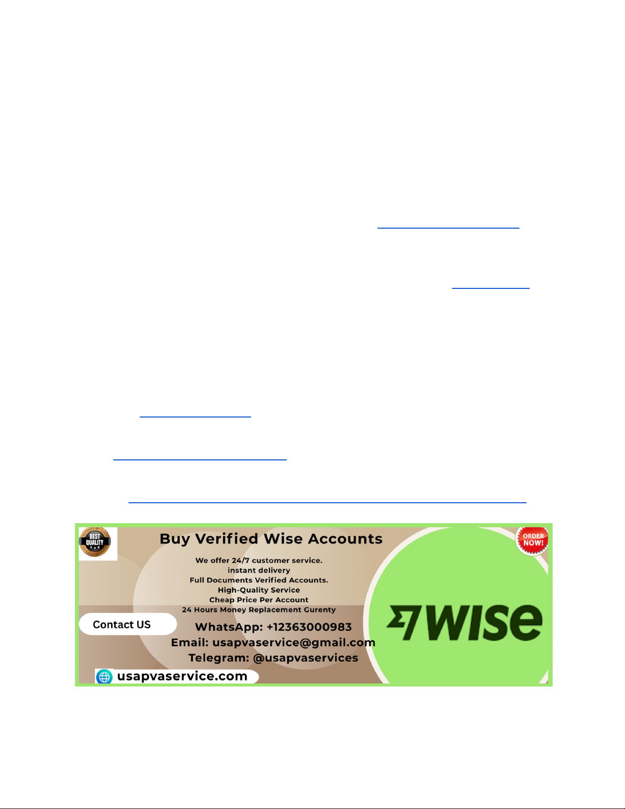 Buy Old Wise Accounts Securely – Ready to Use In today’s global digital economy, Wise (formerly TransferWise) has become one of the most trusted platforms for international money transfers, multi-currency holding, and online business payments. As demand grows, many entrepreneurs and online professionals look for aged or old Wise accounts that are already established and ready to use. Buying old Wise accounts securely can save time, reduce verification delays, and help users start transactions immediately. However, security, authenticity, and reliability are critical factors. This guide explains everything you need to know about purchasing old Wise accounts safely, legally aware, and with long-term usability in mind. With professional service providers like usapvaservice, buyers can reduce risks and ensure smooth financial operations. If You Want more Information, Just Contact us now: WhatsApp: +12363000983 Telegram: @usapvaservices Email: usapvaservice@gmail.com Visit us :https://usapvaservice.com/product/buy-verified-wise-accounts/ Understanding What Old Wise Accounts Are https://usapvaservice.com/product/buy-verified-wise-accounts/ https://usapvaservice.com/product/buy-verified-wise-accounts/ http://@usapvaservices https://usapvaservice.com/product/buy-verified-wise-accounts/ Old Wise accounts refer to accounts that were created months or years ago and have an established history on the Wise platform. These accounts often appear more trustworthy to payment systems because they are not brand new. Age plays an important role in financial platforms, as older accounts tend to face fewer limitations compared to newly created ones. An old Wise account may already have verified email access, completed identity checks, and in some cases previous transaction history. For online businesses, freelancers, and international traders, these accounts can provide instant usability without waiting through lengthy approval processes. Many users choose old Wise accounts because they help avoid common issues such as temporary holds, frequent reviews, or delayed transfers. When sourced from a trusted provider like usapvaservice, these accounts are prepared carefully to meet buyer expectations while focusing on security and stability. Why People Prefer Buying Aged Wise Accounts The main reason people prefer aged Wise accounts is convenience. Creating a new Wise account from scratch can take time, especially when identity verification and address confirmation are required. Old accounts are already past the “new account risk phase,” which often triggers extra monitoring. Additionally, aged Wise accounts are highly beneficial for international businesses dealing with multiple currencies. They can help establish credibility faster with clients, payment partners, and marketplaces. Freelancers working with overseas clients also benefit from faster payouts and fewer interruptions. By purchasing through usapvaservice, buyers get accounts that are tested, stable, and ready to use immediately, which significantly reduces operational downtime and startup friction. Key Benefits of Using Ready-to-Use Wise Accounts Ready-to-use Wise accounts offer immediate access to Wise’s core features such as holding multiple currencies, sending international payments, and receiving funds globally. These accounts are especially useful for time-sensitive projects where delays can cause financial losses. Another benefit is reduced account warming time. Since the account already has age, users can start moderate transactions without triggering automatic security flags. This makes operations smoother and more predictable. Business owners also appreciate the flexibility of having an account that is already structured for professional use. Providers like usapvaservice ensure that each account is delivered with proper access details, making the transition process simple and secure. Security Risks When Buying Wise Accounts Buying Wise accounts from unreliable sources can expose users to serious risks. These include account recovery by the original owner, sudden account freezes, or loss of funds. Security is the most critical factor when purchasing any financial account. Unsafe sellers may reuse information, sell the same account to multiple buyers, or provide accounts created with fake details. Such practices can result in permanent bans. That is why choosing a reputable provider like usapvaservice is essential. They focus on secure handling, unique account preparation, and buyer confidentiality. Understanding these risks helps buyers make informed decisions and avoid costly mistakes. How to Identify a Trusted Wise Account Seller A trusted Wise account seller should offer transparency, clear communication, and post-sale support. Look for sellers who explain account specifications, age, and limitations upfront. Reviews, reputation, and customer feedback also matter greatly. Reliable providers never rush buyers or hide important details. They also guide buyers on safe usage after purchase. usapvaservice stands out by offering structured delivery, secure credential transfer, and ongoing support. This ensures buyers are not left alone after the transaction and can use their Wise account confidently and safely. Account Verification and Compliance Considerations Wise is a regulated financial platform, so compliance matters. Old Wise accounts should already meet basic verification standards. Buyers must understand that using the account responsibly is crucial to maintaining its long-term health. Proper usage includes avoiding sudden high-volume transactions, maintaining consistent activity patterns, and following Wise’s acceptable use policies. When accounts are sourced from professional providers like usapvaservice, they are typically prepared with compliance awareness in mind. This reduces the chance of reviews or restrictions and supports sustainable usage. Why Account Age Matters in Financial Platforms Account age is an important trus