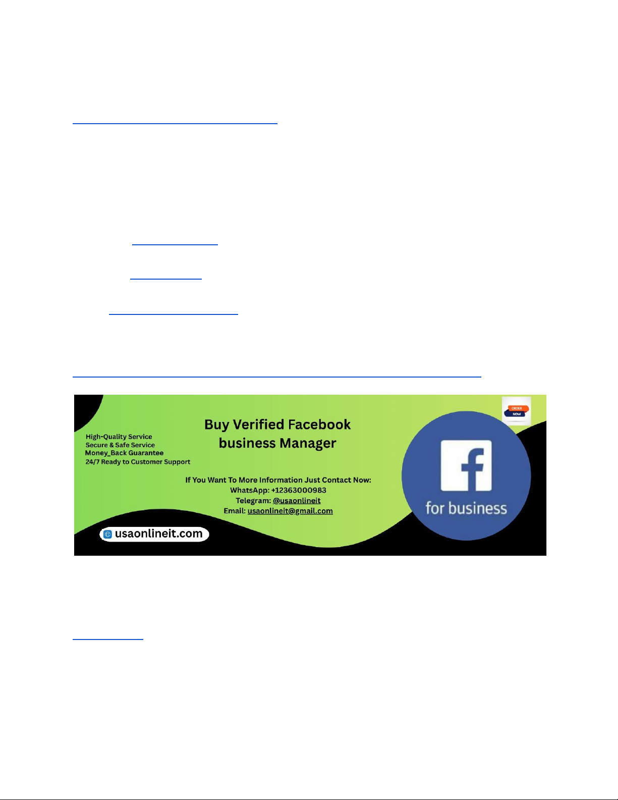 Introduction to Verified Facebook Business Manager Accounts Facebook Business Manager accounts are essential tools for businesses and marketers who want to manage multiple ad accounts, pages, and assets in one secure place. Verified Facebook Business Manager accounts take this a step further by providing legitimacy and trust within Facebook’s ecosystem. They allow higher ad limits, improved campaign stability, and access to advanced features. If You Want To More Information Just Contact Now: WhatsApp: +12363000983 Telegram: @usaonlineit Email: usaonlineit@gmail.com Website Link: https://usaonlineit.com/product/buy-verified-facebook-business-manager/ In 2026, running Facebook ads without verified accounts is increasingly risky. Many unverified accounts face ad restrictions, spending limits, or permanent bans. Buying verified accounts with documents ensures authenticity and reduces the chances of account suspension. USAOnlineIT specializes in delivering verified Facebook Business Manager accounts with documents, offering businesses, agencies, and media buyers a safe and ready-to-use solution. These accounts are fully compliant, verified using real documentation, and ready for instant access. With verified accounts, advertisers can focus on campaign performance, scaling, and ROI instead of account management issues. What Is a Facebook Business Manager Account https://usaonlineit.com/product/buy-verified-facebook-business-manager/ https://usaonlineit.com/product/buy-verified-facebook-business-manager/ https://usaonlineit.com/product/buy-verified-facebook-business-manager/ https://usaonlineit.com/product/buy-verified-facebook-business-manager/ https://usaonlineit.com/product/buy-verified-facebook-business-manager/ https://usaonlineit.com/product/buy-verified-facebook-business-manager/ A Facebook Business Manager account is a centralized hub for managing Facebook pages, ad accounts, Instagram accounts, pixels, and catalogs. It separates personal profiles from business operations, ensuring security and professional workflow. Verified Facebook Business Manager accounts with documents provide additional trust and legitimacy. These accounts are officially verified by Facebook through proper business documents, such as business registration certificates, tax IDs, and utility bills. Verification signals authenticity and reduces the likelihood of ad account restrictions. With a verified account from USAOnlineIT, advertisers gain immediate access to all Facebook advertising tools. This eliminates waiting for verification approval, saving time and minimizing risk. Verified accounts allow advertisers to run campaigns smoothly, scale ad spend, and manage multiple assets effectively. Why Buying Verified Accounts with Documents Is Important Verification through documents ensures the account’s authenticity and compliance with Facebook’s policies. Accounts with proper documentation are trusted by Facebook’s algorithms and are less likely to face restrictions. Without documents, accounts may remain partially verified or be flagged during high-budget campaigns. This can result in unexpected bans, reduced ad delivery, and wasted ad spend. Documented accounts are also essential for agencies managing multiple clients or high-volume campaigns. USAOnlineIT provides verified Facebook Business Manager accounts with all necessary documentation, offering clients peace of mind. These accounts are fully prepared, allowing advertisers to focus on campaign strategy, optimization, and scaling without worrying about account disruptions. Features of Verified Facebook Business Manager Accounts with Documents Accounts provided by USAOnlineIT come with essential features: full business verification, access to multiple ad accounts, payment method integration, and team permissions. The included documents validate the business legally, ensuring full compliance with Facebook’s policies. Other features include integration with Facebook pixels, Instagram accounts, and catalogs, enabling complete advertising control. Verified accounts also support higher daily spending limits, smoother ad delivery, and improved credibility. By offering accounts with documents, USAOnlineIT ensures that buyers receive reliable, ready-to-use assets. These accounts are ideal for agencies, eCommerce businesses, affiliate marketers, and lead generation companies aiming for stable advertising performance. Benefits of Buying Accounts with Documents Verified Facebook Business Manager accounts with documents provide unmatched reliability. They reduce ad disapprovals, allow higher spending limits, and minimize the risk of account bans. Businesses can start campaigns immediately without worrying about verification delays. Documented accounts also instill trust with clients and partners. Agencies managing multiple campaigns can present verified accounts as official assets, strengthening their credibility. Additionally, these accounts are prepared for long-term use and scalability. USAOnlineIT ensures each account includes complete verification documents, providing a secure foundation for professional Facebook advertising. Verified accounts with documents are a smart investment for businesses seeking sustainable and efficient advertising operations. Who Should Buy Verified Accounts with Documents Digital marketing agencies, eCommerce businesses, affiliate marketers, and media buyers benefit most from verified Facebook Business Manager accounts with documents. Agencies require multiple accounts for client campaigns, while eCommerce businesses need stable accounts to maintain ad continuity. Affiliate marketers rely on verified accounts to safely run campaigns in competitive niches, and media buyers use them to scale high-budget campaigns without interruptions. Even small businesses and service providers benefit from verified accounts to manage ads securely and professionally. USAOnlineIT caters to all these clients by providing verified, documented accounts 