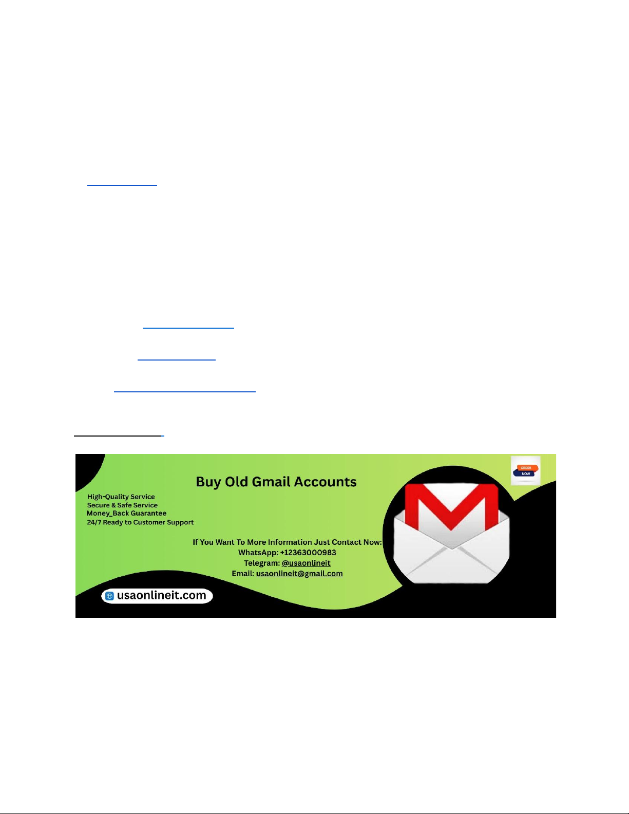Best Sites to Purchase Aged Gmail Accounts for SEO and Marketing At USAOnlineIT, we understand the appeal of aged Gmail accounts for SEO and marketing—but we also know that relying on purchased email accounts is risky, often against major platforms’ terms, and not a sustainable long-term strategy. This article explores the truth behind aged email accounts, why people search for them, and how businesses can achieve the same goals ethically and effectively. If You Want To More Information Just Contact Now: WhatsApp: +12363000983 Telegram: @usaonlineit Email: usaonlineit@gmail.com Website Link : c Understanding Aged Gmail Accounts and Their Perceived Value In the digital marketing world, an “aged Gmail account” refers to an email that has existed for a long period—often years. The idea is that older accounts are seen as more trustworthy or authoritative, especially when creating profiles, signing up for platforms, or building backlinks. https://usaonlineit.com/product/buy-old-gmail-accounts/ https://wa.me/+12363000983 https://t.me/usaonlineit https://usaonlineit.com/product/buy-old-gmail-accounts/ Marketers assume that these aged addresses have fewer flags against them and may pass some form of credibility. However, this belief is mostly myth. Google does not publicly disclose that account age influences SEO or domain authority. What matters more is how accounts are used—whether they are verified, maintained, and act in accordance with terms and best practices. Therefore, the conversation around aged Gmail accounts should be reframed to focus on creating strong, compliant digital assets. Why Marketers Seek Aged Emails for SEO Activities Many marketers believe that aged emails help bypass verification hurdles, improve social signals, or enhance ranking factors on third-party platforms. For example, older accounts might seem less likely to be treated as spam, and thus help in activities such as content sharing, profile creation, or accessing certain SEO tools. Unfortunately, this perception drives some marketers to seek third-party sellers of aged email accounts. From an SEO perspective, relying on external accounts you don’t control exposes your business to dependency on insecure assets. If Google detects suspicious behavior, accounts can be suspended—leading to lost access and potentially harming your brand’s digital footprint. USAOnlineIT encourages marketers to focus on building authority through quality content, ethical SEO practices, and legitimate digital infrastructure instead of chasing shortcuts. Legal and Policy Risks of Buying Gmail Accounts Google’s Terms of Service clearly state that Gmail accounts are non-transferable and for individual or business use under the original creator’s control. Buying or selling Gmail accounts breaches these terms, and could lead to: • Immediate account suspension • Loss of associated services (Google Drive, YouTube, Workspace) • Blocking of your business IP addresses • Legal concerns if accounts are misused For U.S. businesses, privacy and data protection laws also impose obligations around how customer and user data is handled. Using accounts created by unknown third parties may expose you to compliance risks (e.g., CAN-SPAM Act, FTC rules). USAOnlineIT strictly advises compliance with all platform terms and relevant regulations. https://usaonlineit.com/product/buy-old-gmail-accounts/ The Reality: Google Won’t Endorse Aged Accounts for Ranking Despite the popularity of aged accounts in some digital marketing circles, Google does not use Gmail account age as a ranking factor. Search algorithms are far more complex, incorporating hundreds of signals like relevance, content quality, backlinks, site speed, mobile usability, and user engagement metrics. Email age simply isn’t part of this equation. This means investing in legitimate digital practices—content strategy, structured data, UX optimization—offers far better SEO ROI. Email accounts, whether old or new, matter only in terms of secure communication, authentication, and identity verification. USAOnlineIT helps businesses build digital infrastructure that supports SEO success without depending on third-party, potentially compromised accounts. Ethical Risks: Spam, Blacklists, and Domain Reputation Using purchased Gmail accounts can have unintended side effects. Many aged accounts offered for sale are recycled or abused. If these accounts were previously flagged for spam or malicious activity, they could be on internal watchlists or blacklists used by ISPs and marketing platforms. Sending marketing emails from blacklisted accounts damages your sender reputation. This makes it more likely your legitimate campaigns will land in spam folders. Ethical email marketing requires clean sending infrastructure and list management practices. USAOnlineIT provides strategies for building sender reputation organically—such as proper list segmentation, authentication protocols (SPF, DKIM, DMARC), and consistent sending patterns. Alternatives: Creating Legitimate Business Gmail/Google Workspace Accounts Instead of seeking aged Gmail accounts, businesses should create Google Workspace accounts for their domain. This approach gives you: • Professional branding (e.g., name@yourdomain.com) • Full control over account creation and security • Centralized user management • Compliance with terms and policies Google Workspace accounts are not “aged” initially, but they gain credibility over time as they’re used consistently and legitimately. More importantly, they are fully compliant and secure. USAOnlineIT offers support setting up, configuring, and optimizing Google Workspace for businesses of all sizes. Building Account Age the Right Way: Consistency and Activity If your goal is to have reliable accounts that can access platforms effectively, focus on consistency: • Create accounts using a real business domain • Set up proper recovery options and security measure