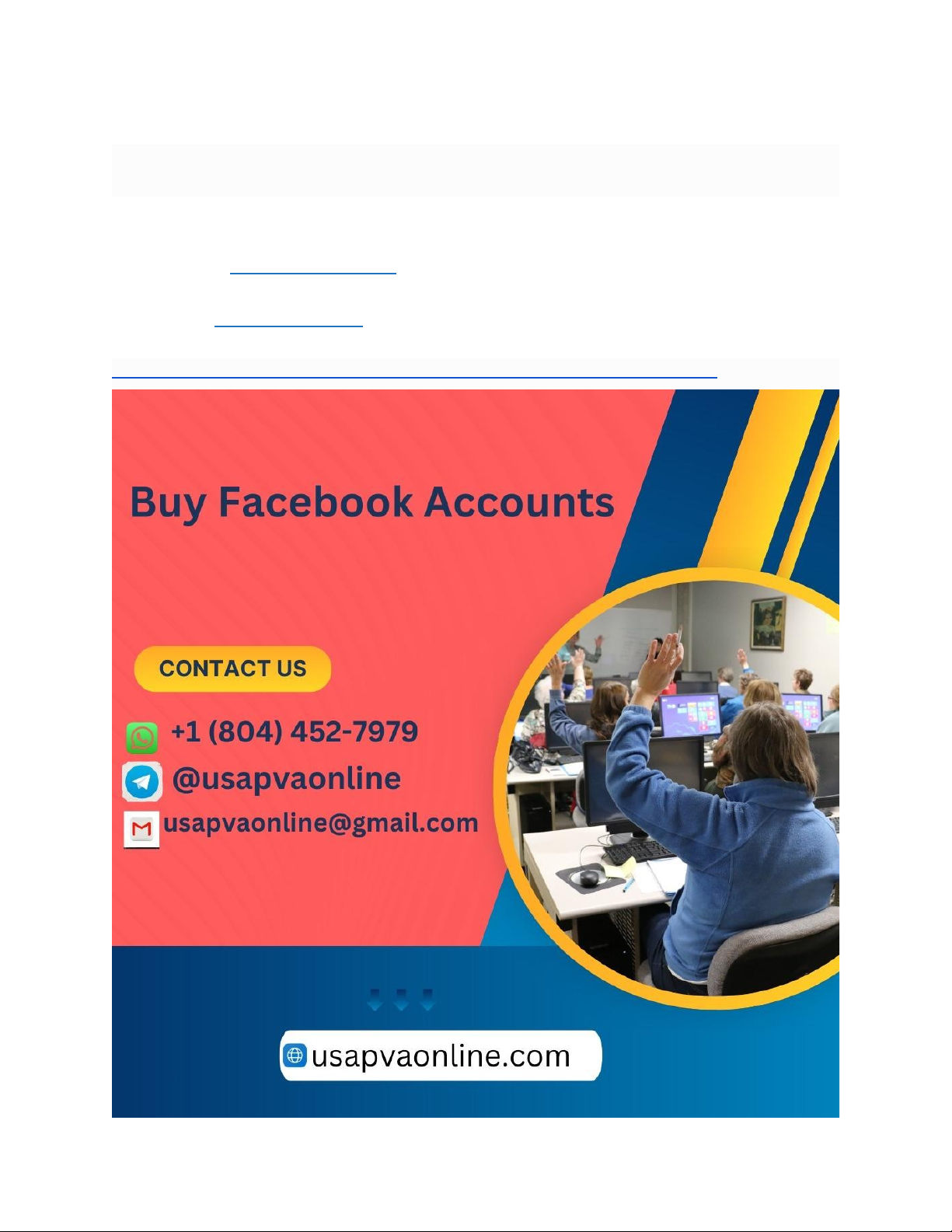 Buy Bulk Aged Facebook Accounts If You Want To More Information Just Contact Now: WhatsApp: +1 (804) 452-7979 Telegram: @usapvaonline Visit website:https://usapvaonline.com/product/buy-facebook-accounts/ Facebook remains the world's largest social network, powering everything from personal connections and community building to massive advertising campaigns, marketplace sales, dropshipping, lead generation, and brand management. But creating new accounts in bulk today is nearly impossible without hitting walls—phone/email verification blocks, instant restrictions, low trust scores, or outright bans due to suspicious activity patterns. That's why marketers, agencies, e-commerce sellers, and growth hackers increasingly search for buy bulk aged Facebook accounts from reputable sources that deliver ready-to-use, high-trust profiles. At usapvaonline, we provide premium bulk aged Facebook accounts that stand out for their quality and longevity. These aren't fresh throwaways; they're naturally aged accounts (often months to years old) with real-looking activity history, completed profiles, friends/connections where appropriate, and strong trust signals that help them pass Facebook's aggressive detection systems. Whether you're scaling ad campaigns, managing multiple pages, warming up profiles for outreach, or running marketplace operations, buying bulk aged accounts from us gives you a serious head start. We prioritize clean, stable accounts that perform reliably for advertising, posting, joining groups, and interacting without triggering quick limits or disables. Fast delivery, secure handover, and flexible quantities make usapvaonline the smart choice for anyone needing volume without the risk. High-Quality Aged Accounts with History Our bulk accounts come pre-aged with organic-looking activity—posts, likes, comments, and profile completion—so they behave like real user profiles and earn higher trust from Facebook's algorithms. Perfect for Facebook Advertising at Scale Run multiple ad accounts safely. Aged profiles linked to Business Managers reduce the chance of bans, allowing bigger budgets and better ROI on campaigns. Ideal for Marketplace & Dropshipping Sell products across regions without restrictions. Aged accounts post listings, respond to buyers, and build credibility faster than brand-new ones. Great for Lead Generation & Outreach Join niche groups, post in communities, send connection requests, or message prospects. Older accounts face fewer limits and look legitimate. Bulk Quantities Tailored to Your Needs Order 10, 50, 100, or more—whatever your project requires. We handle large orders efficiently with consistent quality across every account. Skip Creation & Warm-Up Headaches Avoid spending weeks creating accounts, adding friends, posting content, and slowly warming them up. Buy aged and jump straight to active use. Strong Trust Scores & Lower Ban Risk Accounts with natural age and activity history pass stricter checks, recover easier from flags, and survive longer in competitive niches. Verified Emails & Phone Options Available Many come with attached aged emails (Gmail, Outlook, etc.) and some include phone verification for extra stability when needed. Secure & Discreet Delivery Process We use encrypted methods to send login credentials safely. Your order stays private—no unnecessary data shared, no traces left behind. Reliable Support for Bulk Buyers Need advice on account rotation, proxy pairing, or best practices to maximize lifespan? Our team provides guidance even after delivery. In conclusion, buy bulk aged Facebook accounts is the practical move for anyone serious about scaling on the platform in 2025 and beyond. Fresh accounts simply don't cut it anymore—Facebook's systems catch them too quickly, wasting time and money. usapvaonline solves that problem by offering high-trust, naturally aged profiles in any quantity you need, delivered fast and built to last through real campaigns, sales, and growth strategies. Don't gamble with low-quality or risky sources that deliver bans within days. Choose proven reliability instead. Visit usapvaonline today to explore our bulk aged Facebook accounts—secure your stock, protect your operations, and scale smarter without the usual frustrations. Get started now and see the difference real quality makes! (Word count: approx. 114 image1.jpg