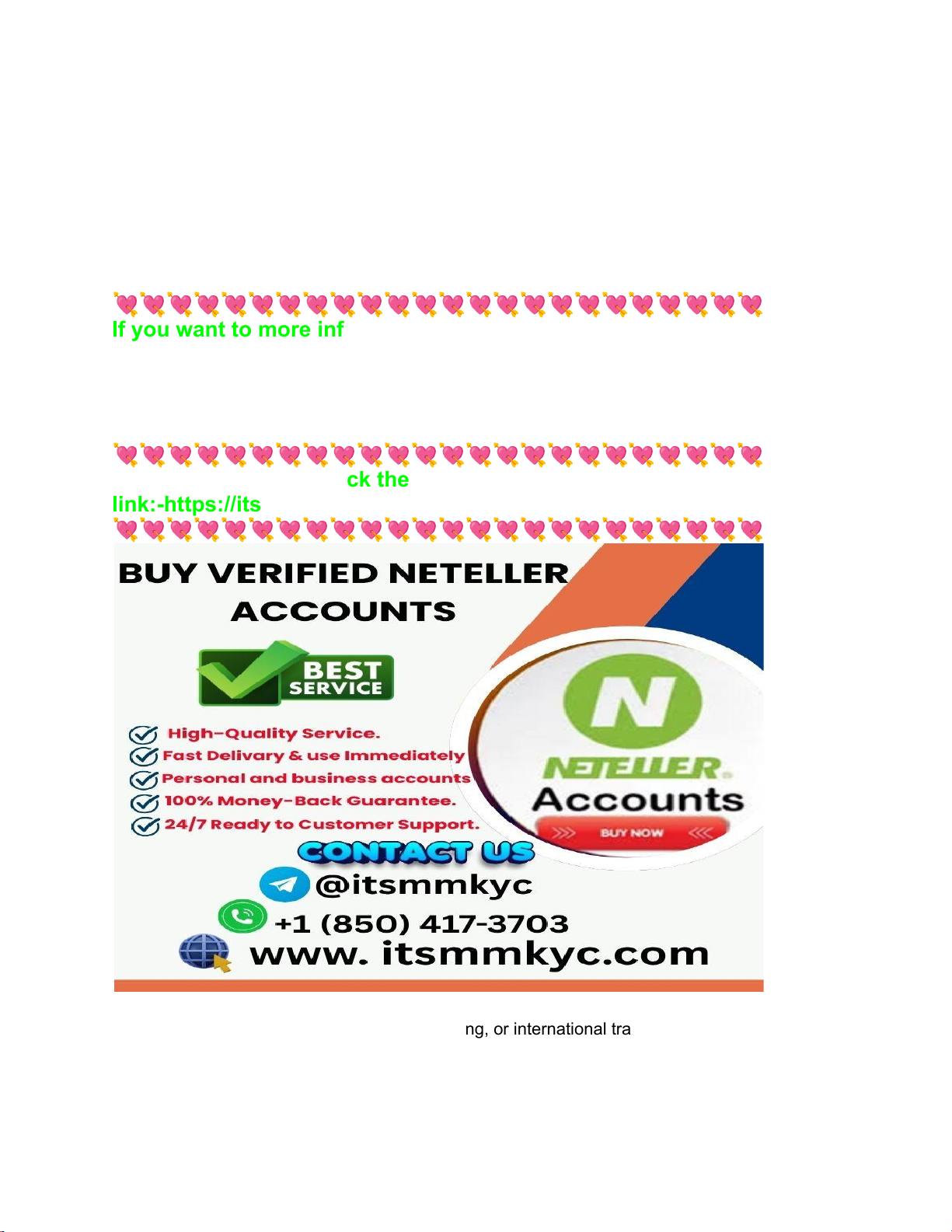 Quickly And Easy 3 Ways to Buy Verified Neteller Acc Today Looking to buy a verified Neteller account quickly and easily? You’re in the right place. 💘💘💘💘💘💘💘💘💘💘💘💘💘💘💘💘💘💘💘💘💘💘💘💘 If you want to more information just contact now. ➤ 24/7 Hours Reply/Contact ➤ Telegram:@itsmmkyc ➤ WhatsApp: +1 (850) 417-3703 ➤ Email:itsmmkyc@gmail.com 💘💘💘💘💘💘💘💘💘💘💘💘💘💘💘💘💘💘💘💘💘💘💘💘 Website Visit Now:- Click the link:-https://itsmmkyc.com/product/reliable-verified-neteller-accounts/ 💘💘💘💘💘💘💘💘💘💘💘💘💘💘💘💘💘💘💘💘💘💘💘💘 Whether you need it for online payments, gaming, or international transfers, having a verified Neteller account can save you time and hassle. But finding a safe and reliable way to get one isn’t always simple. That’s why we’ve put together 8 straightforward methods that anyone can follow. These tips will help you get verified Neteller accounts fast, without stress or confusion. Keep reading—you’re just a few steps away from making your online transactions smoother than ever. Choose Authorized Neteller Vendors Choosing authorized Neteller vendors is key for a safe purchase. These vendors are verified by Neteller to sell accounts and services legally. Buying from them reduces risks of scams and fraud. Authorized vendors follow Neteller’s rules. They protect your money and personal details. You get verified accounts that work smoothly without issues. Avoid vendors that look suspicious or offer too-good-to-be-true deals. Using trusted vendors also means better customer support. They help solve problems fast if something goes wrong. Your buying experience becomes simpler and more reliable. Check Vendor Credentials Look for vendor licenses or certificates on their site. These prove the vendor is allowed to sell Neteller accounts. Confirm these credentials through Neteller’s official channels. Read Customer Reviews Reviews show real buyer experiences. Positive feedback means the vendor is trustworthy. Watch for consistent praise about quick delivery and account quality. Compare Prices Carefully Authorized vendors offer fair and clear prices. Avoid vendors with extremely low or high rates. Unusual prices often signal fake or risky accounts. Verify Secure Payment Methods Choose vendors who use safe payment options. Credit cards and reputable online payments are best. Avoid cash transfers or unknown payment systems. Confirm Account Verification Ensure the Neteller accounts sold are fully verified. Verified accounts prevent future restrictions or bans. Ask vendors for proof of account verification. Use Trusted Online Marketplaces Using trusted online marketplaces is a smart way to buy verified Neteller accounts quickly and easily. These platforms offer a safe environment to find what you need without risking scams. Buyers can check seller ratings and reviews before making a purchase. Trusted marketplaces also provide secure payment methods. This protects your money during transactions. Some even offer buyer protection policies, giving you peace of mind. Another advantage is the wide selection available. You can compare prices and features from different sellers in one place. This makes it easier to find the best option that fits your needs and budget. What Makes An Online Marketplace Trusted? Reputation matters. Trusted marketplaces have a long history of good service. They verify sellers to reduce fraud risks. User reviews and ratings show real experiences. How To Check Seller Credibility Look for high ratings and positive feedback. Avoid sellers with many complaints. Check if the seller has been active for a while. Reliable sellers usually answer questions quickly. Benefits Of Secure Payment Options Trusted marketplaces use secure payment systems. This keeps your payment details safe. Some offer escrow services, holding funds until you confirm delivery. This adds a layer of security. Tips For Using Online Marketplaces Safely Never share your password or personal details. Use strong passwords for your accounts. Contact customer support if you suspect fraud. Always read marketplace policies before buying. Leverage Social Media Groups Social media groups offer a quick way to find verified Neteller accounts. These groups gather people who trade or sell accounts safely. You can join such groups on platforms like Facebook, Reddit, or Telegram. They provide direct contact with sellers and buyers. Many users share reviews and feedback in these groups. This helps you choose reliable sellers. Group admins often check members to reduce scams. This creates a safer environment for transactions. Join Niche Neteller Groups ➤ 24/7 Hours Reply/Contact ➤ Telegram:@itsmmkyc ➤ WhatsApp: +1 (850) 417-3703 ➤ Email:itsmmkyc@gmail.com Search for groups focused on Neteller or e-wallet trading. These groups have experienced members. They share tips and verified sellers. You get access to trusted accounts fast. Check Group Rules And Member Activity Read group rules before joining. Active groups have many posts and comments daily. This shows they are genuine and helpful. Avoid groups with few members or low activity. Ask Questions And Read Reviews Post your questions about buying verified Neteller accounts. Group members often reply with useful answers. Read past reviews about sellers to avoid fraud. Trust builds through shared experiences. Use Group Features For Secure Deals Some groups offer escrow or payment protection. Use these features for safer transactions. Avoid direct payments without group safeguards. Protect your money and account details. Explore Cryptocurrency Exchanges Exploring cryptocurrency exchanges is a smart way to buy verified Neteller accounts. These platforms allow you to trade digital currencies quickly and securely. They offer various payment methods and easy steps to complete your p