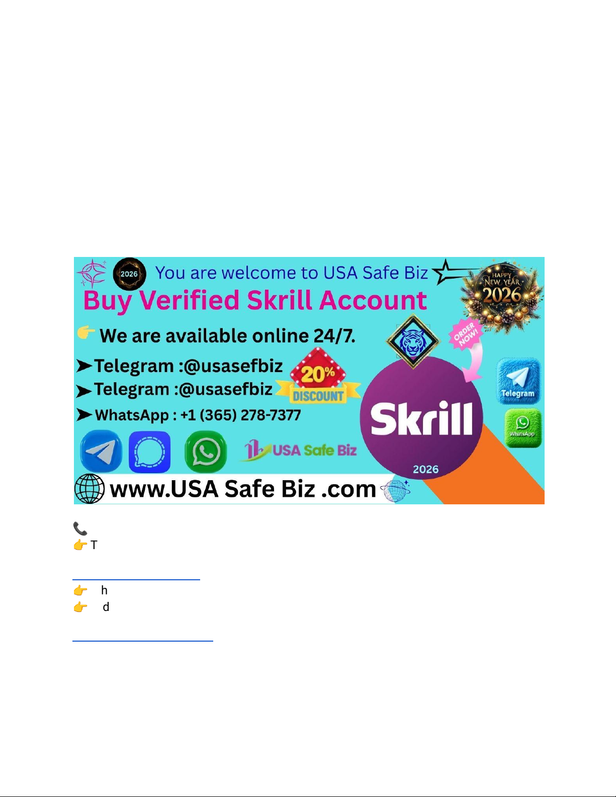 Buy Verified Skrill Account – Best Verified Account 2023 If you’re looking to buy a verified Skrill account, you’re in the right place. At Usasafebiz, we provide 100% verified and ready-to-use Skrill accounts that are secure, verified, and ideal for both personal and business use. With fast delivery and trusted support, our Skrill accounts make sending, receiving, and storing money online simple and worry-free. 📞 Contact Us Anytime: 👉 Telegram: https://t.me/Usasafebiz 👉 WhatsApp: +1 (365) 278-7377 👉 Order Now: Buy Verified Skrill Account Why People Choose to Buy a Verified Skrill Account https://t.me/Usasafebiz https://t.me/Usasafebiz https://usasafebiz.com/service/buy-verified-skrill-account/ https://usasafebiz.com/service/buy-verified-skrill-account/ Skrill is one of the most popular and widely trusted digital payment platforms. It’s used globally to send and receive money, handle business transactions, make online purchases, and even trade cryptocurrencies. But getting a verified Skrill account can sometimes be quite a challenge due to identity verification issues, regional restrictions, and time-consuming approval steps. That’s where Usasafebiz steps in — offering fully verified Skrill accounts that let you skip all the hassle and start using your account immediately. You might need to buy a verified Skrill account if: ● You need a verified digital wallet for international payments. ● Your region restricts Skrill registrations or verifications. ● You want to receive funds quickly for freelancing or business work. ● You plan to trade online or use Skrill for casino or forex platforms. ● You need a trusted, secure, and ready-to-use eWallet solution. Example: A freelance designer can receive payments from overseas clients instantly using a verified Skrill account without any withdrawal issues or limits. What You’ll Get When You Buy a Verified Skrill Account from Usasafebiz Buying from Usasafebiz means you’re getting an authentic, safe, and pre-verified account that’s built for long-term use. Each account is 100% verified and active — ready for immediate transactions. ✅ Our Skrill Accounts Include: ● Fully verified Skrill account (Email, ID & Phone verified) ● Linked and confirmed bank and card details ● Access to all Skrill features (transfer, deposit, and withdraw) ● No regional limitations ● Clean, secure, and unique account credentials ● Instant delivery after purchase ● 24/7 customer support and setup guidance All accounts are verified through official means, meaning you’ll receive a fully functional account that’s safe and compliant for your needs. Why Skrill Is a Trusted Payment Platform Before diving further, let’s look at why Skrill ranks among the world’s most trusted and convenient payment gateways: ● Global Reach: Send and receive money from over 200 countries. ● Multicurrency Support: Transact in more than 40 currencies. ● Low Transaction Fees: Simple, transparent fee structure. ● Crypto Wallet Integration: Buy and sell popular cryptocurrencies. ● Strong Security: Advanced encryption and two-factor authentication (2FA). A verified Skrill account opens the door to global transactions — safely and conveniently. Why Choose Usasafebiz for Verified Skrill Accounts For years, Usasafebiz has been serving customers worldwide with verified, authentic, and stable digital accounts. Our Skrill accounts are created to ensure maximum privacy, convenience, and speed. When you buy from us, you can count on legitimate accounts verified by professionals who understand how online finance works. Here’s why we stand out: ● 🟢 Genuine Verified Accounts: Each account passes 100% genuine KYC verification. ● ⚡ Delivery Within Hours: Access your account the same day you order. ● 🔐 Safe and Private Transfer: Credentials are securely sent to you. ● 🌍 Available Worldwide: Perfect for customers from any country. ● ✉ Ongoing Support: Telegram and WhatsApp support 24/7. We don’t just sell accounts — we provide digital access that helps your business grow. Pro Tip: Use your verified Skrill account for international freelancing, affiliate payouts, online purchases, or cross-border investments safely and efficiently. Benefits of Buying a Verified Skrill Account Purchasing a verified Skrill account unlocks full flexibility in global financial operations. Here are the main reasons why buyers prefer this route: 1. Skip Verification Delays Forget long uploads or identity checks — get a verified Skrill instantly. 2. Global Access Without Limits Send, receive, and withdraw funds from anywhere without restrictions. 3. Enjoy Higher Transaction Limits Fully verified accounts come with higher transfer and withdrawal limits. 4. Easy Business Transactions Perfect for online entrepreneurs, traders, and affiliate marketers who rely on stable eWallets. 5. Safe and Private All accounts from Usasafebiz come with encrypted delivery and unique security settings. How to Buy a Verified Skrill Account from Usasafebiz We’ve made the whole process simple, fast, and stress-free. Step-by-Step Guide: 1. Visit Our Product Page: Go to 2. Usasafebiz.com 3. . 4. Choose Account Type: Select your preferred account type (Personal or Business). 5. Complete Your Payment Securely: Follow our easy payment process to confirm your order. 6. Receive Your Verified Account: We’ll deliver your verified Skrill account credentials safely within hours. 7. Start Using Instantly: Log in and begin transacting with full access and verified benefits. https://usasafebiz.com/service/buy-verified-skrill-account/ https://usasafebiz.com/service/buy-verified-skrill-account/ Is It Safe to Buy a Verified Skrill Account? Yes — it’s completely safe when you purchase from a trusted provider like Usasafebiz. Every Skrill account we deliver is verified using genuine documents and processes, ensuring full legitimacy. We protect your data and guarantee the priv