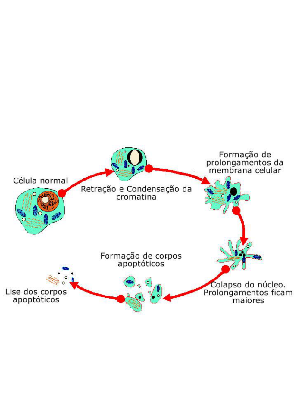APOPTOSE A apoptose é um tipo de morte celular programada que ocorre em diversas situações, como por exemplo, na organogênese e hematopoiese normal e patológica, na reposição fisiológica de certos tecidos, na atrofia dos órgãos, na resposta inflamatória e na eliminação de células após dano celular por agentes genotóxicos e patológicos brandos e também durante a metamorfose. A apoptose pode ser desencadeada por diversos fatores: ligação de moléculas a receptores de membrana, agentes quimioterápicos, radiação ionizante, danos no DNA, choque térmico, falta de fatores de crescimento, baixa quantidade de nutrientes e níveis aumentados de espécies reativas do oxigênio (ROS). O processo de ativação da apoptose envolve uma série de proteínas chamadas proteínas pro-apoptóticas, antiapoptóticas e caspases. Durante o processo de apoptose a célula sofre uma série de alterações morfológicas como a diminuição do seu tamanho e volume e perda do contato com a matriz extracelular e células vizinhas. O núcleo celular sofre uma série de alterações, a cromatina começa a condensar-se formando grumos grosseiros de heterocromatina depois migra para a periferia concentrando-se próximo ao envoltório nuclear deixando o núcleo com forma irregular; durante o processo de condensação da cromatina o DNA sofre fragmentação internucleossônica através da ação de endonucleases formando fragmentos com padrão característico, estes fragmentos de DNA possuem tamanho variável, mas sempre são encontrados em múltiplos de 200 pares de bases. Após a condensação e marginalização da cromatina o núcleo fragmenta-se formando esferas chamadas de corpúsculos heterocromáticos. As organelas presentes no citoplasma são empacotadas pelo retículo endoplasmático e podem surgir vacuolizações. Devido a degradação do núcleo, o citoesqueleto sofre desestruturação e a célula perde sua forma original. O transporte intracelular também sofre prejuízo e a célula retrai-se. Há a formação de prolongamentos citoplasmáticos chamados blebs que se desprendem da célula apoptótica sendo posteriormente fagocitados por das células vizinhas, macrófagos teciduais ou macrófagos das cavidades associadas aos epitélios.