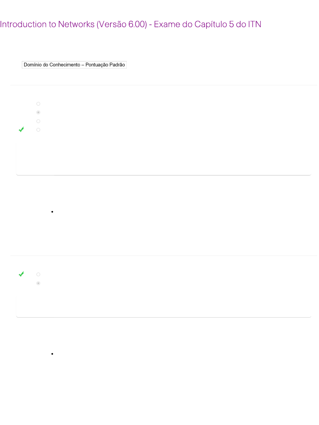 Resultados da avaliação Relatório de comentários por item Abaixo você encontra o relatório de comentários por item para aqueles itens pelos quais você não recebeu crédito. Alguns itens interativos podem não exibir a sua resposta. Subtotal: 10 Qual método de switching usa o valor CRC em um quadro? Correta Resposta Sua Resposta Quando o método de switching store-and-forward é usado, o switch recebe o quadro completo antes de encaminhá-lo para o destino. A parte CRC (cyclic redundancy check, verificação cíclica de redundância) do trailer é usada para determinar se o quadro foi modificado durante o trânsito. Por outro lado, um switch cut-through encaminha o quadro assim que o endereço destino da camada 2 é lido. Dois tipos de métodos de switching cut-through são fast-forward e fragment-free. Esse item faz referência ao conteúdo das seguintes áreas: Introduction to Networks 5.2.2 Métodos de Encaminhamento em Switches 12 Verdadeiro ou falso? Quando um dispositivo está enviando dados para outro dispositivo em uma rede remota, o quadro Ethernet é enviado para o endereço MAC do gateway padrão. Correta Resposta Sua Resposta Um endereço MAC só é útil na rede Ethernet local. Quando os dados se destinam a uma rede remota de qualquer tipo, eles são enviados para o dispositivo gateway padrão, o dispositivo da Camada 3 que faz o roteamento para a rede local. Esse item faz referência ao conteúdo das seguintes áreas: Introduction to Networks 5.3.1 MAC e IP fragment-free cut-through fast-forward store-and-forward verdadeiro falso Relatório de comentários por item https://assessment.netacad.net/virtuoso/delivery/pub-doc/2.0/item_level_... 1 of 1 24/10/2018 11:57
