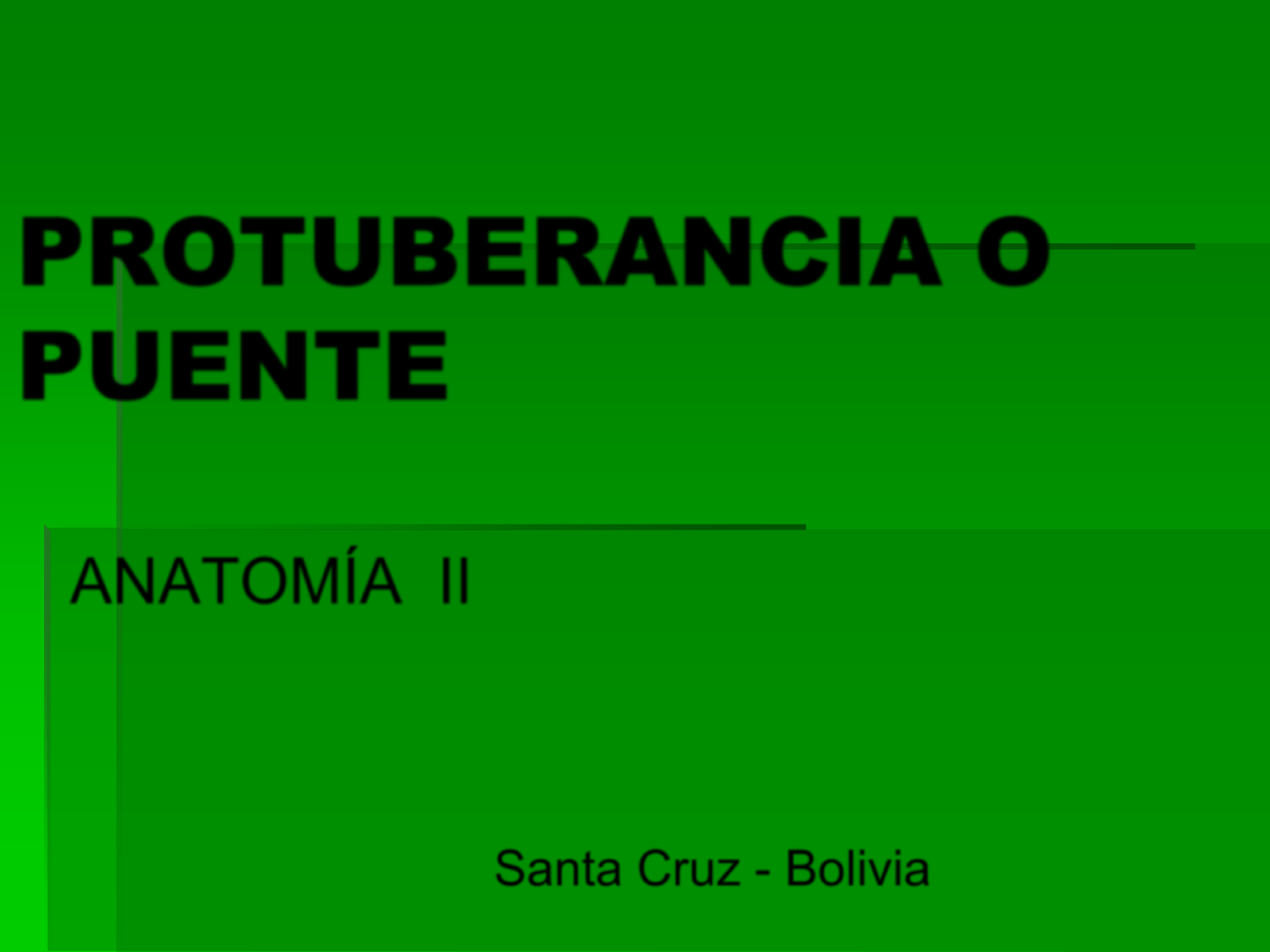 * PROTUBERANCIA O PUENTE ANATOMÍA II Santa Cruz - Bolivia * PROTUBERANCIA O PUENTE Situado debajo del mesencéfalo; encima del bulbo; delante del cerebelo. Mide 25 x 35 x 25 mm. Color blanquecino. Límites: Arriba; surco ponto-mesencefálico. Abajo; Surco bulbo-protuberancial; Lateral por fuera de la emergencia del V par. * PROTUBERANCIA O PUENTE * PROTUBERANCIA O PUENTE * PROTUBERANCIA O PUENTE * PROTUBERANCIA O PUENTE * PROTUBERANCIA O PUENTE * PROTUBERANCIA O PUENTE * ROTUBERANCIA O PUENTPE * ROTUBERANCIA O PUENTPE * ROTUBERANCIA O PUENTPE * MESENCÉFALO Segmento superior del tallo encefálico, ubicado entre el diencéfalo y la protuberancia. Solo es posible verlo en su cara anterior. Se extiende del surco ponto-peduncular hasta las cintillas ópticas. Long. 15-18 mm. Peso: 4-5 qr. * MESENCÉFALO * MESENCÉFALO * MESENCÉFALO * MESENCÉFALO * MESENCÉFALO * MESENCÉFALO *