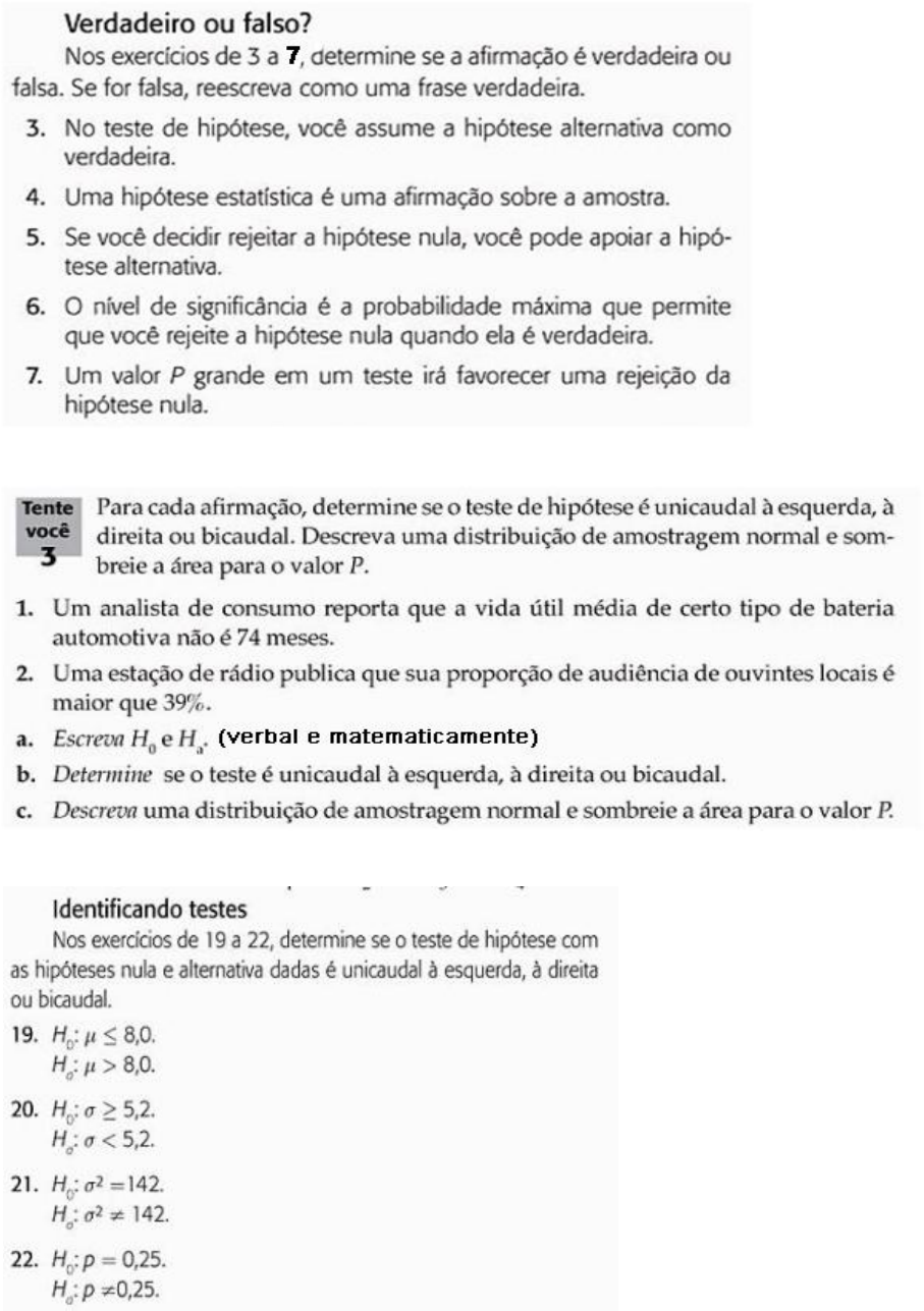 Exercícios aula 8 Bioestatística 2017 Nomes Estatística inferêncial II Exercício 4 Em um estudo relativo aos efeitos do uso de cocaína no período pré-natal sobre bebês, obtiveram-se os seguintes dados amostrais para os pesos ao nascer: n = 190, xbarra= 2700 g, s = 645 g (amostra aleatória). Admita que recém-nascidos de mães que não usam cocaína têm peso médio ao nascer igual a 3100 g. Teste a hipótese de que os pesos de bebês que nascem de mães usuárias de cocaína têm uma média menor do que os de mães que não usam cocaína, ao nível de significância de 0,01. 1. Verifique se a amostra e aleatória, e se ou a população é distribuído normal ou n ≥ 30 2. Declare a afirmação verbal e matematicamente. Identifique as hipóteses nula e alternativa 3. Especifique o nível de significância α 4. Determine o valor crítico (tabela z ou t) 5. Determine a região de rejeição 6. Determine a estatística do teste padronizado σ conhescida σ desconhescida com g.l.= n-1 7. Tome uma decisão para rejeitar ou falhar em rejeitar a hipótese nula 8. Interprete a decisão no contexto da afirmação original t bicaudal 0.01; g.l. = 189 = 2.60 t unicaudal à direita 0.01; g.l. = 189 = 2.35 t unicaudal à esquerda 0.01; g.l. = 189 = -2.35 z 0.99 = 2.33 n x z / ns x t / Exercício 5 (para solução veja pdf da aula 9) Uma companhia de cigarros anuncia que o índice médio de nicotina dos cigarros que fabrica apresenta-se é 23,1 mg por cigarro. Um laboratório realiza 12 análises desse índice (amostra aleatória), obtendo: 25.3, 25.0, 28.1 , 24.8, 22.3, 25.7, 24.8, 21.6, 22.9, 27.0, 23.2, 21.9 Pode-se aceitar, ao nível de 5%, a afirmação do fabricante? Pode assumir que a quantidade de nicotina nos cigarros é normalmente distribuída. 1. Verifique se a amostra e aleatória, e se ou a população é distribuído normal ou n ≥ 30 2. Declare a afirmação verbal e matematicamente. Identifique as hipóteses nula e alternativa 3. Especifique o nível de significância α 4. Determine o valor crítico (tabela z ou t) 5. Determine a região de rejeição 6. Determine a estatística do teste padronizado σ conhescida σ desconhescida com g.l.= n-1 7. Tome uma decisão para rejeitar ou falhar em rejeitar a hipótese nula 8. Interprete a decisão no contexto da afirmação original n x z / ns x t /