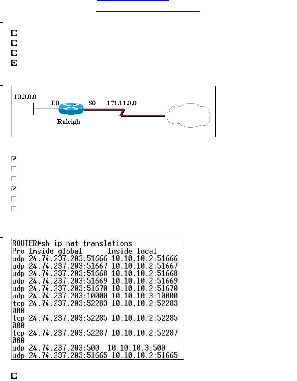 www.ccna4u.info Email: quocvuong.it@gmail.com 1 1 A network administrator is asked to design a system to allow simultaneous access to the Internet for 250 users. The ISP for this network can only supply five public IPs. What can be used to accomplish this task? routable translation dynamic translation static translation port address translation 2 The LAN attached to the Ethernet interface of the Raleigh router shown in the graphic is addressed with private IP addresses. If one public IP is assigned to the company, which commands could be used in a configuration that allows all devices with private IPs in this network to access the Internet? (Choose two.) ip nat inside source list 1 interface serial0 overload ip nat outside source list 1 interface serial0 overload ip nat inside serial0 ip nat inside source list 1 pool Raleigh overload ip nat inside Raleigh overload ip inside nat source list 1 interface serial0 Raleigh 3 The command output shown in the graphic was taken from a Cisco 806 broadband router. Which kind of address translation is in effect on this router? static www.ccna4u.info Email: quocvuong.it@gmail.com 2 dynamic overload private public 4 Which of the following IP addresses are defined by RFC 1918 as private addresses? (Choose three.) 192.168.146.0/22 172.10.25.0/16 172.31.0.0/16 20.0.0.0/8 10.172.92.8/29 5 How will data be transmitted from the router to the ISP if the router has the two links shown in the graphic? Both links will transmit data at the same rate. 1544 bits can be transmitted simultaneously from the router over the T1 line. Both links will transmit bits one by one. The 56K link will transmit a maximum of 53 bits at the same time. 6 Which statements about DHCP are true? (Choose three.) DHCP uses TCP. DHCP uses UDP. DHCP sends messages to the server on port 67. DHCP sends messages to the server on port 68. DHCP sends messages to the client on port 67. DHCP sends messages to the client on port 68. 7 Which command would be used to exclude the IP address 192.168.24.5 from the DHCP address pool on a router? Router(dhcp-config)# ip dhcp excluded-address 192.168.24.5 Router# ip dhcp excluded-address 192.168.24.5 Router(config-excluded)# ip dhcp excluded-address 192.168.24.5 www.ccna4u.info Email: quocvuong.it@gmail.com 3 Router(config)# ip dhcp excluded-address 192.168.24.5 Router(config)# excluded-address 192.168.24.5 Router(dhcp-config)# excluded-address 192.168.24.5 8 The WAN connection for a nationwide company with 250 offices must support constant connections to core layer services for file sharing, and occasional Internet access. Which combination of WAN technologies will meet these needs with minimum expense? Frame Relay PVC for Internet access and ATM for file server access Frame Relay PVC for Internet access and ISDN for file server access ISDN for Internet access and X.25 for file server access ISDN for Internet access and Frame Relay PVC for file server access 9 Which command would produce the output shown in the graphic? show ip dhcp server statistics show ip dhcp binding debug ip dhcp server events debug ip dhcp binding 10 Which of the following devices is used to establish the communications link between the customer equipment and the local loop for digital lines? terminal adapter modem CSU/DSU PBX switch ISDN switch Frame Relay Switch 11 Which of the following statements are true about Frame Relay? (Choose three.) Frame Relay operation is defined by a series of ISO standards. Frame Relay is a packet switched, connection-oriented, wide area network service. Frame Relay only supports point-to-point connections. A router can be considered as data terminal equipment (DTE) in a frame relay system. Frame Relay is a cell switched, connection-oriented, wide area network service. www.ccna4u.info Email: quocvuong.it@gmail.com 4 Frame Relay networks use a subset of the HDLC protocol to carry information. 12 ITU-T Q.921 specifies the use of which protocol for sending control and signaling messages between the router and the ISDN switch? HDLC IPCP LAPB LAPD NCP SS7 13 A company needs a WAN connection that is capable of transferring voice, video, and data at a minimum data rate of 155 Mbps. Which WAN connection is the best choice? X.25 DSL ATM ISDN BRI ISDN PRI 14 Which statement explains why basic DSL is an unpopular WAN connectivity choice for enterprise computer departments that support home users? DSL offers insufficient bandwidth to home users. DSL requires the installation of new cables, which is not always possible for home users. DSL dialup connection time is too slow for business use. DSL has limited geographical availability. 15 When planning simple WAN connections for a small company, which feature of the three layer hierarchical model makes it a good choice for the WAN topology. It provides for redundancy. It allows for easy WAN expansion in case of company growth. It is less expensive. It provides faster connection time. It provides less latency and jitter. 16 Which of the following terms describes a device that will put data on the local loop? DLCI CO DCE DTE www.ccna4u.info Email: quocvuong.it@gmail.com 5 PRI BRI 17 Which of the following are supported by a BRI interface on a router? (Choose two.) Two independent channels that can carry analog data with a bandwidth of 64 KHz. A single 128 Kbps digital bearer channel. Two multiplexed channels carrying digital data. A single 64 Kbps signaling channel. A multiplexed data channel that can only handle SS7 information. A 16 Kbps delta channel used for signaling purposes. 18 A network administrator has been asked to provide the network in the United States with an ISDN WAN link. The router available to provide the WAN connection is a non-modular Cisco router with two serial connections. What must be done to adapt one of the serial interfaces of this router for the ISDN connection? Nothing. The router is already suitable. Purchase a BRI WAN interface card to install in the router. Purchase a U interface to ins