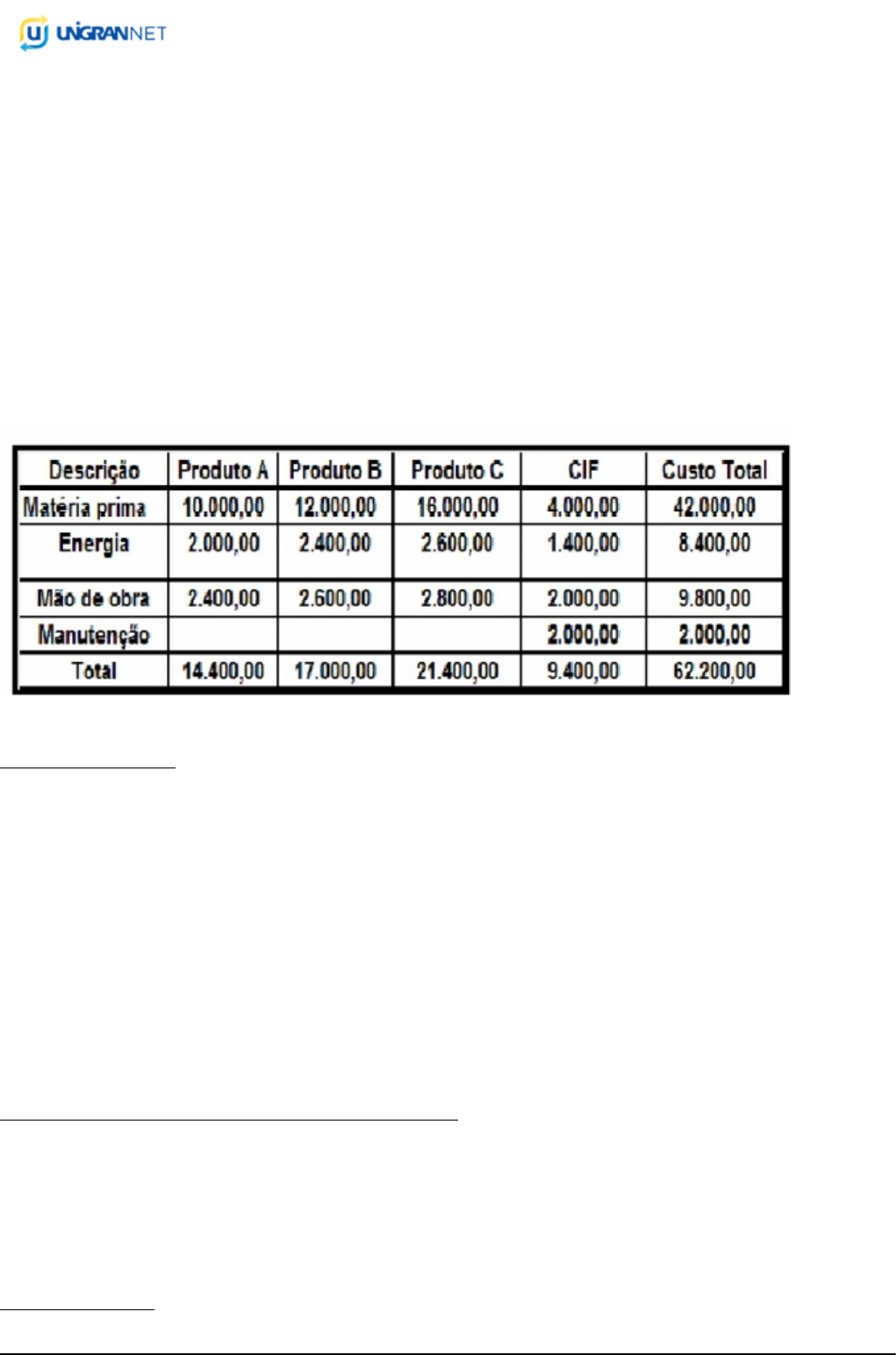 GABARITO Protocolo: 622717 Página 1 - 28/01/2020 às 14:45 Substitutiva Data de aplicação: 30/11/2019 Curso: Administração Disciplina: Contabilidade Comercial Ano: 20192 / Semestre: 3 RGM: 023.13149 / Aluno: JULIA LUCENA ARAUJO PROVA 01 Questão 1 Apresente o custo total do produto B após o rateio. a) 16.963,38 b) 20.026,80 (correta) c) 25.209,82 d) 26.254,60 Questão 2 A empresa JHD LTDA, fabrica 02 produtos, sendo que o produto A, corresponde a 60% das vendas e o produto B 40% das vendas. O produto A é vendido por R$ 50,00 tendo custos de despesas variáveis é de R$ 32,00 e os custos e despesas fixa de R$ 8,00. O produto B é vendido por R$ 60,00 e custos e despesas variáveis por R$ 32,00 e os custos e despesas fixas R$ 12,00. Apresente a margem de contribuição conjunta dos produtos A e B. a) Margem de contribuição dos produtos A e B é R$ 22,00 (correta) b) Margem de contribuição dos produtos A e B é R$ 16,40 c) Margem de contribuição dos produtos A e B é R$ 11,20 d) Margem de contribuição dos produtos A e B é R$ 10,80 Questão 3 A compra de um produto ou serviço qualquer que gera sacrifício financeiro para entidade, sacrifício esse representado por entrega ou promessa de ativos. Assinale a alternativa correta. a) Gastos, (correta) b) Investimento GABARITO Protocolo: 622717 Página 2 - 28/01/2020 às 14:45 c) Custo, d) Perda. Questão 4 - Leia a frase abaixo e assinale a alternativa correta. Os princípios e convenções contábeis têm como função fundamentar e justificar as ações do profissional contábil e estabelecem diretrizes e as convenções se relacionam aos procedimentos dos princípios contábeis. ( ) A empresa deve ser avaliada e, consequentemente, ser escriturada, na hipótese de que a entidade nunca irá se extinguir. Este é um Princípio muito utilizado pelos que defendem os custos históricos; ( ) A adoção do menor valor para os componentes do Ativo e do maior para os do Passivo, sempre que se apresentem alternativas igualmente válidas para a quantificação das mutações patrimoniais que alterem o Patrimônio Líquido; ( ) Determina que os processos contábeis uma vez adotados, não devem ser alterados com frequência para não dificultar a análise dos demonstrativos contábeis. Correlacionando as questões acima se podem enumerar como sendo: 1.Principio da Continuidade; 2.Principio da Prudência; 3.Convenção da Consistência. Nesta condição assinale a alternativa correta. a) A correlação é 1, 2 e 3; (correta) b) A correlação é 3, 2 e 1; c) A correlação é 1, 3 e 2 d) A correlação é 2, 1 e 3. Questão 5 Leia a frase abaixo e assinale a alternativa correta. Os princípios e convenções contábeis têm como função fundamentar e justificar as ações do profissional contábil e estabelecem diretrizes e as convenções se relacionam aos procedimentos dosprincípios contábeis. ( ) Reconhece que o patrimônio como objeto que pertence a empresa não deve de forma alguma ser confundido com o patrimônio dos sócios; ( ) Trata que o administrador ou contador devem realizar o registro e o relato de todos os fatos que afetam o patrimônio da empresa no momento que eles acontecem; ( ) Trata que é preciso realizar os registros contábeis, mas sempre observar a subjetividade do lançamento contábil, baseando-se em elementos objetivos, pois este profissional deve serextremamente objetivo. Correlacionando as questões acima se podem enumerar como sendo: I. Convenção da objetividade; II. Principio da entidade; III. Principio da Oportunidade Nesta condição assinale a alternativa correta a) A correlação é I, II e I b) A correlação é I, II e III c) A correlação é II,III e I (correta) d) A correlação é I, III e II Questão 6 De acordo com a descrição abaixo assinale a alternativa correta. I Taxa mensal de energia elétrica II Matéria prima III Depreciação equipamentos IV Seguro prédio administrativo. GABARITO Protocolo: 622717 Página 3 - 28/01/2020 às 14:45 a) I e II são custos fixos; b) III e IV são custos diretos c) Apenas II é custo variável (correta) d) Apenas IV é custo indireto Questão 7 Leia a afirmativa abaixo e assinale a alternativa correta. Os custos são classificados em relação ao produto que estão sendo produzidos, assim os custos estão presentes nas empresas sendo elementos importantes na tomada de decisão. PORQUE. Quando estamos tratando dos custos os mesmos podem ser classificados em diretos e indiretos já que estes custos influenciam apenas os itens que compõem a produção. Assinale alternativa correta. a) A primeira afirmativa esta correta e a segunda esta incorreta; (correta) b) A primeira afirmativa esta incorreta e a segunda esta correta; c) Ambas afirmativas estão corretas; d) Ambas afirmativas estão incorretas; Questão 8 Leia a frase abaixa e faça a correlação. ( ) Gasto relativo ao bem ou ao serviço utilizado na produção de outros bens e serviços, que só é reconhecido como custo no momento da utilização dos fatores de produção. ( ) Compra de um produto ou serviço qualquer que gera sacrifício financeiro para a entidade, sacrifício esse representado por entrega ou promessa de ativos ( ) Bem ou serviço consumido direta ou indiretamente para obtenção de receitas, são itens que reduzem o Patrimônio Líquido. Correlação: I - Despesa II - Gasto III - Custo Assinale a alternativa correta: a) I, II, III b) III, II, I (correta) c) II, III, I d) III, I, II Questão 9 Gasto relativo ao bem ou serviço utilizado na produção de outros bens e serviços, que só é reconhecido como custo no momento dos fatores de produção .Assinale a alternativa correta. a) Gasto b) Despesa c) Custo (correta) d) Investimento Questão 10 A indústria de Cosméticos, realiza o lançamento de um novo produto no mercado interno, porém as primeiras unidades vendidas foram comercializadas com prazo de 30 dias, tendo um fator determinante as embalagens, já que a concorrência apr
