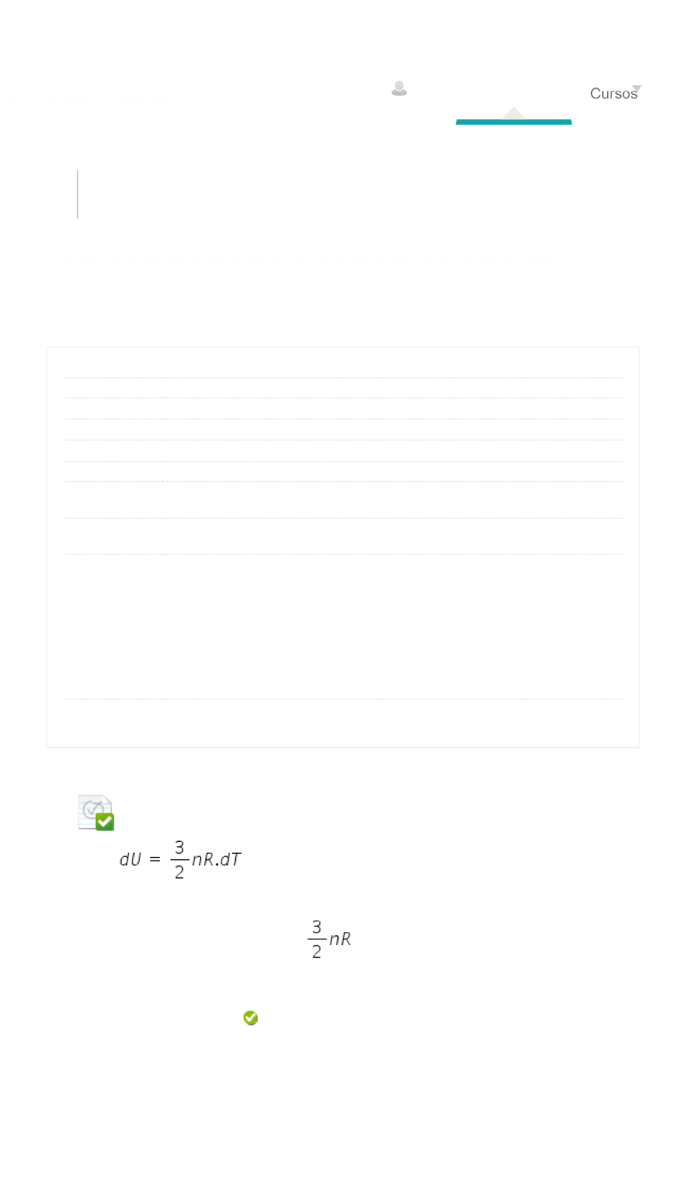 8413 . Unidade 1 Revisar envio do teste: Avaliação On-Line 2 (AOL 2) - Questionário H Revisar envio do teste: Avaliação On-Line 2 (AOL 2) - Questionário Usuário Leandro Rogerio Nunes Mendes Curso 8413 . 7 - Tópicos Integradores II (Engenharia Elétrica) - 20182.B Teste Avaliação On-Line 2 (AOL 2) - Questionário Iniciado 27/10/18 17:30 Enviado 13/11/18 06:04 Status Completada Resultado da tentativa 9 em 10 pontos Tempo decorrido 396 horas, 33 minutos Instruções Resultados exibidos Todas as respostas, Respostas enviadas, Respostas corretas, Perguntas respondidas incorretamente Atenção! Você terá 1 opção de envio. Você pode salvar e retornar quantas vezes desejar, pois a tentativa só será contabilizada quando você decidir acionar o botão ENVIAR. Após o envio da atividade, você poderá conferir sua nota e o feedback, acessando o menu lateral esquerdo (Notas). IMPORTANTE: verifique suas respostas antes do envio desta atividade. Pergunta 1 Resposta Selecionada: b. Respostas: De acordo com a teoria cinética dos gases, definimos a forma diferencial da energia interna para um gás ideal monoatômico como sendo: Admitindo que o sistema seja fechado, temos que n é constante, consequentemente o produto é todo formado por constantes, que definimos como: Capacidade calorífica a volume constante, onde 3 é correspondente ao grau de liberdade translacional. Disciplinas 1 em 1 pontos Leandro Rogerio Nunes Mendes 1 Página 1 de 7Revisar envio do teste: Avaliação On-Line 2 (AOL 2) - ... 26/11/2018https://sereduc.blackboard.com/webapps/assessment/review/review.jsp?attempt_id=_... a. b. c. d. e. Capacidade calorífica a pressão constante, onde 1/2 é correspondente ao grau de liberdade translacional. Capacidade calorífica a volume constante, onde 3 é correspondente ao grau de liberdade translacional. Capacidade calorífica a volume constante, onde 1/2 é correspondente ao grau de liberdade translacional. Produto universal dos gases monoatômicos. Capacidade calorífica a pressão constante, onde 3 é correspondente ao grau de liberdade translacional. Pergunta 2 Resposta Selecionada: d. Respostas: a. b. c. O laureado com o Prêmio Nobel de física em 1910, Johannes Diderik van der Waals propôs ajustes ao modelo dos gases ideais com inserções de parâmetros empíricos, oriundos de observações experimentais, onde: Fundamentado na proposta de van der Waals, indique qual a diferença entre parâmetro (a e b) e variáveis de um sistema gasoso (p, V, T e n). A diferença entre variáveis e parâmetros consiste, essencialmente, em que as variáveis podem assumir qualquer valor independente da natureza do gás, mas os parâmetros assumem valores diferentes de acordo com à natureza do gás, ou seja, assumem valores diferentes para diferentes gases, mas é constante para o mesmo gás, independente das condições do sistema. A diferença entre variáveis e parâmetros consiste, essencialmente, em que os parâmetros podem assumir qualquer valor independente da natureza do gás, mas as variáveis assumem valores diferentes de acordo com à natureza do gás, ou seja, assumem valores diferentes para diferentes gases, mas é constante para o mesmo gás, independente das condições do sistema. A diferença entre parâmetro e variáveis consiste no fato que parâmetros são medidas de origem química e as variáveis são de origem física. Não existem diferenças físicas ou químicas entre parâmetros e variáveis. 1 em 1 pontos Página 2 de 7Revisar envio do teste: Avaliação On-Line 2 (AOL 2) - ... 26/11/2018https://sereduc.blackboard.com/webapps/assessment/review/review.jsp?attempt_id=_... d. e. A diferença entre variáveis e parâmetros consiste, essencialmente, em que as variáveis podem assumir qualquer valor independente da natureza do gás, mas os parâmetros assumem valores diferentes de acordo com à natureza do gás, ou seja, assumem valores diferentes para diferentes gases, mas é constante para o mesmo gás, independente das condições do sistema. Os parâmetros a e b são respectivamente, correção volumétrica para as moléculas dos gases e correções de interações de atração e repulsão entre as partículas. Pergunta 3 Resposta Selecionada: b. Respostas: a. b. c. d. De acordo com a definição de trabalho infinitesimal, temos que: Onde a notação denota que a diferencial do trabalho é inexata. Lembre-se que diferenciais exatas são escritas com a letra d à esquerda da variável, como no caso da diferencial relativa ao volume (dV). Nas alternativas a seguir, indique qual representa a melhor justificativa para denotarmos a diferencial do trabalho como inexata. De acordo com a teoria matemática de conjuntos e funções, uma variável ou expressão matemática só será considerada função se para cada elemento do domínio de variáveis ou expressões exista apenas uma única imagem. Como o trabalho depende do caminho para ser integrável, isto implica que o comportamento do trabalho pode apresentar mais de uma imagem por domínio. Independente do caminho percorrido pelo sistema, o trabalho sempre resultará no mesmo valor, por isso, dizemos que o trabalho é não integrável. De acordo com a teoria matemática de conjuntos e funções, uma variável ou expressão matemática só será considerada função se para cada elemento do domínio de variáveis ou expressões exista apenas uma única imagem. Como o trabalho depende do caminho para ser integrável, isto implica que o comportamento do trabalho pode apresentar mais de uma imagem por domínio. O trabalho é uma função de estado e, portanto, é não integrável. A integração da diferencial do trabalho resulta em , ou seja, resulta num valor que é resultado de um intervalo discreto. 1 em 1 pontos Página 3 de 7Revisar envio do teste: Avaliação On-Line 2 (AOL 2) - ... 26/11/2018https://sereduc.blackboard.com/webapps/assessment/review/review.jsp?attempt_id=_... e. De acordo com a teoria matemática 