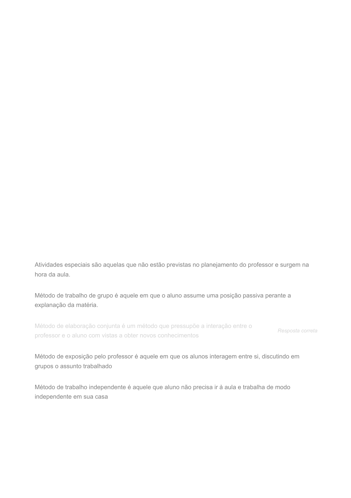 16/05/2020 Ultra https://sereduc.blackboard.com/ultra/courses/_29516_1/outline/assessment/_2131285_1/overview/attempt/_7349193_1/review?courseId=_2951… 1/7 Correta (C) Método de elaboração ... Ocultar outras opções Pergunta 1 -- /1 Estar diante de uma prática educativa é muito mais do que apenas aprimorar o conhecimento, é rever e reavaliar todo um contexto que envolve a formação do professor e verificar como essa formação repercute. A respeito dos métodos de ensino, propostos por Libâneo (1994), é correto afirmar: Atividades especiais são aquelas que não estão previstas no planejamento do professor e surgem na hora da aula. Método de trabalho de grupo é aquele em que o aluno assume uma posição passiva perante a explanação da matéria. Resposta correta Método de elaboração conjunta é um método que pressupõe a interação entre o professor e o aluno com vistas a obter novos conhecimentos Método de exposição pelo professor é aquele em que os alunos interagem entre si, discutindo em grupos o assunto trabalhado Método de trabalho independente é aquele que aluno não precisa ir à aula e trabalha de modo independente em sua casa Pergunta 2 -- /1 Ao longo dos anos, o ensino passou por uma série de mudanças, que modificaram fortemente os processos de ensino e aprendizagem, especialmente em sala de aula. Sobre essas mudanças é correto afirmar: 10/10 Nota final Enviado: 16/05/20 13:39 (BRT) 16/05/2020 Ultra https://sereduc.blackboard.com/ultra/courses/_29516_1/outline/assessment/_2131285_1/overview/attempt/_7349193_1/review?courseId=_2951… 2/7 Correta (D) Em cada época histórica, ... Ocultar outras opções Correta (A) A fala surge como ... Ocultar outras opções A forma de o professor conduzir os trabalhos em sala de aula não tem nenhuma relação direta com o papel que escola desempenha nesse dado momento histórico. Toda escola consegue se desviar dos acontecimentos sociais por ser este um espaço autônomo e isolado. A forma como a escola é organizada não faz jus a sociedade da época. Resposta correta Em cada época histórica, a escola é impactada pelas mudanças ocorridas no cenário social. A escola não tem relação com o momento histórico que está sendo vivenciado. Pergunta 3 -- /1 “O ser humano sempre se preocupou ao longo de toda a história, em desenvolver procedimentos e técnicas com a finalidade de analisar, registrar, guardar e recuperar informações. A organização do conhecimento e a sua representação tornaram-se cada vez mais urgente, à medida que o volume de informação aumentou.” (LIMA, 200). A transmissão de conhecimentos sempre foi um ponto importante em todas as civilizações. A respeito disso é correto afirmar: Resposta correta A fala surge como primeiro modo de transmissão de conhecimentos de uma geração para outra. Os registros escritos surgem como uma forma de se regulamentar o que era certo e errado nos conhecimentos que eram socializados. 16/05/2020 Ultra https://sereduc.blackboard.com/ultra/courses/_29516_1/outline/assessment/_2131285_1/overview/attempt/_7349193_1/review?courseId=_2951… 3/7 Correta (C) O diálogo e a interação Ocultar outras opções O advento da imprensa e a produção em larga escala de livros, jornais e revistas deixaram o conhecimento aprisionado em papéis e acabaram com a transmissão oral. As pessoas nunca se preocuparam com estratégias que os permitissem transmitir seus ensinamentos. Até os dias atuais a tradição oral é o único meio de perpetuação dos costumes e tradições de um povo. Pergunta 4 -- /1 A docência, tida como um papel importante e fundamental à cultura e educação do ser humano, já é alvo de algumas discussões e estudos há algum tempo. Fato este que, como os demais institutos e instrumentos, necessitavam de aprimoramento de métodos e técnicas para obtenção da essencial finalidade que se busca. O trabalho docente é uma prática educativa específica que requer um estudo acerca das formas, meios e condições do processo de aprendizagem estudado na disciplina didática, conforme assevera Libâneo (1994). Sobre os métodos de ensino é correto pensar que as formas de ensinar e aprender atualmente estão mais ligadas à: Os aspectos tradicionais de ensino. Ao cumprimento de regras e a punição. Resposta corretaO diálogo e a interação. Castigos e palmatórias. Condutas disciplinantes. Pergunta 5 -- /1 A escola que frequentamos, baseia-se no modelo educacional ainda predominante no nosso país, o da educação homogênea (Cavellucci, 2000). O conhecimento sobre os diferentes estilos de aprendizagem, suas características e estratégias de estudo podem contribuir para: 16/05/2020 Ultra https://sereduc.blackboard.com/ultra/courses/_29516_1/outline/assessment/_2131285_1/overview/attempt/_7349193_1/review?courseId=_2951… 4/7 Correta (C) Entender a maneira como ... Ocultar outras opções Correta (E) Cognitivista Ocultar outras opções O aluno saber que seu estilo de aprendizagem não funciona O professor priorizar o método adequado que seja igual a toda a turma Resposta correta Entender a maneira como os estudantes se relacionam com as pessoas e com o mundo Criar uma competição de quem aprende melhor O professor ensinar aos alunos qual a forma correta de aprender Pergunta 6 -- /1 Existem diversas abordagens teóricas para tratar dos processos de ensino e aprendizagem. Cada uma delas, leva em consideração o momento histórico, a cultura, e a sociedade na qual a educação está inserida. Nesse sentido, a abordagem em que o aluno tem o papel essencialmente “ativo” de observar, experimentar, comparar, relacionar e argumentar e a escola deve dar condições de que o aluno possa aprender por si próprio, é: Comportamentalista Tradicional Sociocultural Humanista 16/05/2020 Ultra https://sereduc.blackboard.com/ultra/courses/_29516_1/outline/assessment/_2131285_1/overview/attempt/_7349193_1/review?courseId=_2951… 5/7 Correta (B) Os 