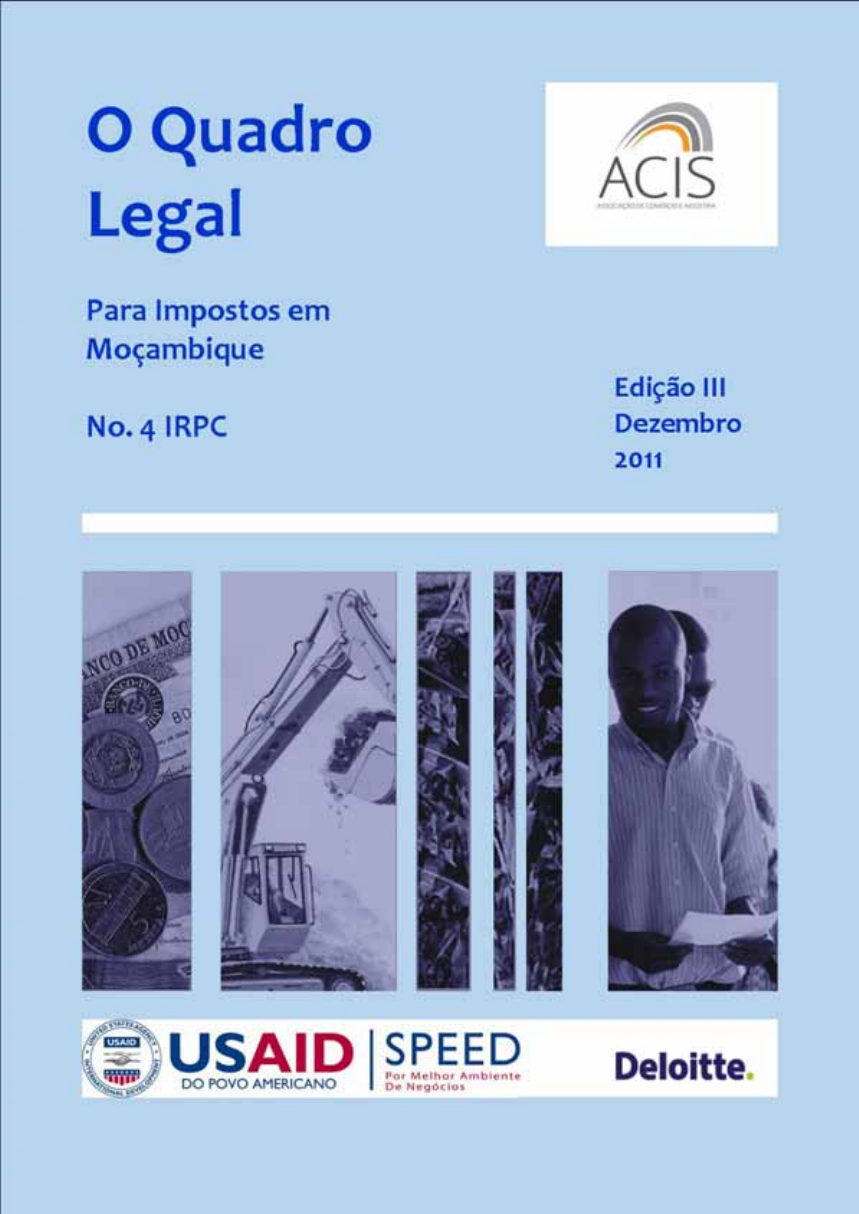 Página 1 MANUAL DO IMPOSTO SOBRE O RENDIMENTO DAS PESSOAS COLECTIVAS ÍNDICE 1 NOTA PRÉVIA.........................................................................................................7 2 ORGANIZAÇÃO DO MANUAL E SUA ACTUALIZAÇÃO......................................9 3 GLOSSÁRIO..........................................................................................................10 4 CALENDÁRIO DE OBRIGAÇÕES E MODELOS UTILIZADOS...........................16 5 INCIDÊNCIA ..........................................................................................................19 5.1 Quem são os sujeitos passivos? ..................................................................................19 5.2 Incidência real ou objectiva ...........................................................................................20 5.2.1 Qual é a base do imposto?.......................................................................................20 5.2.2 O que é um estabelecimento estável? .....................................................................21 5.3 Extensão da obrigação do imposto ..............................................................................22 5.3.1 Quais são os rendimentos considerados obtidos em Moçambique? .......................22 5.4 Período de tributação .....................................................................................................23 5.4.1 Período de tributação não coincidente com o ano civil ............................................23 5.4.2 Período de tributação inferior ao ano civil ................................................................23 5.4.3 Período de tributação superior ao ano civil ..............................................................23 5.5 Facto gerador ..................................................................................................................24 6 ISENÇÕES E OUTROS BENEFÍCIOS FISCAIS...................................................25 6.1 Isenções estabelecidas no Código do IRPC ................................................................25 6.1.1 Isenções Pessoais ....................................................................................................25 6.1.2 Isenções Reais .........................................................................................................26 6.2 Isenções e outros benefícios fiscais estabelecidos no CBF......................................26 7 REGIME DE TRANSPARÊNCIA FISCAL .............................................................30 7.1 Em que consiste este regime? ......................................................................................30 7.2 Quais as sociedades abrangidas por este regime? ...................................................30 7.2.1 Sociedades civis não constituídas sob forma comercial ..........................................31 7.2.2 Sociedades de profissionais .....................................................................................31 7.2.3 Sociedades de simples administração de bens .......................................................31 8 DETERMINAÇÃO DA MATÉRIA COLECTÁVEL .................................................32 8.1 Métodos e regras de determinação da matéria colectável .........................................32 8.1.1 Quais são os métodos de determinação da matéria colectável?.............................32 8.1.2 Quais são as regras de determinação da matéria colectável?.................................33 ACIS em cooperação com USAID, SPEED e DELOITTE Versão: IRPC 03 Dezembro 2011.......................................................Página 2 MANUAL DO IMPOSTO SOBRE O RENDIMENTO DAS PESSOAS COLECTIVAS 8.2 Determinação da matéria colectável de sujeitos passivos residentes que exercem a título principal uma actividade de natureza comercial, industrial ou agrícola ...............33 8.2.1 Quais os critérios para imputar os proveitos e custos ao exercício? .......................35 8.2.2 Quais os critérios para imputar os proveitos e custos a actividades plurianuais? ...37 8.2.2.1 Explorações silvícolas plurianuais ...................................................................37 8.2.2.2 Obras plurianuais .............................................................................................37 8.2.3 O que se consideram proveitos ou ganhos? ............................................................41 8.2.4 O que se consideram variações patrimoniais positivas?..........................................42 8.2.5 O que se consideram custos ou perdas? .................................................................42 8.2.5.1 Rendas de locação financeira..........................................................................43 8.2.5.2 Realizações de utilidade social, seguros e contribuições para fundos de pensões 44 8.2.5.3 Amortizações e reintegrações..........................................................................45 8.2.5.4 Provisões e Perdas por Imparidade.................................................................49 8.2.5.5 Créditos incobráveis.........................................................................................51 8.2.5.6 Donativos .........................................................................................................51 8.2.5.7 Outros encargos não dedutíveis para efeitos fiscais .......................................51 8.2.6 Outros encargos dedutíveis para efeitos fiscais ......................................................55 8.2.7 O que se consideram variações patrimoniais negativas? ........................................55 8.2.8 Qual é o tratamento fiscal das relocações financeiras? ...........................................56 8.2.9 Quais são os critérios de valorimetria das existências?...........................................56 8.2.10 Qual é o regime aplicável às mai
