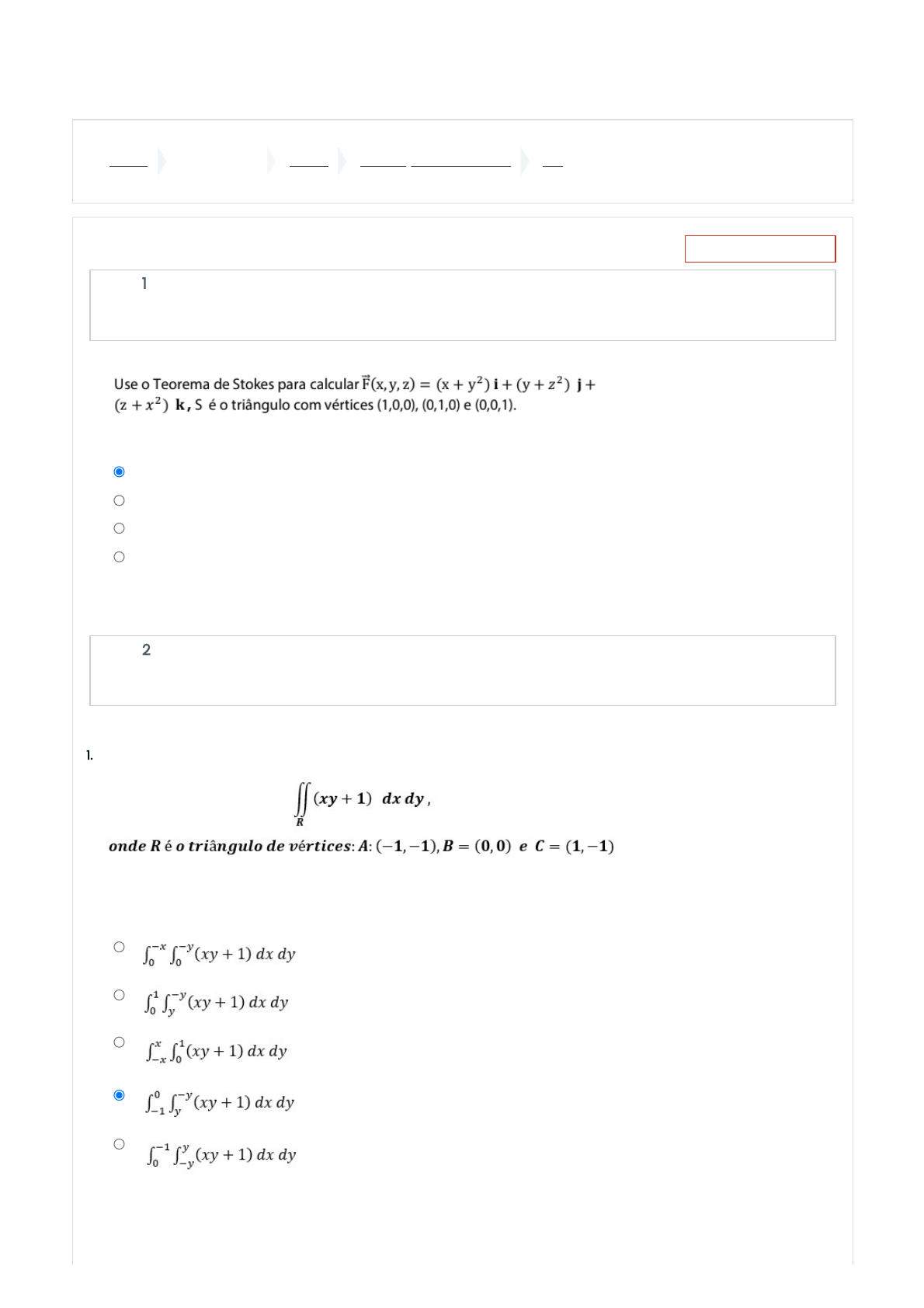 18/05/2021 A1P https://moodle.universo.edu.br/mod/quiz/attempt.php?attempt=158765&cmid=14183 1/5 Painel Meus cursos 1640E1 AVALIAÇÃO A DISTÂNCIA A1P Questão 1 Ainda não respondida Vale 1,00 ponto(s). Questão 2 Ainda não respondida Vale 1,00 ponto(s). Escolha uma opção: 1 23 13 3 Limpar minha escolha 1. Determine os limites de integração para se calcular o resultado da integral abaixo: Escolha uma opção: Limpar minha escolha Tempo restante 1:15:31 https://moodle.universo.edu.br/my/ https://moodle.universo.edu.br/course/view.php?id=909 https://moodle.universo.edu.br/course/view.php?id=909#section-3 https://moodle.universo.edu.br/mod/quiz/view.php?id=14183 18/05/2021 A1P https://moodle.universo.edu.br/mod/quiz/attempt.php?attempt=158765&cmid=14183 2/5 Questão 3 Ainda não respondida Vale 1,00 ponto(s). Questão 4 Ainda não respondida Vale 1,00 ponto(s). 1. Resolvendo a integral tripla abaixo, obtemos: Escolha uma opção: 27/3 28/3 26/3 8 26/4 Limpar minha escolha 1. Assinale a opção que corresponde a um Campo Vetorial NÃO conservativo: Escolha uma opção: Limpar minha escolha 18/05/2021 A1P https://moodle.universo.edu.br/mod/quiz/attempt.php?attempt=158765&cmid=14183 3/5 Questão 5 Ainda não respondida Vale 1,00 ponto(s). Questão 6 Ainda não respondida Vale 1,00 ponto(s). Calcule: -9/8 9/8 -8/9 7/8 8/9 Limpar minha escolha O resultado da integral de linha Onde a curva C é a parte superior da circunferência unitária x + y = 1 é : Escolha uma opção: 2 Pi 5Pi /2 2Pi + 2/3 2 Pi 3 Pi Limpar minha escolha 2 2 18/05/2021 A1P https://moodle.universo.edu.br/mod/quiz/attempt.php?attempt=158765&cmid=14183 4/5 Questão 7 Ainda não respondida Vale 1,00 ponto(s). Questão 8 Ainda não respondida Vale 1,00 ponto(s). Escolha uma opção: 8/7 2/6 1/25 13/2 17/8 Limpar minha escolha O resultado da integral dupla abaixo é: Escolha uma opção: 6 -4 2 0 8 Limpar minha escolha 18/05/2021 A1P https://moodle.universo.edu.br/mod/quiz/attempt.php?attempt=158765&cmid=14183 5/5 Questão 9 Ainda não respondida Vale 1,00 ponto(s). Questão 10 Ainda não respondida Vale 1,00 ponto(s). É correto afirmar que : Escolha uma opção: É possível determinar o centro de massa de um sistema de partículas através das integrais triplas. A integral de linha de um campo conservativo, depende da trajetória que une dois pontos A e B O Teorema de Green estabelece uma ligação entre as integrais de linha e as integrais triplas. O Teorema de Stokes relaciona uma integral de superfície S com uma integral dupla. Para calcular a área de uma região plana D, limitada por uma ou mais curvas, realizamos o cálculo de uma integral dupla. Limpar minha escolha Escolha uma opção: Limpar minha escolha Atividade anterior ◄ A1F - Fórum I Seguir para... Próxima atividade A2F - Fórum 2 ► https://moodle.universo.edu.br/mod/forum/view.php?id=14182&forceview=1 https://moodle.universo.edu.br/mod/forum/view.php?id=15602&forceview=1