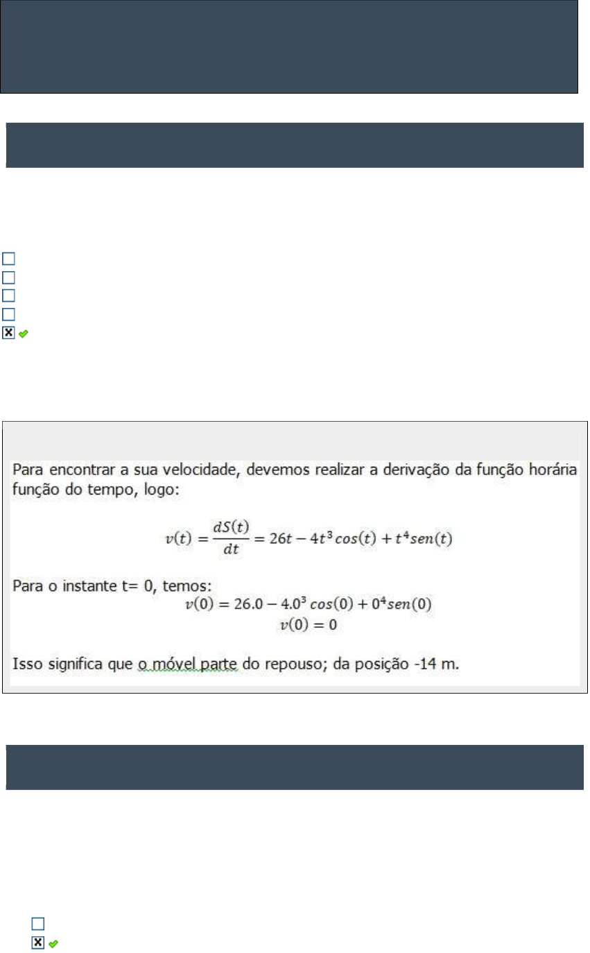 S(t)=-14 +13t2 -t4.cos(t). Qual a sua velocidade no instante t=0? Considere as unidades no SI.