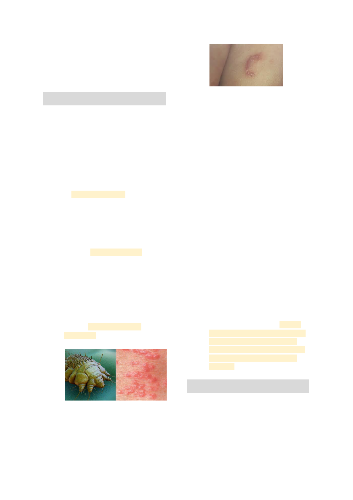 . Dermat�si� Zooparasitaria� . Po�: An� Carolin� Lim�/ @accarol� . Escabi�si� . ↳ Agente etiologico: Sarcoptes Scabiei; ↳ Etiologia: el Sarcoptes Scabiei variación Hominis, hembra, penetra en la piel y luego provoca una erupción prurítica que tiene una distribución característica; ↳ Epidemiologia: ● Distribución universal ● Ocurre en forma endémica con brotes epidémicos ● El contacto directo es la fuente de la infestación ● Portar o manipular ropas contaminadas, hacinamiento, contacto sexual ↳ Patogenia: la hembra al ser fertilizada perfora la capa córnea de la piel labrando túnel (surcos acarinos) donde deposita sus huevos (3 o 4 al día), estos huevos eclosionan, formando larvas inmaduras que abandonan la madriguera, salen a la superfície, copulan y continúan el ciclo; ↳ Cuadro Clínico: ● Prurito intenso y nocturno ● Ex. Físico: la lesión inicial suele ser una pequeña pápula escoriada con una costra hemática ● Surco Acarino: línea delgada, 2 a 5 mm ↳ Diagnósticos Diferenciales: prúrigo, eczemas, impétigo, foliculitis; ↳ Sarna Costrosa o Noruega: ● Abundantes costras cuyas capas se encuentran llenas de ácaros ● Prurito leve o ausente ● Se distribuye en todo el tegumento ● Se observa en ancianos debilitados, inmunodeprimidos, sx. de down y personas con escasos hábitos de higiene ↳ Complicaciones: ● Impetiginización: impétigo, ectima, paroniquia, forúnculo, erisipela, etc. ● Eczematización: constante rascado, drogas irritantes o sensibilizantes ↳ Tratamiento: ● Debe ser dirigido ➜ desparasitar el paciente y los convivientes (con o sin síntomas), medidas de higiene (ropas y lecho del paciente), evitar el contagio, tratamiento de la sintomatología y de las infecciones secundarias ● Tratamiento específico: principales fármacos ➜ azufre precipitado 2-6% en pomada o pastas, permetrina 5% y ivermectina 200 mcg/kg: VO 2 tomas con intervalo de 1 semana . Pedicul�si� . ↳ Agente etiologico: Pediculus humanos (Pediculus H. Capitis, Pediculus H. Corporis, Pediculus H. Pubis) ● Pediculus Capitis ↳ Epidemiología: es la más común, afecta más a las mujeres principalmente las más jóvenes, de edad escolar. ↳ Patogenia: el insecto mide entre 1 a 3 mm y tiene partes de su boca adaptadas para chupar y partes de su patas adaptadas para asirse a los cabellos, la hembra deposita sus huevos (liendres) que se adhieren firmemente al tallo piloso del huésped, estos huevos liberan ninfas que maduran en 1 semana, se vuelven adultos y pasan a se alimentar con voracidad en cuero cabelludo y zonas adyacentes; se localizan más en la región occipital ↳ Cuadro Clínico: ● Prurito intenso, a cualquier hora del día, en cuero cabelludo, cuello y orejas ● Pioderma persistente alrededor de cuello y oreja ● Ganglios linfáticos cervicales y de nuca aumentados de tamaño ● Episodios febriles asociados ● Presencia de liendres ↳ Tratamiento: Lindano al 1%, benzoato de bencilo al 10%, cepillado vigoroso del cabello, tratamiento colectivo ● Pediculus Pubis (ladilla) ↳ Epidemiología: frecuente predilección por zonas genitales velludas, axilas, barba, cejas y pestañas. El contagio se da por relación sexual o ropas de cama contaminadas ↳ Cuadro Clínico: ● Prurito muy intenso ● Excoriación ● Impetiginización ● Eczematización secundaria ● Ex Físico: máculas azul pizarra roseola cerulea y los parásitos y liendres ↳ Tratamiento: lindano al 1%, crotamiton 10 %, HCH ● Pediculus Corporis Pediculosis de los vestidos ↳ Epidemiología: poco frecuente en medios civilizados con condiciones adecuadas de higiene ↳ Patogenia: el ag. etiológico vive y deposita sus huevos en las costuras de las ropas, allí se desarrolla y acude a la piel solo para alimentarse ↳ Tratamiento: hervido y planchado caliente de ropas, benzoato de bencilo al 20 % . Larv� Migran� . Agente Etiológico: Ancylostoma↳ Brazilenses ↳ Etiología: infestación de la piel por larvas del A. brazilensis del perro y gato ↳ Epidemiología: se adquiere en zonas húmedas (jardines, playas) ↳ Cuadro Clinico: ● Pápula de prolongación lineal que describe ángulos y curvas en la epidermis ● Prurito y pinchazos dolorosos intensos en el trayecto de la lesión ● Impetiginización ↳ Tratamiento: tiabendazol (oral y local), cloruro de etilo, nitrógeno líquido . Miasi� . ● Cutánea Alteración que determina el desarrollo de larvas en la piel ↳ Agentes Etiologicos: dípteros (moscas tropicales), nematodes (gusanos) ● Forunculoide ↳ Cuadro Clínico: lesiones en forma de cúpula con abertura pequeña central en forma de cráter que emana una secreción purulenta, la larva tiende a salir por dicha abertura ● Cavitaria y de las heridas ↳ Cuadro Clínico: las larvas se localizan en cavidades (fosas nasales, oído externo) y heridas mal cuidadas, estas larvas invaden en profundidad y destruyen tejidos (músculos, cartílagos, huesos) ↳ Tratamiento: extracción, ivermectina . Tungiasi� . ↳ Agente Etiológico: Tunga Penetrans (niguas) ↳ Etiología: el bicho penetra por plantas, bordes, pies y dedos ↳ Cuadro Clínico: ● Prurito intenso ● La lesión se asemeja a una vesícula, con límites netos, al retirar deja cavidad y gran cantidad de huevos (si se rompe) ↳ Tratamiento: retirar el parásito, ATB ↳ Complicaciones: infección secundaria contaminación por C. tetani