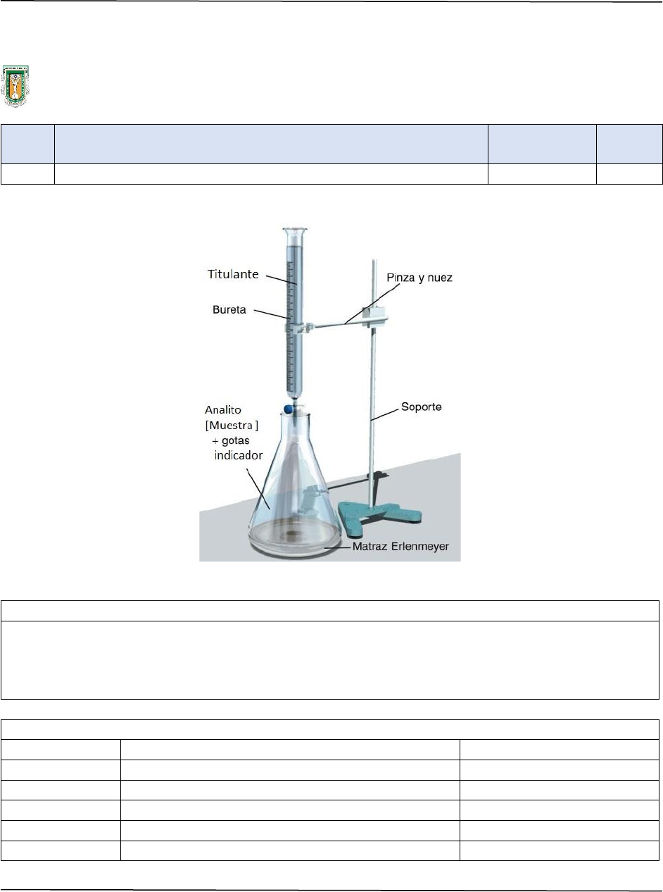 Manual-16207-LAQC LABORATORIO DE ANALISIS QUIMICO CUANTITATIVO (16207) Reporte de Práctica de Laboratorio No. TÍTULO DE LA PRÁCTICA: Fecha: Form a P-3 CURVA DE TITULACIÓN POTENCIOMÉTRICA ÁCIDO-BASE 30-04-2021 F-03 COMPETENCIA: Elaborar una curva de titulación potenciométrica para determinar el punto de equivalencia en una reacción ácido-base, empleado muestras problema. Experimento realizado por: MATRICULA NOMBRE FIRMA 1273534 Dueñas Medina Paola Fernanda 0295731 Flores Zapotl Gladiz Berenisse 1272095 Martínez Valle Juan Javier 1272369 Mercado Espinoza Sofia Ximena 1274279 Sanchez Osorio Daniel Guadalupe Manual-16207-LAQC FUNDAMENTOS La titulación potenciométrica se realiza cuando no es posible la detección del punto final de una valoración empleando un indicador visual. Uno de los métodos más exactos, porque el potencial sigue el cambio real de la actividad y, el punto final coincide directamente con el punto de equivalencia. (1) Las ventajas del método potenciométrico son su aplicabilidad a disoluciones turbias, fluorescentes, opacas, coloreadas o no se puedan obtener indicadores visuales adecuados. (1) La titulación potenciométrica consiste en medir el potencial (voltaje) en una solución por medio de un electrodo como función de volumen de agente titulante. El potencial que se mide se puede transformar a unidades de concentración de una especie en solución (2) Titulación ácido-base La titulación o valoración es un procedimiento para determinar la concentración de una disolución mediante otra de concentración conocida, denominada disolución patrón. Para ello se consideran tres tipos de reacciones: valoraciones que incluyen un ácido y una base fuertes, valoraciones que incluyen un ácido débil y una base fuerte y valoraciones que incluyan un ácido fuerte y una base débil. Las valoraciones en las que participan un ácido y una base débiles son más complicadas porque hay hidrólisis tanto del catión como del anión de la sal formada. (3) La reacción entre el HCl, un ácido fuerte, y el NaOH, una base fuerte, se representa por: Antes de agregar el NaOH, el pH de la disolución ácida está dado por el –log (0.1), es decir un pH igual a 1. Cuando se agrega NaOH, al principio, el pH aumenta muy poco. Sin embargo, cerca del punto de equivalencia, el pH comienza a aumentar más rápido y en el punto de equivalencia (es decir, el punto en el cual han reaccionado cantidades equimolares del ácido y de la base), la curva sube casi verticalmente. En una valoración entre un ácido y una base fuertes, las concentraciones de los iones hidrógeno e hidróxido son muy pequeñas en el punto de equivalencia (alrededor de 1 x 10-7 M); por consiguiente, la adición de una sola gota de base puede ocasionar un gran incremento de [OH-] y del pH de la disolución. Más allá del punto de equivalencia, el pH vuelve a aumentar lentamente con la adición de NaOH. Es posible calcular el pH de la disolución Manual-16207-LAQC en cada punto de la valoración si conocemos las concentraciones de las soluciones que están reaccionando. (3) Valoraciones ácido débil- base fuerte Considere la reacción de neutralización entre el ácido acético (un ácido débil) y el hidróxido de sodio (base fuerte): El ion acetato se hidroliza de la siguiente forma: Por tanto, en el punto de equivalencia, cuando sólo hay iones acetato, el pH será mayor que 7 debido al exceso de iones OH- formados. (3) La reacción de neutralización es: ECUACIÓNES QUÍMICAS INVOLUCRADAS EN EL EXPERIMENTO a) Reacción de un Ácido fuerte (analito) con una base fuerte (titulante) HCl + NaOH NaCl + H2O Manual-16207-LAQC b) Reacción de un Ácido débil (analito) con una base fuerte (titulante) CH3 + COOH CH3COONa + H2O c) Reacción del indicador ácido-base con el titulante DATOS Y RESULTADOS OBTENIDOS DEL EXPERIMENTO Muestra utilizada en el análisis: HCl Volumen de la muestra, Vmuestra: -- Volumen de la alícuota, Valicuota: 100 mL HCl 0.1 M Factor de dilución (FD): --- Molaridad del NaOH, mol/L: CM, NaOH = 0.1 M DATOS OBTENIDOS EN EL EXPERIMENTO Y DETERMINACIÓN DEL PUNTO FINAL DE LA TITULACIÓN POTENCIOMÉTRICA (nota: HCl) Medición Lectura bureta, mL Vol de NaOH adicionado, mL pH Primera derivada Segunda derivada Vinici al Vfinal V´NaO H, mL ∆𝑝 𝐻 ∆𝑉 V´´NaO H, mL ∆𝑝𝐻 ∆ ( ∆𝑉 ) ∆𝑉´ 0 0 0 0 1 5 0.009 10 0 1 0 10 10 1.09 15 0.009 20 0 2 10 20 20 1.18 25 0.009 30 0.0001 Manual-16207-LAQC 3 20 30 30 1.27 35 0.01 40 0.001 4 30 40 40 1.37 45 0.11 50 0.001 5 40 50 50 1.48 55 0.011 60 0.0004 6 0 10 60 1.6 65 0.015 70 0.0003 7 10 20 70 1.75 75 0.02 80 0.0013 8 20 30 80 1.95 85 0.033 88.75 0.0038 9 30 40 90 2.28 92.5 0.062 94.5 0.0185 10 40 45 95 2.59 96.5 0.136 97.5 0.082 11 45 48 98 3 98.5 0.3 98.8 0.333 12 48 49 99 3.3 99.1 0.5 99.2 0.5 13 49 49.2 99.2 3.4 99.3 0.6 99.4 1.5 14 49.2 49.4 99.4 3.52 99.5 0.9 99.6 -4 15 49.4 49.6 99.6 3.7 99.7 0.1 99.775 19.333 16 49.6 49.8 99.8 4 99.85 3 99.8875 42.8571 17 49.8 49.9 99.9 4.3 99.92 6 99.95 840 18 49.9 49.95 99.95 4.6 99.97 48 100 0 19 49.95 50 100 7 100.02 48 100.05 -840 20 50 50.05 100.0 5 9.40 100.07 6 100.112 5 -37.5 21 50.05 50.1 100.1 9.7 100.15 3 100.225 -10 22 50.1 50.2 100.2 10 100.3 1.5 100.45 -2.5 23 50.2 50.4 100.4 10.3 100.6 0.75 100.75 -833 24 50.4 50.8 100.8 10.6 100.9 0.5 101.2 -0.333 25 50.8 51 101 10.7 101.5 0.3 102.5 -0.085 26 51 52 102 11 103.5 0.13 105.5 -0.02 27 52 55 105 11.3 9 107.5 0.05 111.25 -0.004 28 55 60 110 11.6 8 115 0.02 122.5 -0.0006 29 60 70 120 11.9 6 130 0.01 30 70 90 140 12.2 2 Manual-16207-LAQC GRAFICAS DE LA TITULACIÓN POTENCIOMÉTRICA a) Grafica normal (VNaOH, pH) b) Grafica de la primera derivada (V´NaOH, mL, ∆𝑝𝐻 ∆𝑉 ) 0 2 4 6 8 10 12 14 0 20 40 60 80 100 120 140 160 p H Volumen de NaOH Curva de Titulación 0 10 20 30 40 50 60 0 20 40 60 80 100 120 140 (∆ 𝑝 ^𝐻 )/ ∆ 𝑉 Volumen de NaOH Primera Derivada Manual-16207-LAQC c) Grafica de la segunda derivada (V´´Na