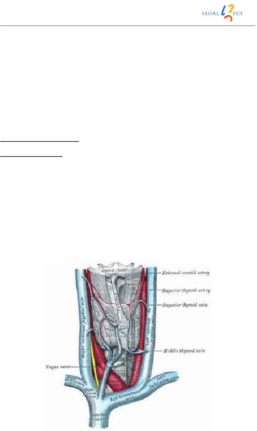 los nervios recurrentes y con las glándulas paratiroides, que el cirujano debe conocer con