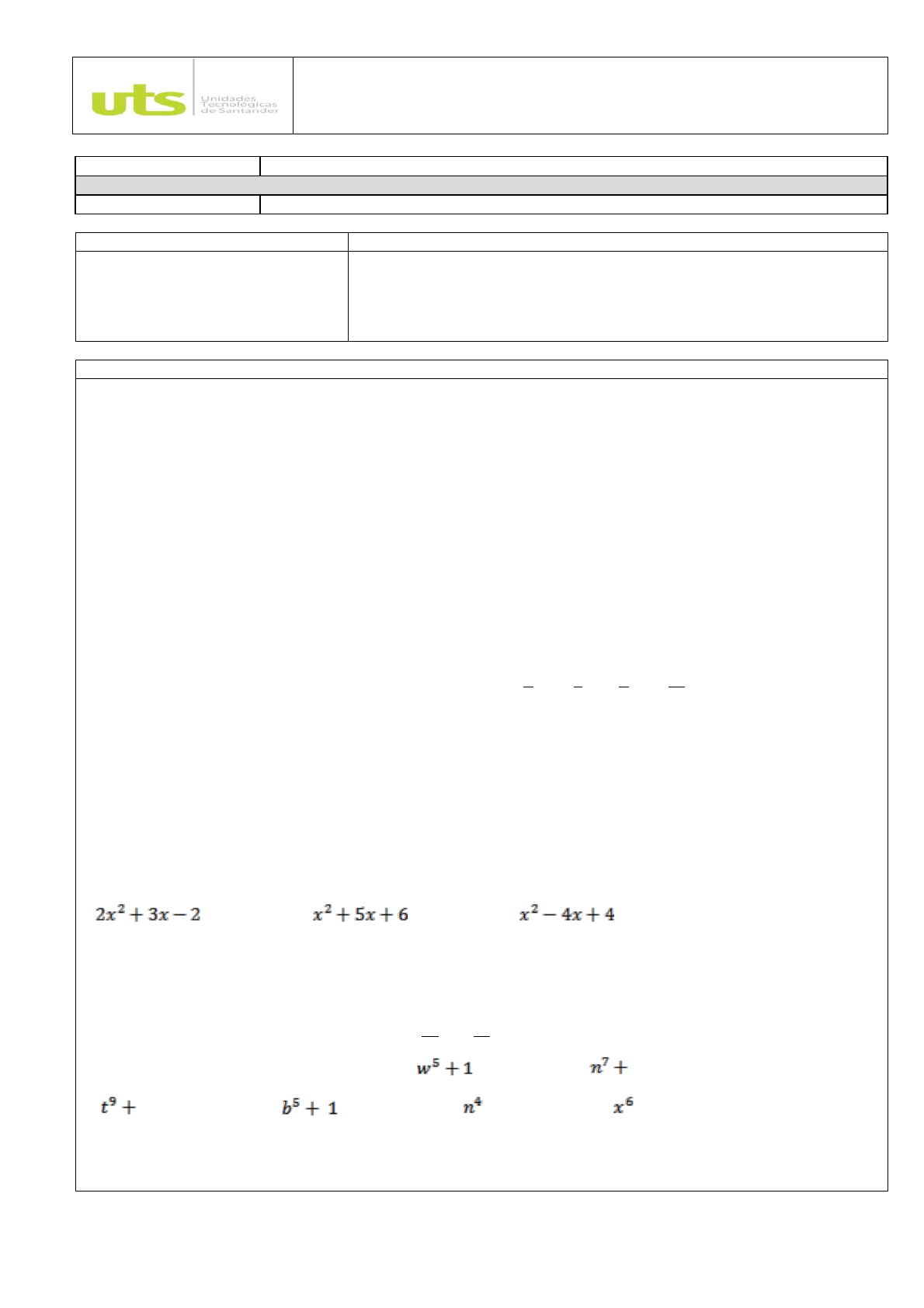 UNIDADES TECNOLÓGICAS DE SANTANDER GUÍA DE ESTUDIO No. 4 DEPARTAMENTO DE CIENCIAS BÁSICAS I - 2014 UNIDAD ACADÉMICA DEPARTAMENTO DE CIENCIAS BASICAS ASIGNATURA: MATEMATICA BASICA UNIDAD TEMÁTICA FACTORIZACIÓN COMPETENCIA RESULTADOS DE APRENDIZAJE Interpretar la factorización como la descomposición de expresiones algebraicas en sus factores primos y su aplicación en áreas como Cálculo y Algebra superior Interpreta el concepto de factorización y como se efectúa. Establece diferencias entre los casos más comunes de factorización. Resuelve situaciones problema relacionadas con factorización de expresiones algebraicas.. ACTIVIDADES DE APRENDIZAJE Realizar las actividades que a continuación se enuncian teniendo en cuenta los conceptos y procedimientos desarrollados en clase y tomando como material de apoyo el documento Apuntes del Docente el cual pude encontrar en el blog de la asignatura (utsmatematicabasica.blogspot.com). ACTIVIDAD 1 1. Factorizar las siguientes expresiones algebraicas usando los casos de factor común (factor común monomio, factor común binomio y factor común por agrupación). Compruebe sus respuestas en el simulador del blog de asignatura. a) 10x 2 y - 15xy 2 + 25xy b) a(2 + x ) - ( 2 + x ) c) (2x + 3 )( 3 - r ) - (2x - 5 )( 3 - r ) d) 3a - b 2 + 2b 2 x - 6ax e) ( a 2 + 1 ) - b (a 2 + 1 ) f) 12m 2 n + 24m 3 n 2 - 36m 4 n 3 g) a 3 + a 2 + a + 1 h) a(2 - x ) - ( x- 2 ) i) 2 8 4 16 3 3 5 5 a m a n bm bn 2. Factorizar las siguientes expresiones algebraicas usando los casos de trinomios. a) b 2 - 12b + 36 b) 4a 2 + 5a + 1 c) 3y 2 - 5y – 2 d) r 2 - 12r + 27 e) 7x 2 - 44x – 35 f) 16m 2 - 40mn + 25n 2 g) 6x 4 + 5x 2 – 6 h) 9 b 4 + 37b 2 + 4 i) 9 b 4 + 37b 2 + 4 j) k) l) 3. Factorizar las siguientes expresiones algebraicas usando los casos de binomios: a) 9a 2 - 25b 2 b) 64x 3 – 1000 c) 44 16 9 25 1 yx d) 8y 3 + 125 e) 4x 2 – 1 f) (x+1) 3 – 8 g) h) 128 i) 1 j) 243 k) 1- 16 l) 64 - UNIDADES TECNOLÓGICAS DE SANTANDER GUÍA DE ESTUDIO No. 4 DEPARTAMENTO DE CIENCIAS BÁSICAS I - 2014 4. Factorizar totalmente las siguiente expresiones algebraicas. a) 2a 5 - 162 a 3 b) 8y 2 – 18 c) x 2 (x 2 -1) -9(x 2 -1) d) x 3 +3x 2 -x-3 e) x 4 +5x 3 +7x 2 +5x+6 f) x 4 +x 3 -xy 3 -y 3 g) h) i) 64 + 0.125 ACTIVIDAD 2 2. Si V representa el volumen, hallar la arista de cada cubo 1 V= B V= EVALUACIÓN 1 RAMIREZ Marisol, SALAZAR Francia, JOYA ANNERIS, CELY Valeria, matemáticas, Santillana, 2006 UNIDADES TECNOLÓGICAS DE SANTANDER GUÍA DE ESTUDIO No. 4 DEPARTAMENTO DE CIENCIAS BÁSICAS I - 2014 1. Factorizar las siguientes expresiones algebraicas: 2 2. Se tiene una piscina rectangular de área x 2 - 12x + 35 como se muestra en la figura. ¿Cuáles son las dimensiones de sus lados? ¿Cuál es su perímetro? 3 .Determina las dimensiones de cada paralelepípedo a partir de su volumen. 3 a. b. + 49 4. Factorizar los siguientes polinomios: 2 BARNETT Raymond, Algebra Primera Edicion, Mc. Graw Hill, 1984 3 RAMIREZ Marisol, SALAZAR Francia, JOYA ANNERIS, CELY Valeria, matemáticas, Santillana, 2006 Área = x2 - 12x + 35 UNIDADES TECNOLÓGICAS DE SANTANDER GUÍA DE ESTUDIO No. 4 DEPARTAMENTO DE CIENCIAS BÁSICAS I - 2014 -5) – BIBLIOGRAFÍA APUNTES DEL DOCENTE LARSON /HOSTETLER, Algebra, México, Mc Graw Hill, 1999 ZILLl, Dennis G, Algebra y trigonometría, 2da edición, Mc. Graw Hill, 1996 BARNETT Raymond, Algebra Primera Edicion, Mc. Graw Hill, 1984 RAMIREZ Marisol, SALAZAR Francia, JOYA ANNERIS, CELY Valeria, matemáticas, Santillana, 2006