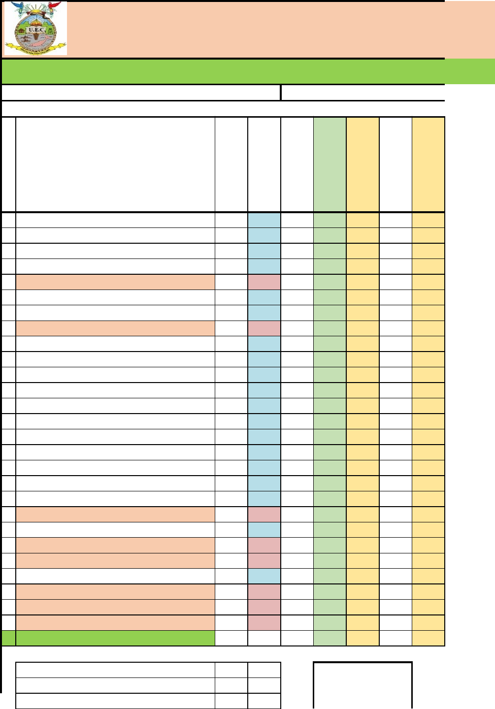 1RO VENTAS "A" UNIDAD EDUCATIVA "CUYABENO" CÓDIGO AMIE. 21H00751 PERIODO LECTIVO 2020-2021 CUADRO DE NOTAS CORRESPONDIENTE AL PRIMER QUIMESTRE POR ASIGNATURA DOCENTE: Lic. Johanna Bastidas ASIGNATURA: QUÍMICA CURSO: 1ERO BT VENTAS E INFORMACIÓN TURÍSTICA "A" N° NÓMINA Primer parcial Segundo parcial Suma 2 parciales Promedio Promedio sobre 80% EXAMEN 1 ER QUIMESTRE Exámen sobre 20%. Nota Quimestral Nota Cualitativa 1 BRIONES FLORES ALISSON SIARE 7.59 4.75 12.34 6.17 4.94 5.00 1.00 5.94 P.A.A.R 2 CALLE MOLIDA YOLANDA DELFINA 0.00 4.50 4.50 2.25 1.80 0.00 0.00 1.80 N.A.A.R 3 CEDEÑO QUISIRUMBAY MARIA BELEN 8.73 10.00 18.73 9.37 7.49 10.00 2.00 9.49 D.A.R 4 CORDONES DIAZ CYNTHIA ESTEFANIA 8.65 7.25 15.90 7.95 6.36 7.00 1.40 7.76 A.A.R 5 FERNANDEZ MACAS VERONICA MARIBEL 3.75 0.00 3.75 1.88 1.50 0.00 0.00 1.50 N.A.A.R 6 GONZALEZ LOMBEIDA VIVIANA SELENA 7.95 4.00 11.95 5.98 4.78 5.00 1.00 5.78 P.A.A.R 7 GUATATOCA CHANGO RICARDO NEHEMIAS 5.66 0.00 5.66 2.83 2.26 0.00 0.00 2.26 N.A.A.R 8 HUANCA TORRES EVERSON JOEL 0.00 0.00 0.00 0.00 0.00 0.00 0.00 0.00 N.A.A.R 9 JIMENEZ ABAD NEISER ARLEY 7.25 1.75 9.00 4.50 3.60 3.00 0.60 4.20 P.A.A.R 10 JISMA CHUNCHO ALEX GABRIEL 8.18 10.00 18.18 9.09 7.27 7.00 1.40 8.67 A.A.R 11 LOPEZ ANGULO AMY NAARA 9.98 10.00 19.98 9.99 7.99 10.00 2.00 9.99 D.A.R 12 MAYANCHA VILLACIS VICTORIA NORA 7.02 7.25 14.27 7.14 5.71 10.00 2.00 7.71 A.A.R 13 MOLINA ENCARACION EMILY JAHILING 8.95 10.00 18.95 9.48 7.58 9.00 1.80 9.38 D.A.R 14 MORA ALVAREZ JENNIFFER KATHERIN 9.09 9.50 18.59 9.30 7.44 8.00 1.60 9.04 D.A.R 15 MOROCHO FERNANDEZ MADELEN DALILA 6.70 8.50 15.20 7.60 6.08 5.00 1.00 7.08 A.A.R 16 NOTENO ALVARADO EMILY JAJAIRA 9.55 6.75 16.30 8.15 6.52 10.00 2.00 8.52 A.A.R 17 PALMA RENGIFO BRISA MAYTE 9.08 10.00 19.08 9.54 7.63 10.00 2.00 9.63 D.A.R 18 PAREDES CAMPOVERDE MAITE ANAHI 9.50 7.25 16.75 8.38 6.70 5.00 1.00 7.70 A.A.R 19 QUIÑONEZ ROMERO SARA PRISCILA 9.45 10.00 19.45 9.73 7.78 7.50 1.50 9.28 D.A.R 20 REZABALA CEVALLOS WENDY YURIDIA 5.84 0.00 5.84 2.92 2.34 0.00 0.00 2.34 N.A.A.R 21 SUAREZ LEMA JEIMY BRITHNEY 0.00 0.00 0.00 0.00 0.00 0.00 0.00 0.00 N.A.A.R 22 TANGOY LUSITANDE JEISON CHARLY 0.00 0.00 0.00 0.00 0.00 0.00 0.00 0.00 N.A.A.R 23 TANGOY TANGUILA MARIA CLEMENCIA 0.00 0.00 0.00 0.00 0.00 0.00 0.00 0.00 N.A.A.R 24 TROYA YAGUACHI JELIXA MILENA 9.09 5.00 14.09 7.05 5.64 10.00 2.00 7.64 A.A.R 25 USHPA YUMA LADY BRIGITTE 6.52 0.00 6.52 3.26 2.61 0.00 0.00 2.61 N.A.A.R 26 UZHPA SANIMBIA JOSSELYN MISHELLE 0.00 0.00 0.00 0.00 0.00 0.00 0.00 0.00 N.A.A.R 27 VALENZUELA SANCHEZ LEYKER JAIR 9.73 0.00 9.73 4.87 3.89 0.00 0.00 3.89 N.A.A.R PROMEDIO 6.23 4.69 10.92 5.46 4.37 4.50 0.90 5.27 P.A.A.R ESCALA DE CALIFICACIÓN No. % LIC. JOHANNA BASTIDAS LIC.VINICIO ARELLANO D.A.R 9 -10 6 22.22 A.A.R 7 - 8,99 7 25.93 P.A.A.R 4,01 - 6,99 3 11.11 N.A.A.R 0,01 - 3,99 11 40.74 TOTAL 27 100.00 DOCENTE VICERECTOR ESCALA PORCENTAJE (%) D.A.R (9 -10) 22.22 A.A.R (7 - 8,99) 25.93 P.A.A.R (4,01 - 6,99) 11.11 N.A.A.R (0,01 - 3,99) 40.74 D.A.R (9 -10) PORCENTAJE (%) 22.22 A.A.R (7 - 8,99) PORCENTAJE (%) 25.93 P.A.A.R (4,01 - 6,99) PORCENTAJE (%) 11.11 N.A.A.R (0,01 - 3,99) PORCENTAJE (%) 40.74 1ERO VENTAS "B" UNIDAD EDUCATIVA "CUYABENO" CÓDIGO AMIE. 21H00751 PERIODO LECTIVO 2020-2021 CUADRO DE NOTAS CORRESPONDIENTE AL PRIMER QUIMESTRE POR ASIGNATURA DOCENTE: Lic. Johanna Bastidas ASIGNATURA: QUÍMICA CURSO: 1ERO BT VENTAS E INFORMACIÓN TURÍSTICA "B" N° NÓMINA Primer parcial Segundo parcial Suma 2 parciales Promedio Promedio sobre 80% EXAMEN 1 ER QUIMESTRE Exámen sobre 20%. Nota Quimestral Nota Cualitativa 1 ARBOLEDA GOMEZ KEILY JULIETH 2.21 6.38 8.59 4.30 3.44 5.00 1.00 4.44 P.A.A.R 2 ARMIJOS SUAREZ NOHELIA MYLEIDI 7.54 3.25 10.79 5.40 4.32 2.00 0.40 4.72 P.A.A.R 3 BERMEO VERDESOTO YADIRA NATHALY 8.58 0.00 8.58 4.29 3.43 0.00 0.00 3.43 N.A.A.R 4 CANON NIAZA LEIDY CAROLINA 7.38 0.00 7.38 3.69 2.95 0.00 0.00 2.95 N.A.A.R 5 JIMENEZ PASUY ANGI PAOLA 7.17 9.00 16.17 8.09 6.47 7.00 1.40 7.87 A.A.R 6 MERO OLMEDO SHIRLEY LIZBETH 9.33 7.25 16.58 8.29 6.63 1.00 0.20 6.83 P.A.A.R 7 NOTENO TANGOY LINCI SHAOH 6.13 0.00 6.13 3.07 2.45 0.00 0.00 2.45 N.A.A.R 8 PASUY JIMENEZ DIANA ISABEL 9.83 9.75 19.58 9.79 7.83 0.00 0.00 7.83 A.A.R 9 QUIÑONEZ REZABALA JESSICA JOMARA 6.50 3.88 10.38 5.19 4.15 4.00 0.80 4.95 P.A.A.R 10 QUIÑONEZ SUAREZ DARLYN BERLYN 4.10 0.00 4.10 2.05 1.64 0.00 0.00 1.64 N.A.A.R 11 QUIÑONEZ VERA JOSSELIN CAMILA 3.31 5.00 8.31 4.16 3.32 7.00 1.40 4.72 P.A.A.R 12 ROJAS MURILLO JENIFFER LIZBETH 5.56 9.50 15.06 7.53 6.02 9.00 1.80 7.82 A.A.R 13 SAAVEDRA ZAMBRANO VALESKA MAGDALE 0.00 0.00 0.00 0.00 0.00 0.00 0.00 0.00 N.A.A.R PROMEDIO 5.97 4.15 10.13 5.06 4.05 2.69 0.54 4.59 P.A.A.R ESCALA DE CALIFICACIÓN No. % LIC. JOHANNA BASTIDAS LIC.VINICIO ARELLANO D.A.R 9 -10 0 0.00 A.A.R 7 - 8,99 3 23.08 P.A.A.R 4,01 - 6,99 5 38.46 N.A.A.R 0,01 - 3,99 5 38.46 TOTAL 13 100.00 DOCENTE VICERECTOR ESCALA PORCENTAJE (%) D.A.R (9 -10) 0 A.A.R (7 - 8,99) 23.08 P.A.A.R (4,01 - 6,99) 38.64 N.A.A.R (0,01 - 3,99) 38.64 PORCENTAJE (%) D.A.R (9 -10) A.A.R (7 - 8,99) P.A.A.R (4,01 - 6,99) N.A.A.R (0,01 - 3,99) 0 23.08 38.64 38.64 2DO INFO "A" UNIDAD EDUCATIVA "CUYABENO" CÓDIGO AMIE. 21H00751 PERIODO LECTIVO 2020-2021 CUADRO DE NOTAS CORRESPONDIENTE AL PRIMER QUIMESTRE POR ASIGNATURA DOCENTE: Lic. Johanna Bastidas ASIGNATURA: QUÍMICA CURSO: 2DO B.T INFORMÁTICA "A" N° NÓMINA Primer parcial Segundo parcial Suma 2 parciales Promedio Promedio sobre 80% EXAMEN 1 ER QUIMESTRE Exámen sobre 20%. Nota Quimestral Nota Cualitativa 1 AGUILA VILLEGAS JHINGIRE JULEXSY 0.00 0.00 0.00 0.00 0.00 0.00 0.00 0.00 N.A.A.R 2 ANGULO YAGUACHI LLOED CALEB 6.67 5.40 12.07 6.04 4.83 8.00 1.60 6.43 P.A.A.R 3 ATZUTA CHUP DIANA JUDITH 8.00 6.00 14.00 7.00 5.60 4.00 0.80 6.40 P.A.A.R 4 ATZUTA CHUP RUBI MARICELA 7.08 0.00 7.08 3.54 2.83 0.00 0.00 2.83 N.A.A.R 5 AVEROS MALACATOS MERCY PAOLA 9.79 9.95 19.74 9.87 7.90 9.00 1.80 9.70 D.A.R 6 AVILA TENEZACA JOSE FRANCISCO 9.83 10.00 19.83 9.92 7.93 9.00 1.80 9.73 D.A.R 7 CALLE DIAZ NA